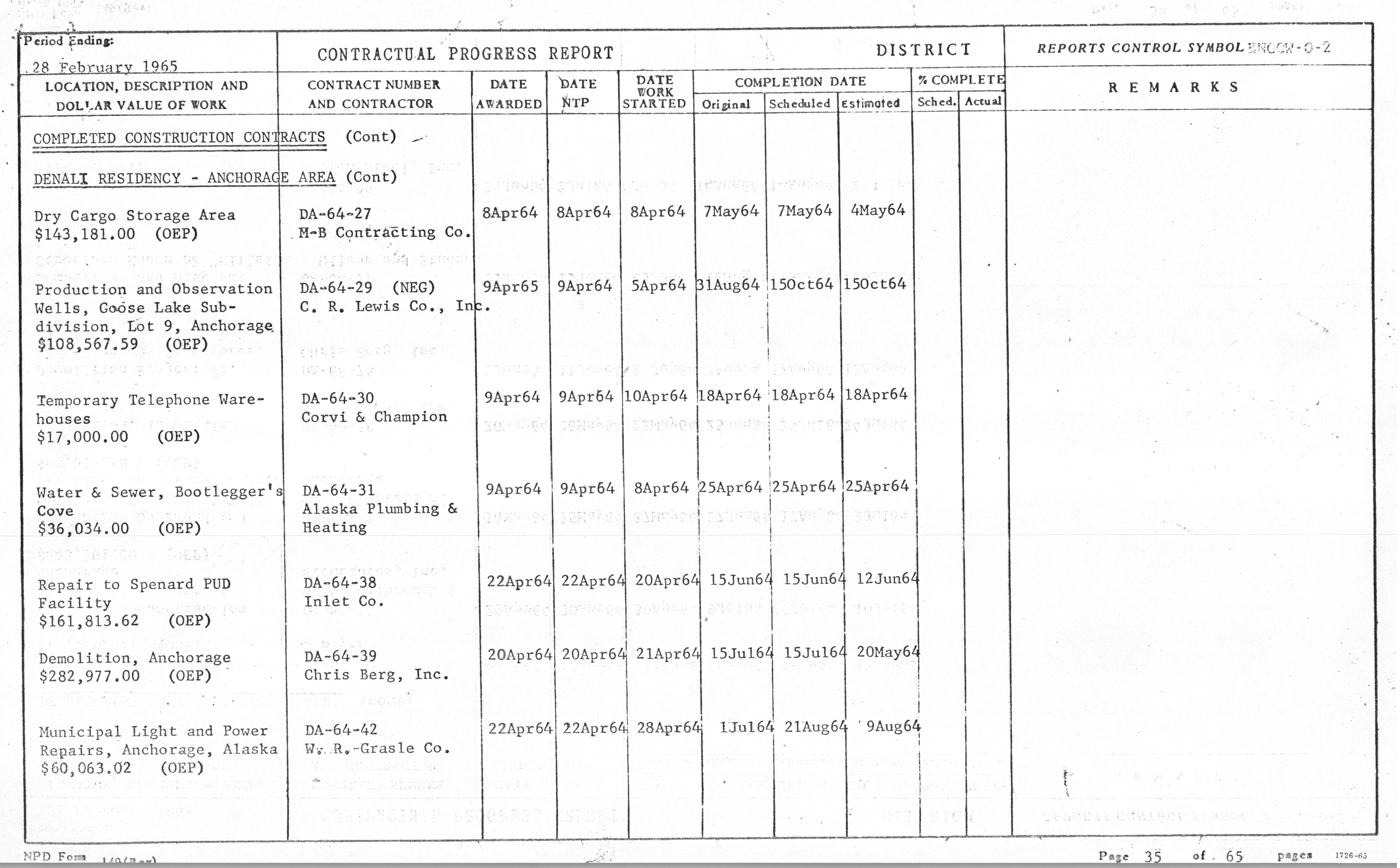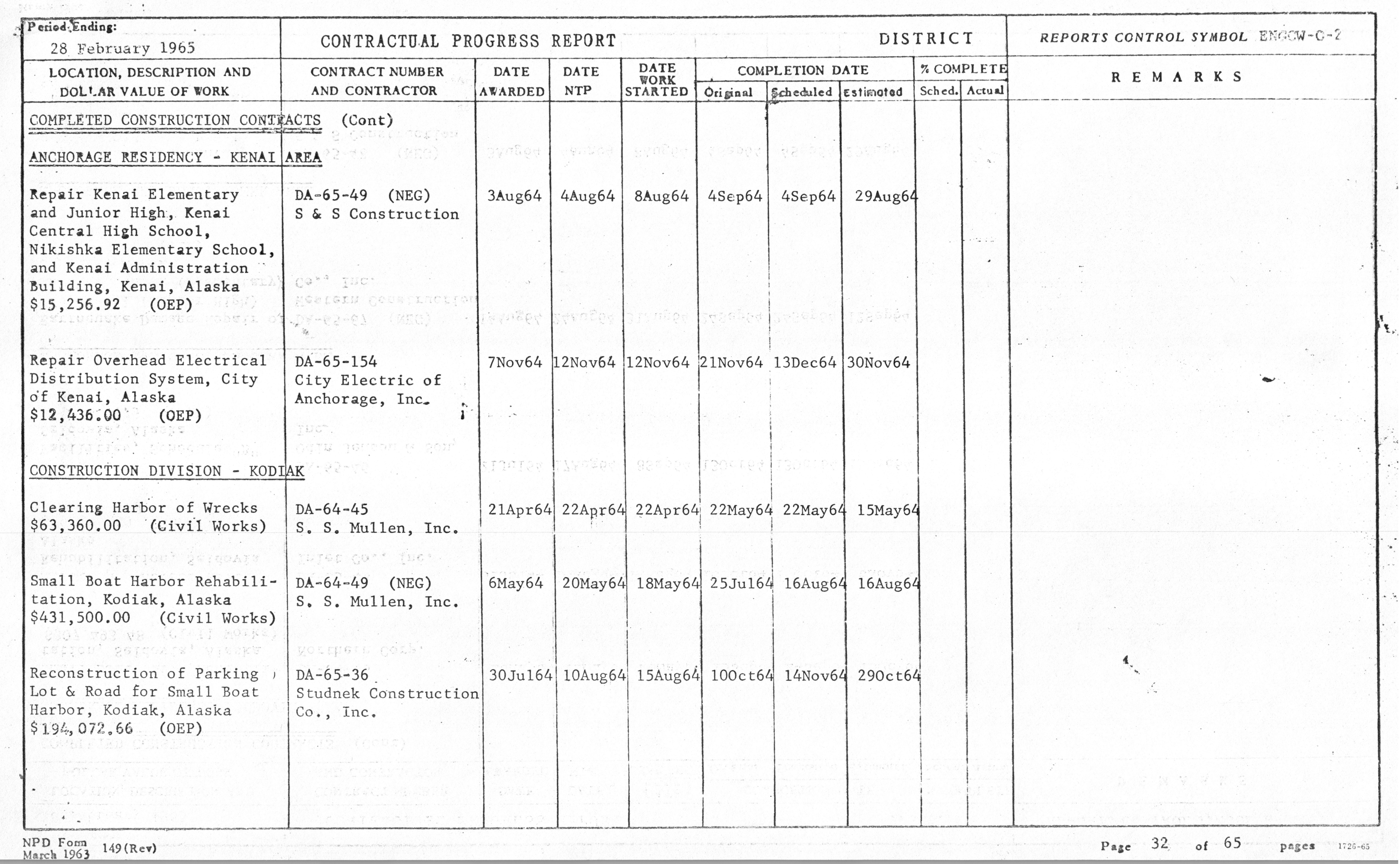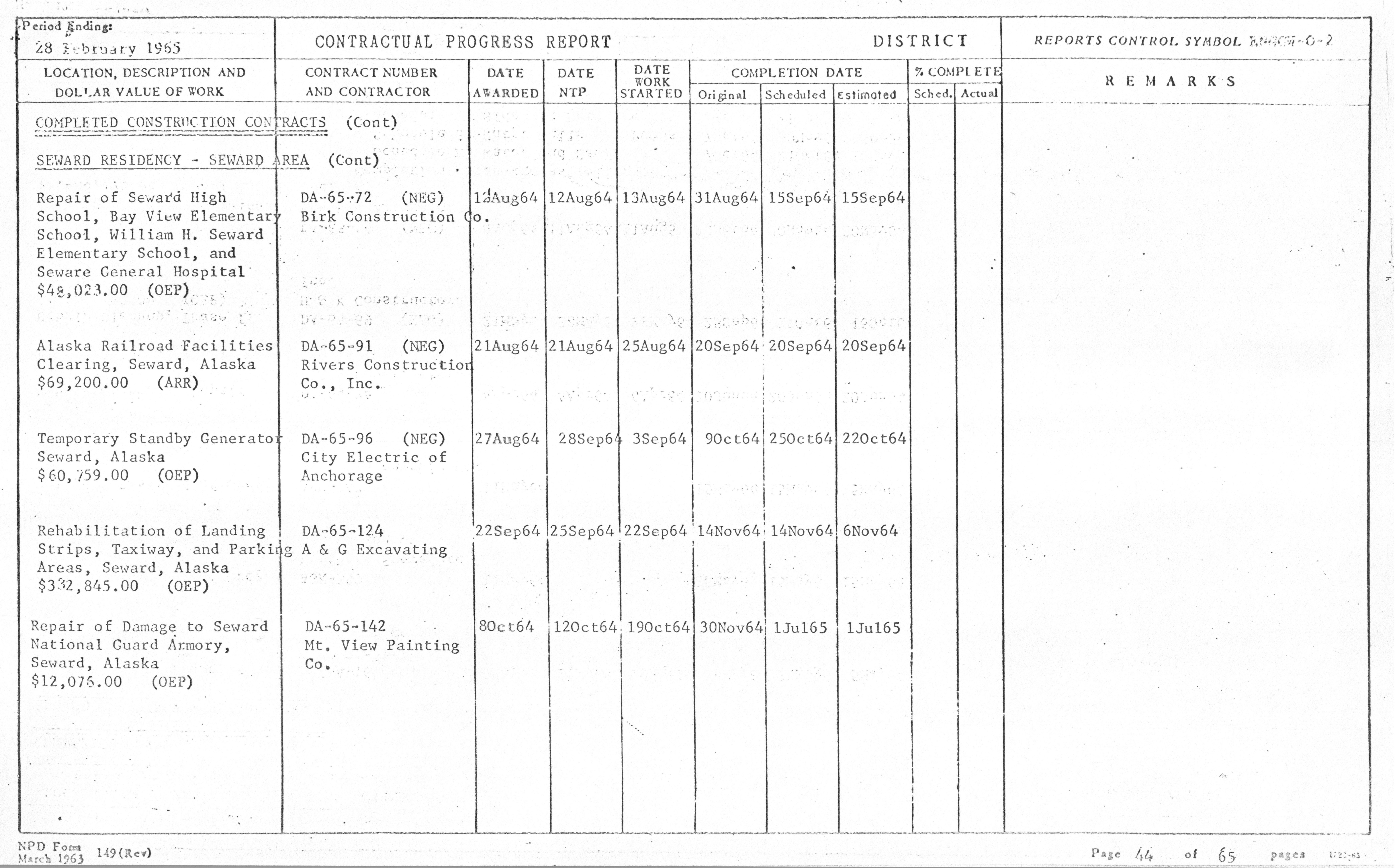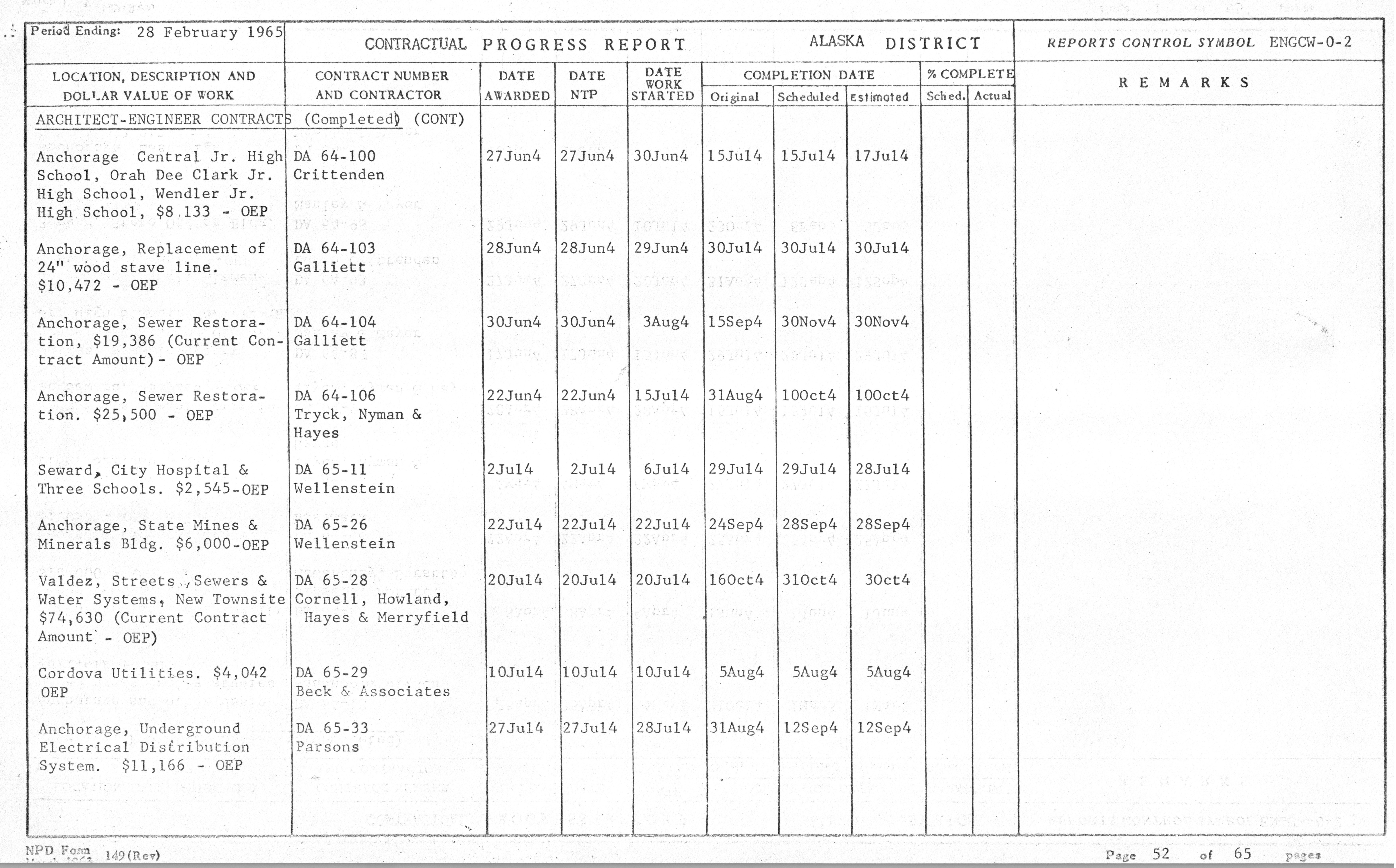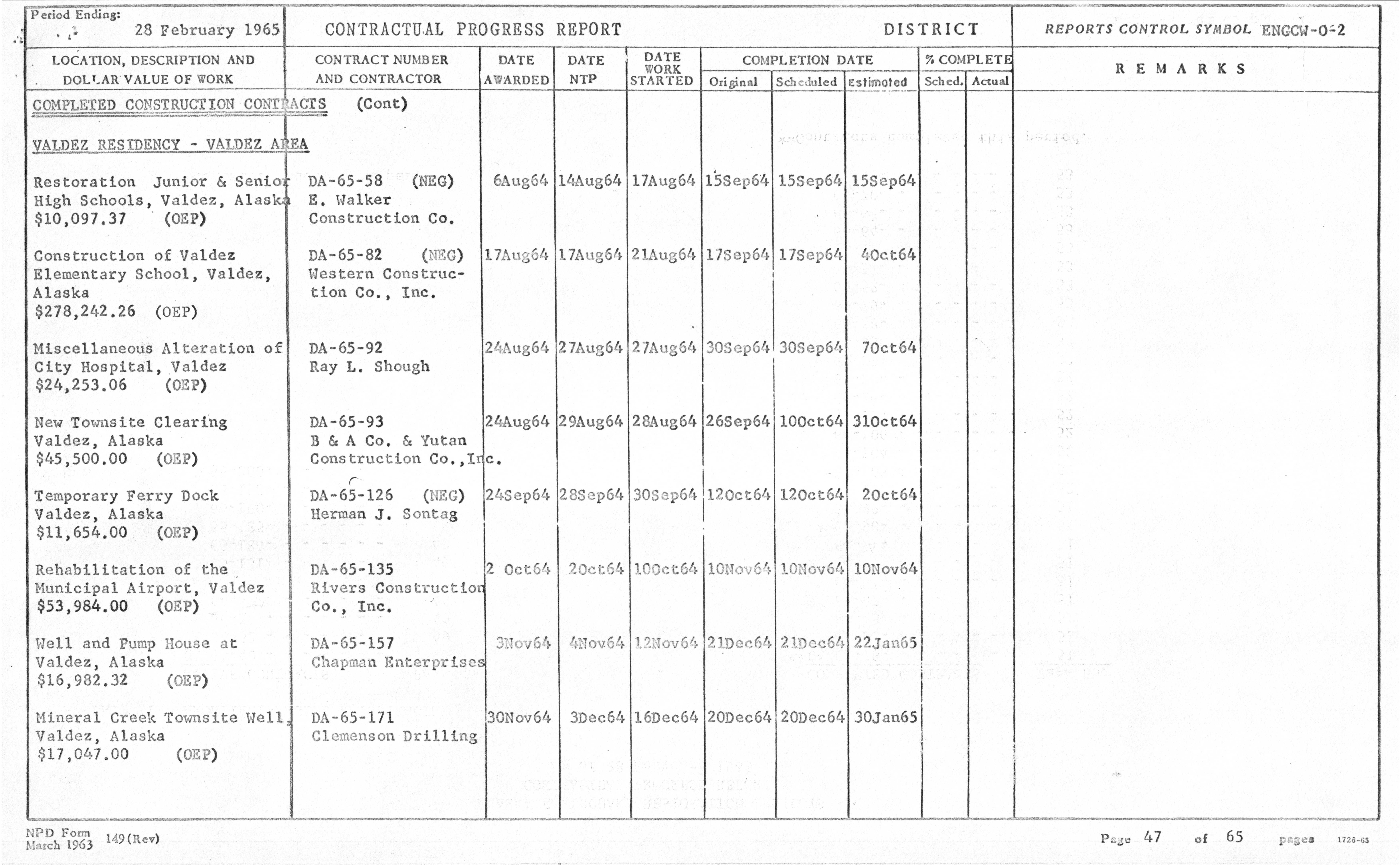 - "Alaska earthquake restoration projects contractual progress report, May 31, 1965", Dwight Ink Collection, Iowa State University Library Digital Collections