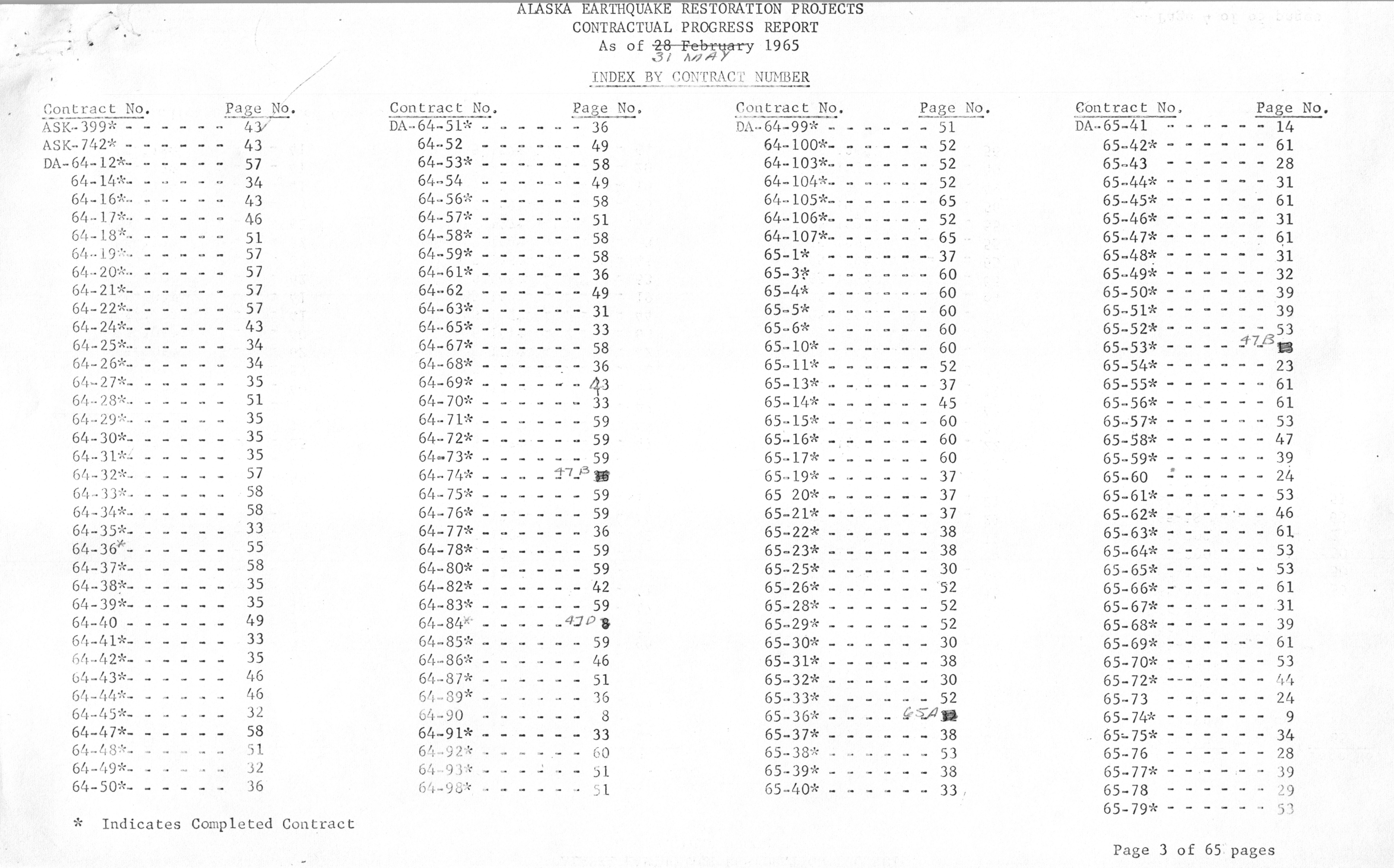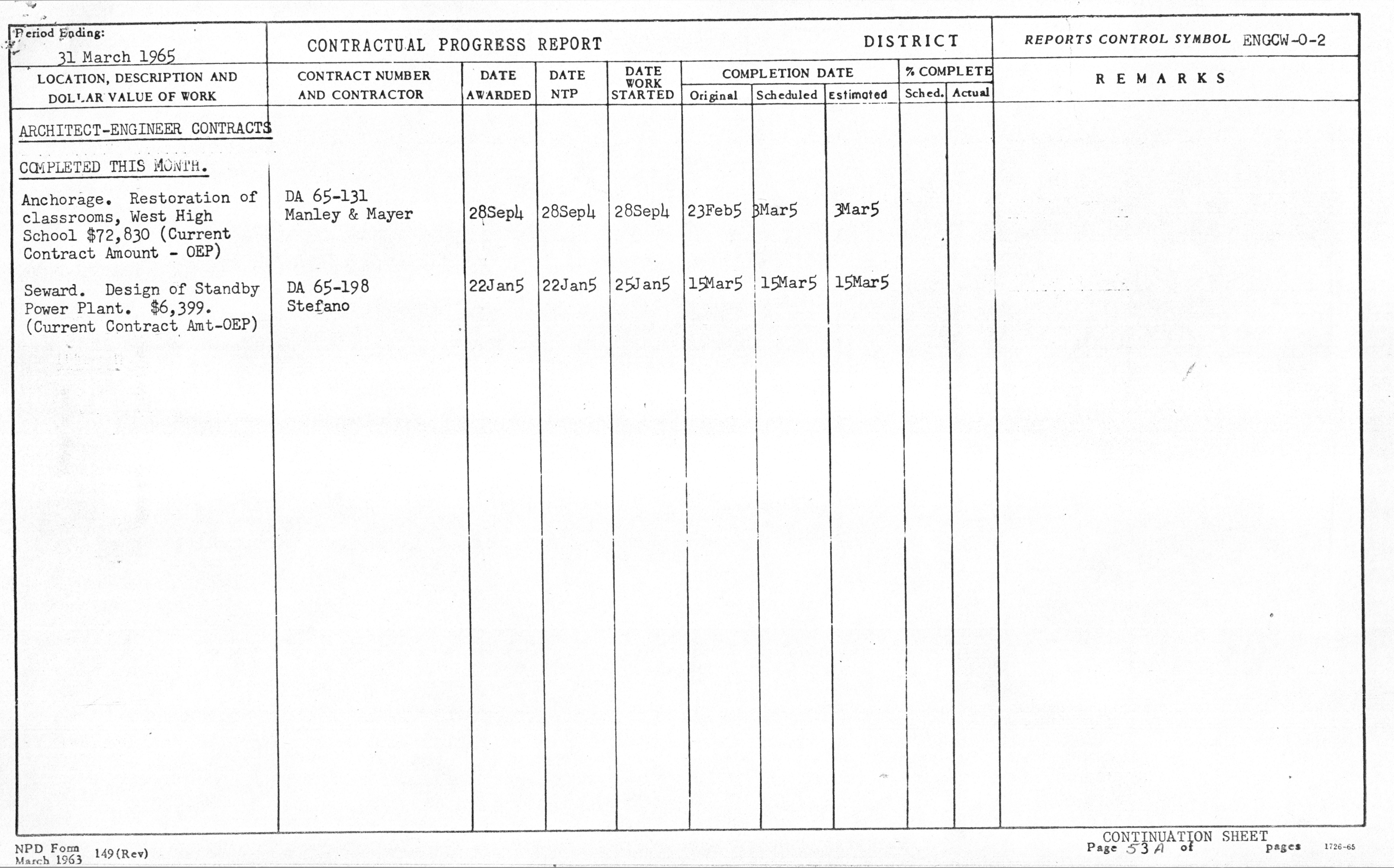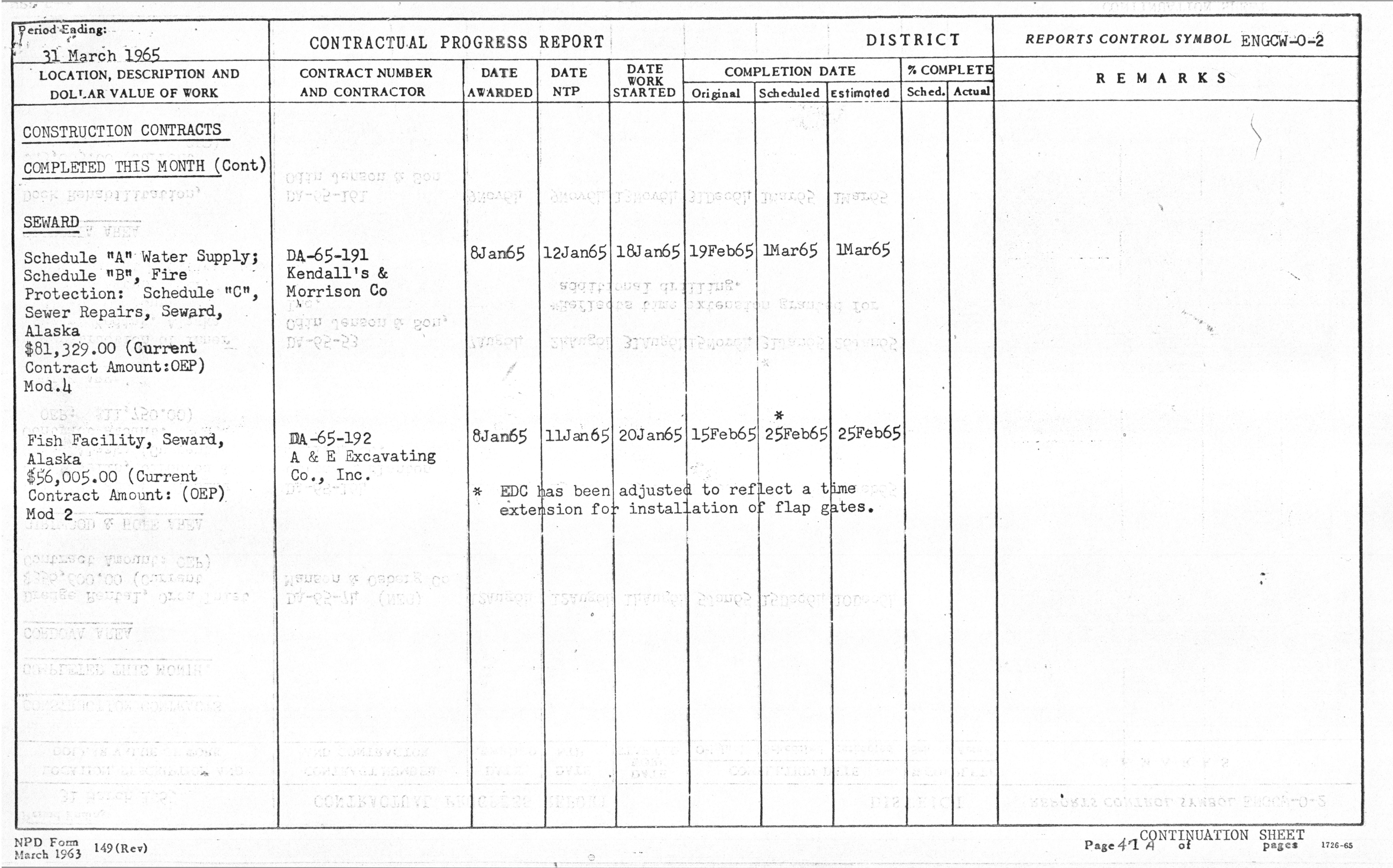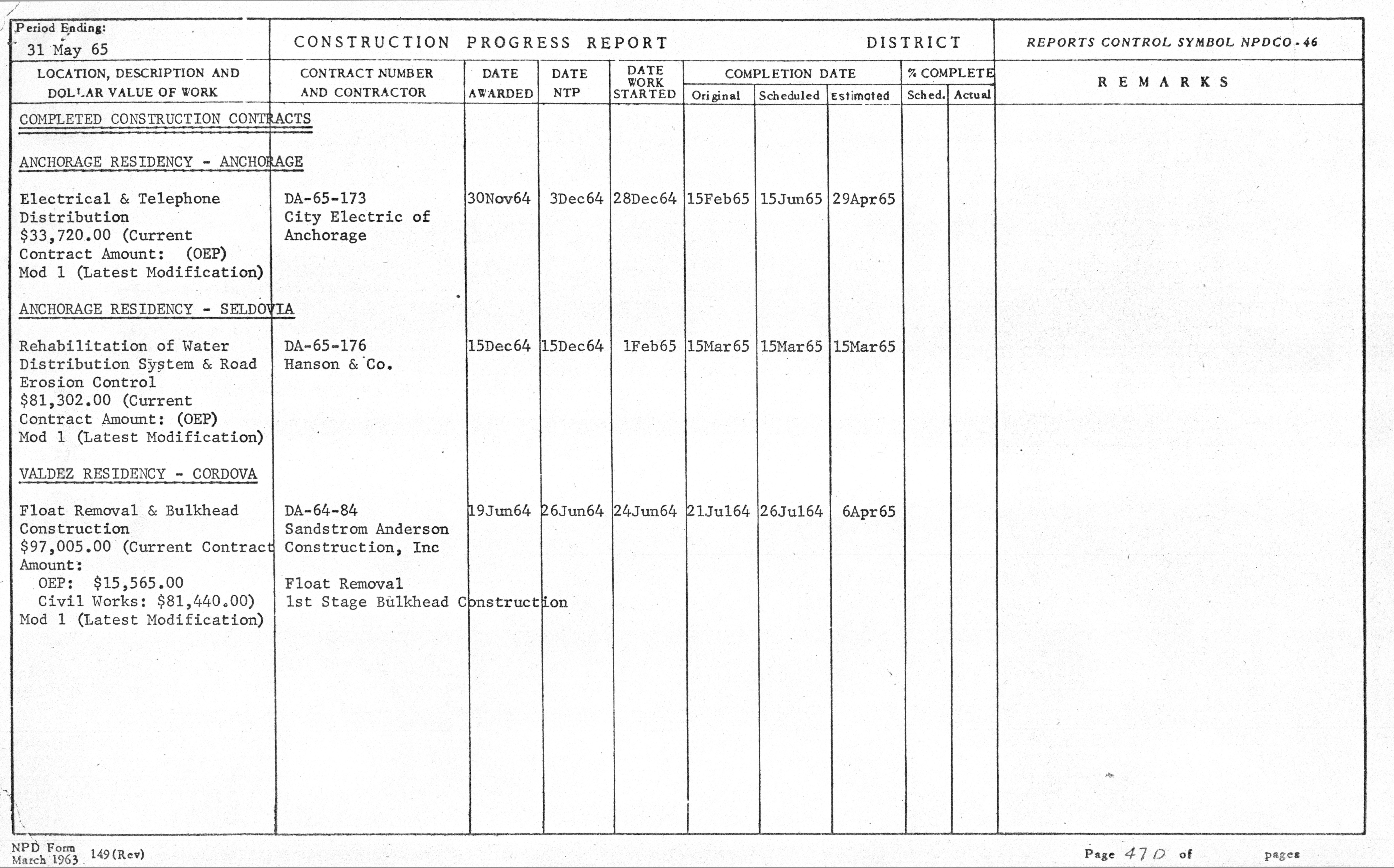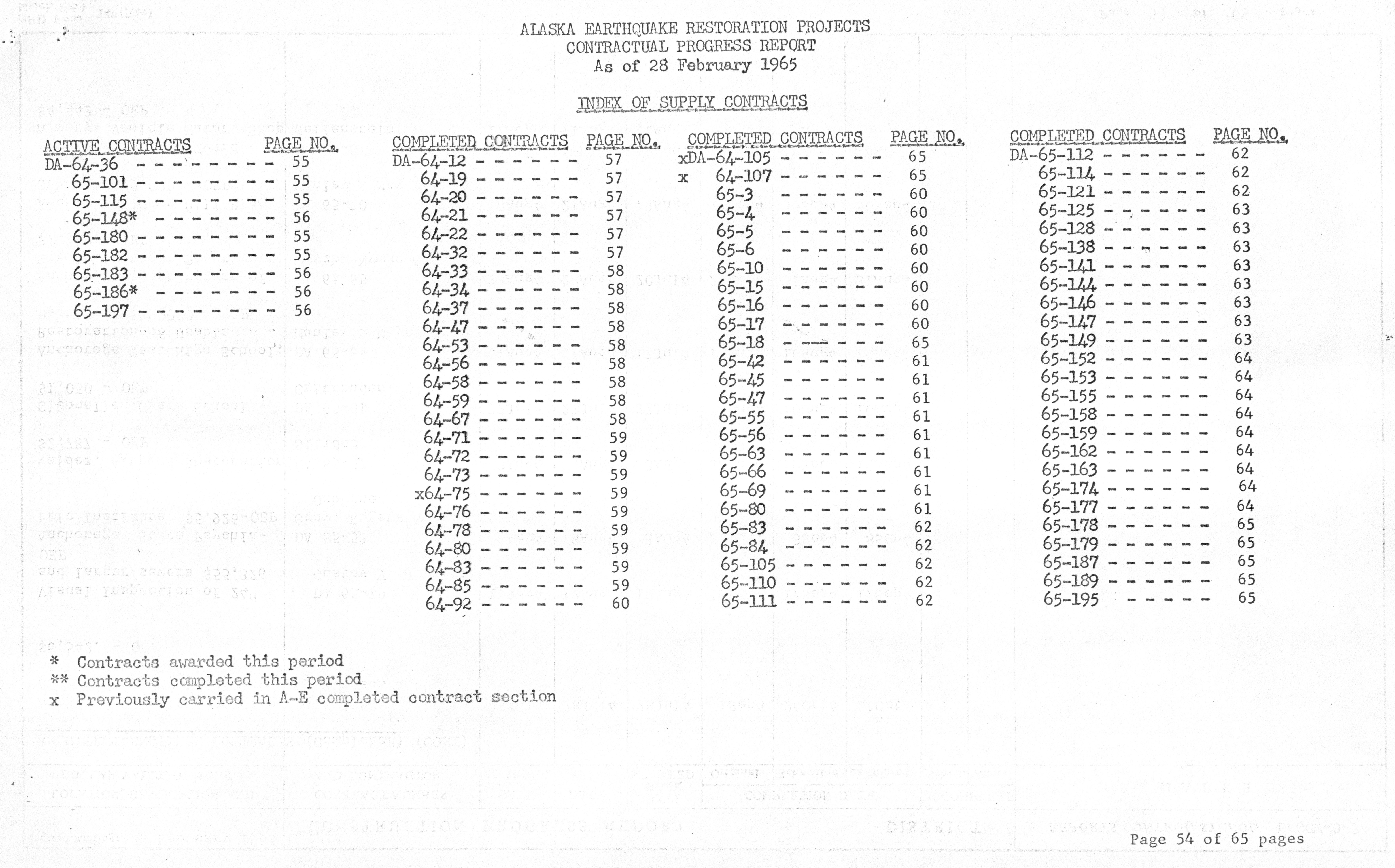 - "Alaska earthquake restoration projects contractual progress report, May 31, 1965", Dwight Ink Collection, Iowa State University Library Digital Collections