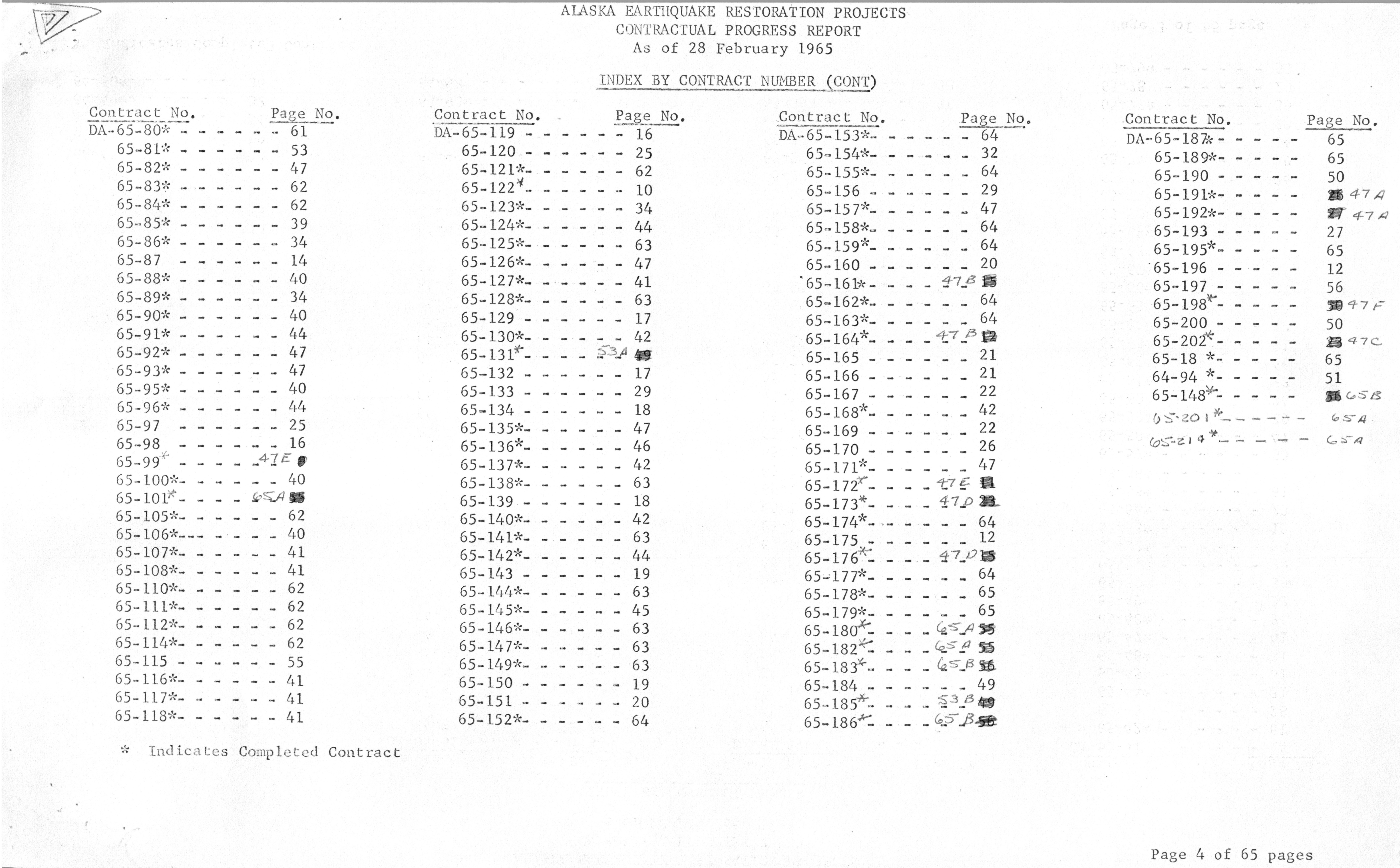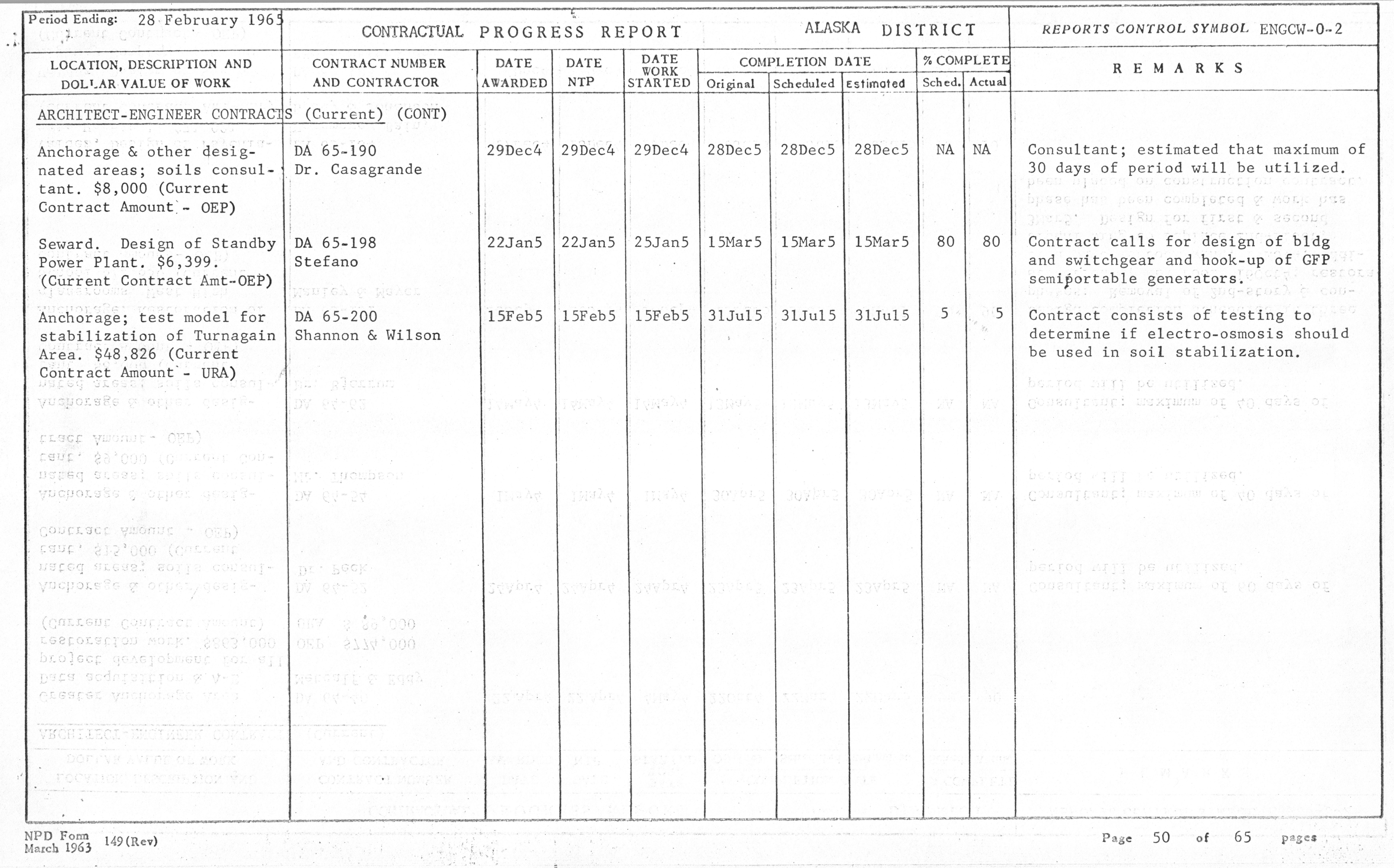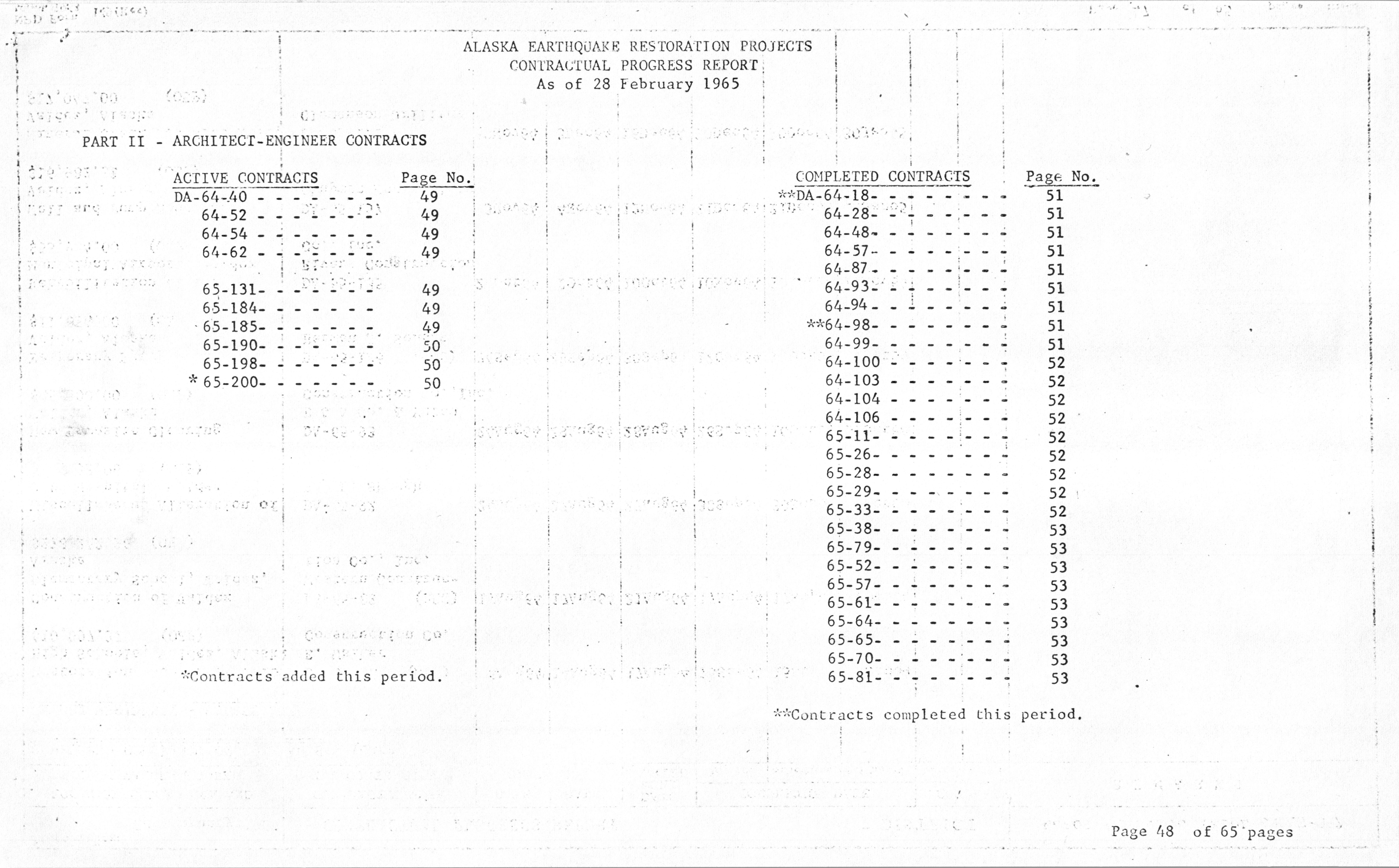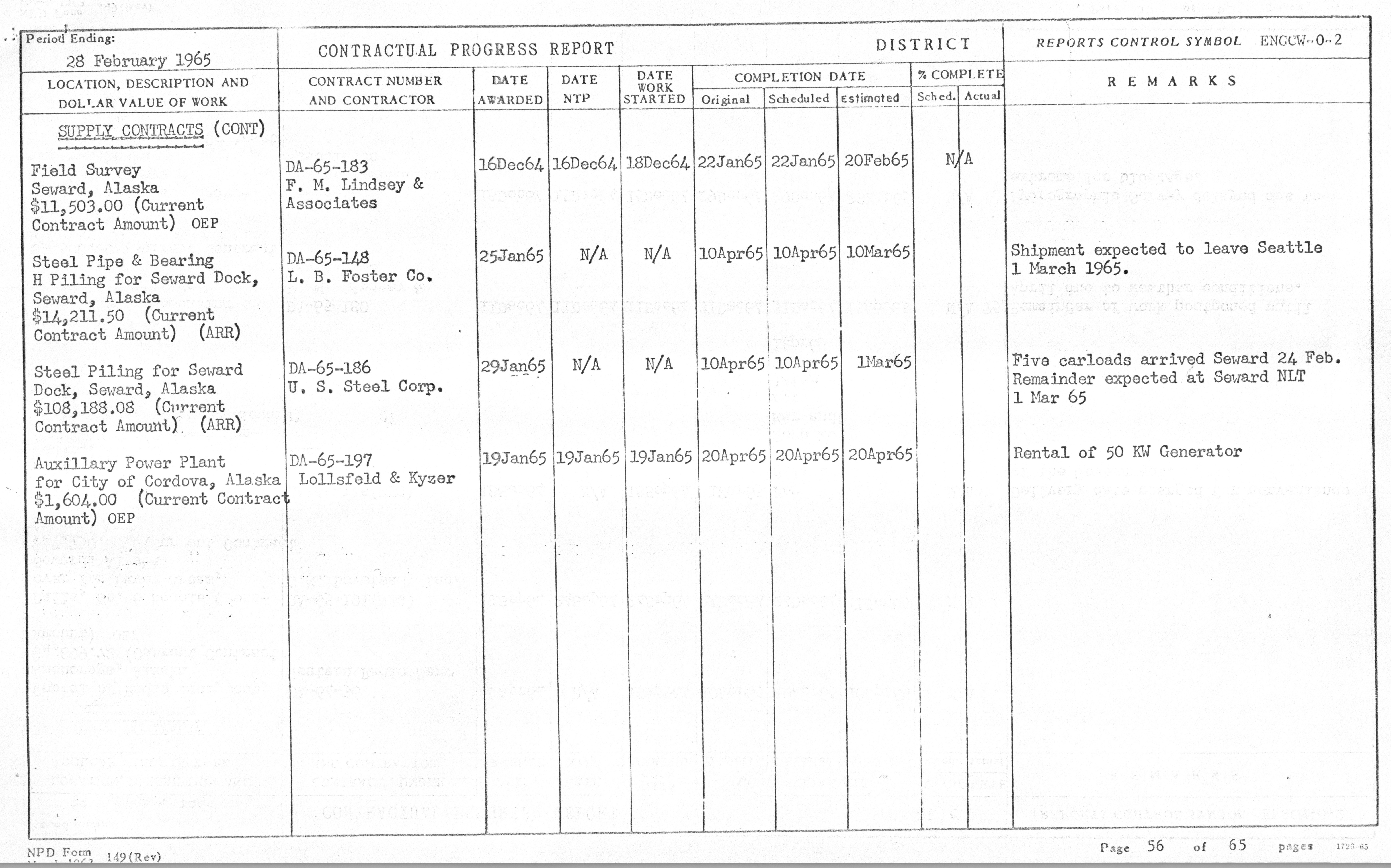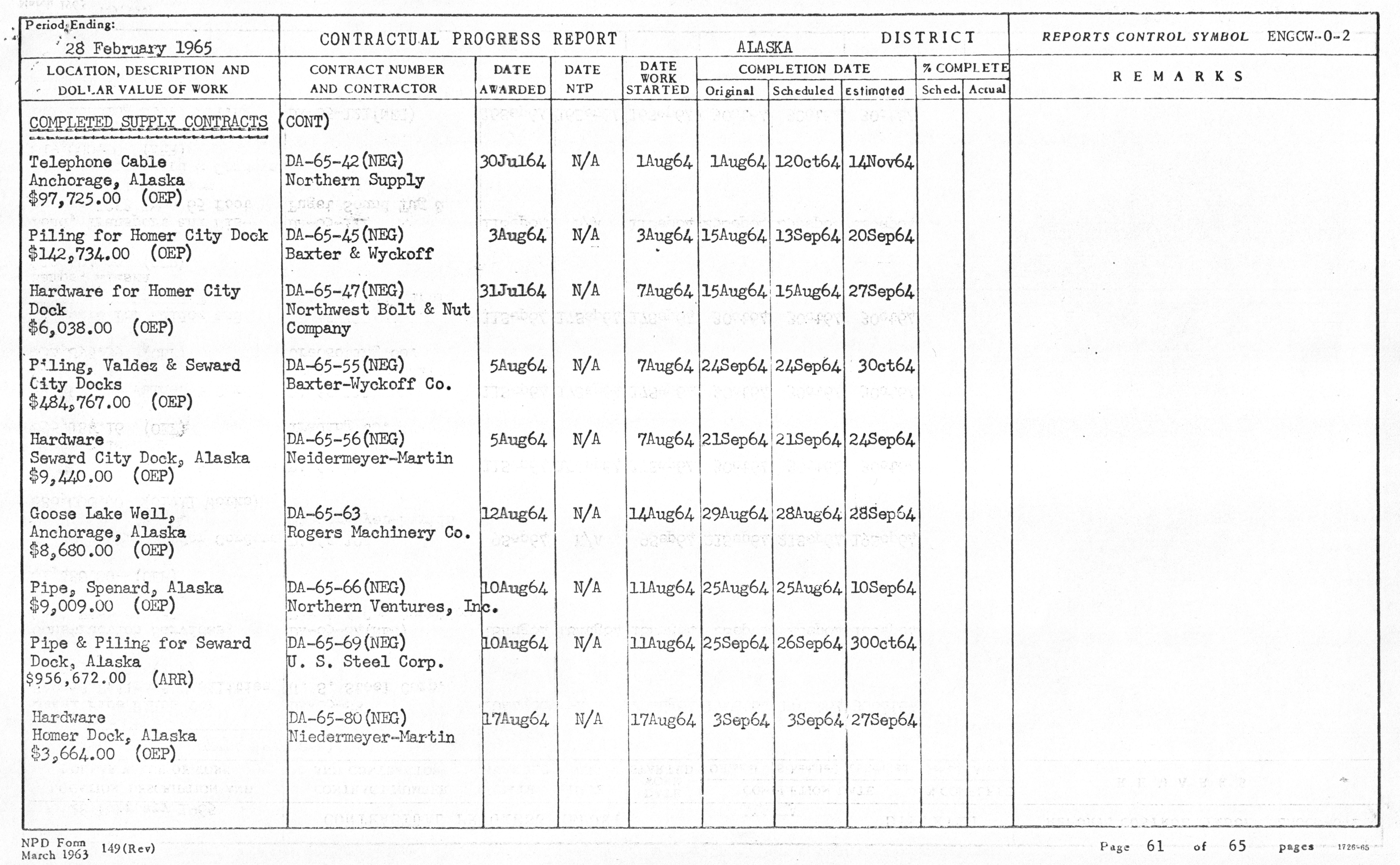 - "Alaska earthquake restoration projects contractual progress report, May 31, 1965", Dwight Ink Collection, Iowa State University Library Digital Collections