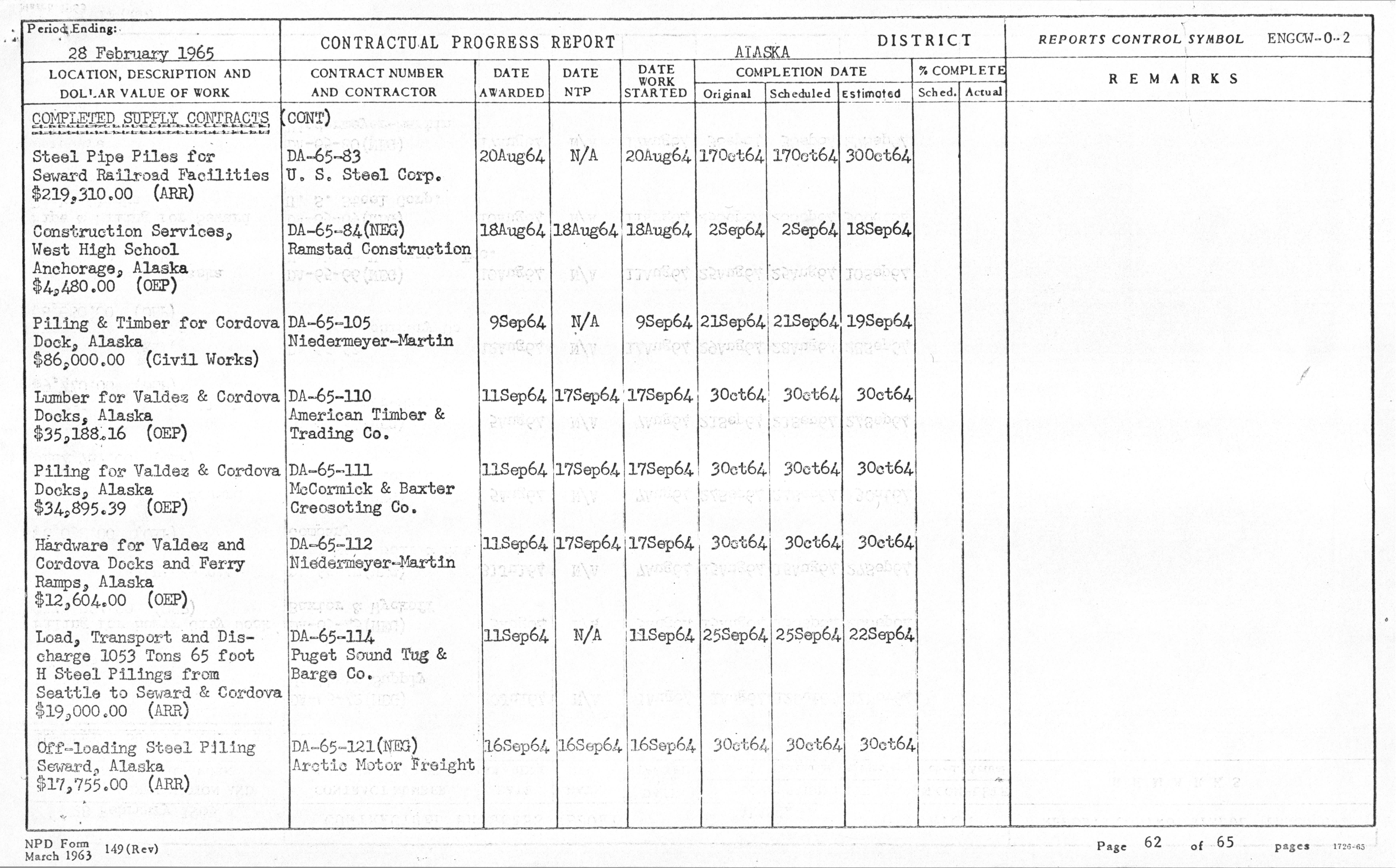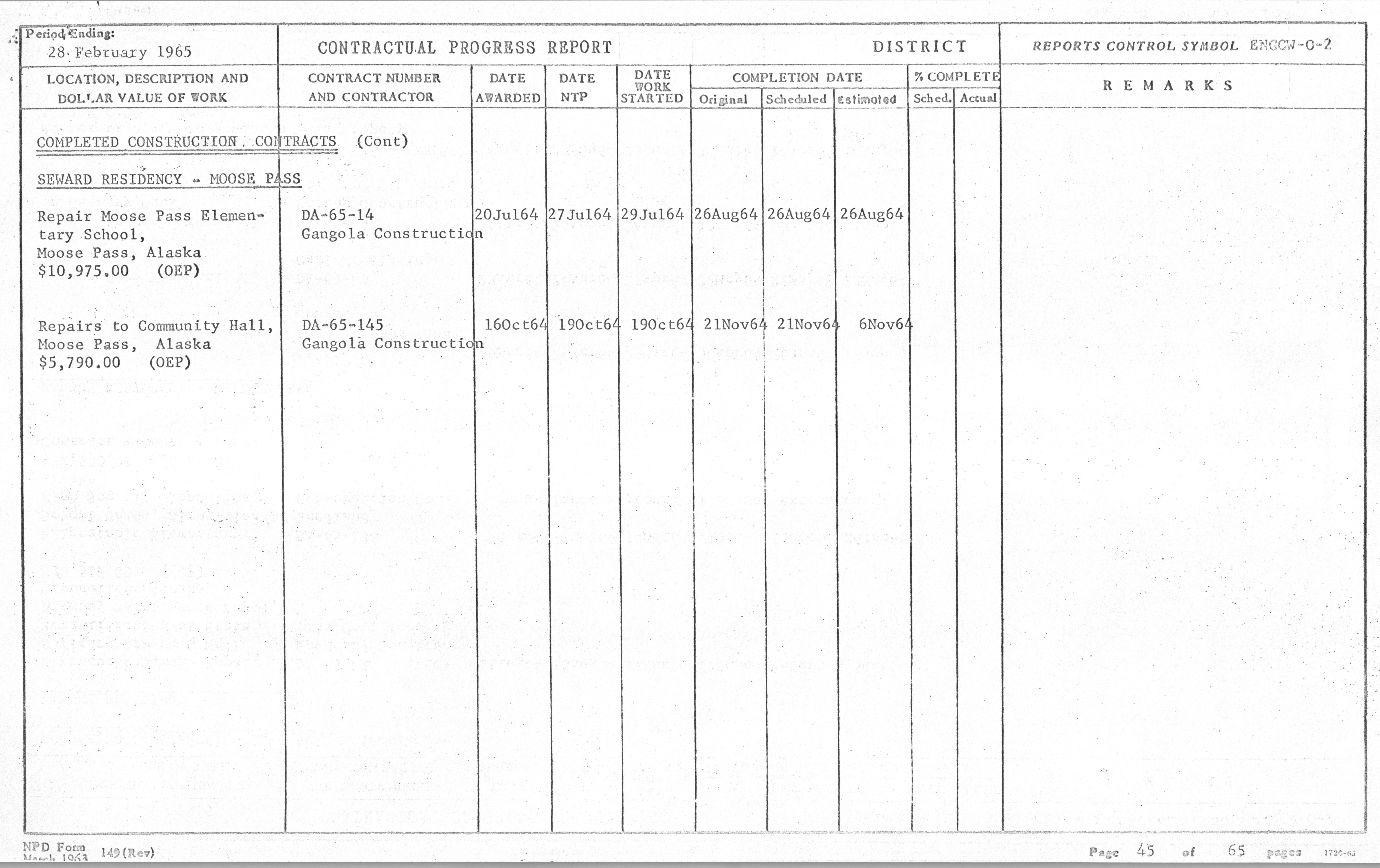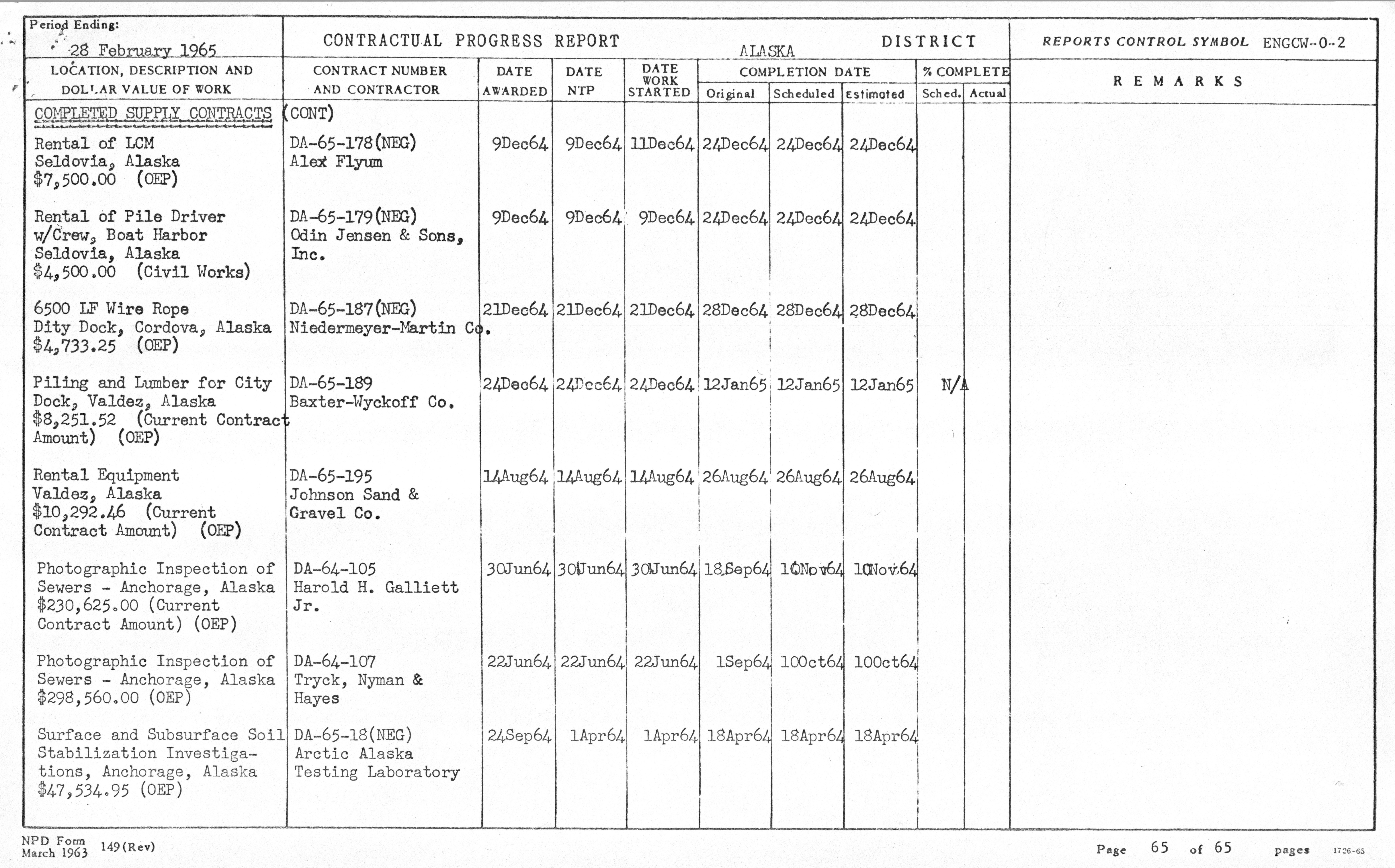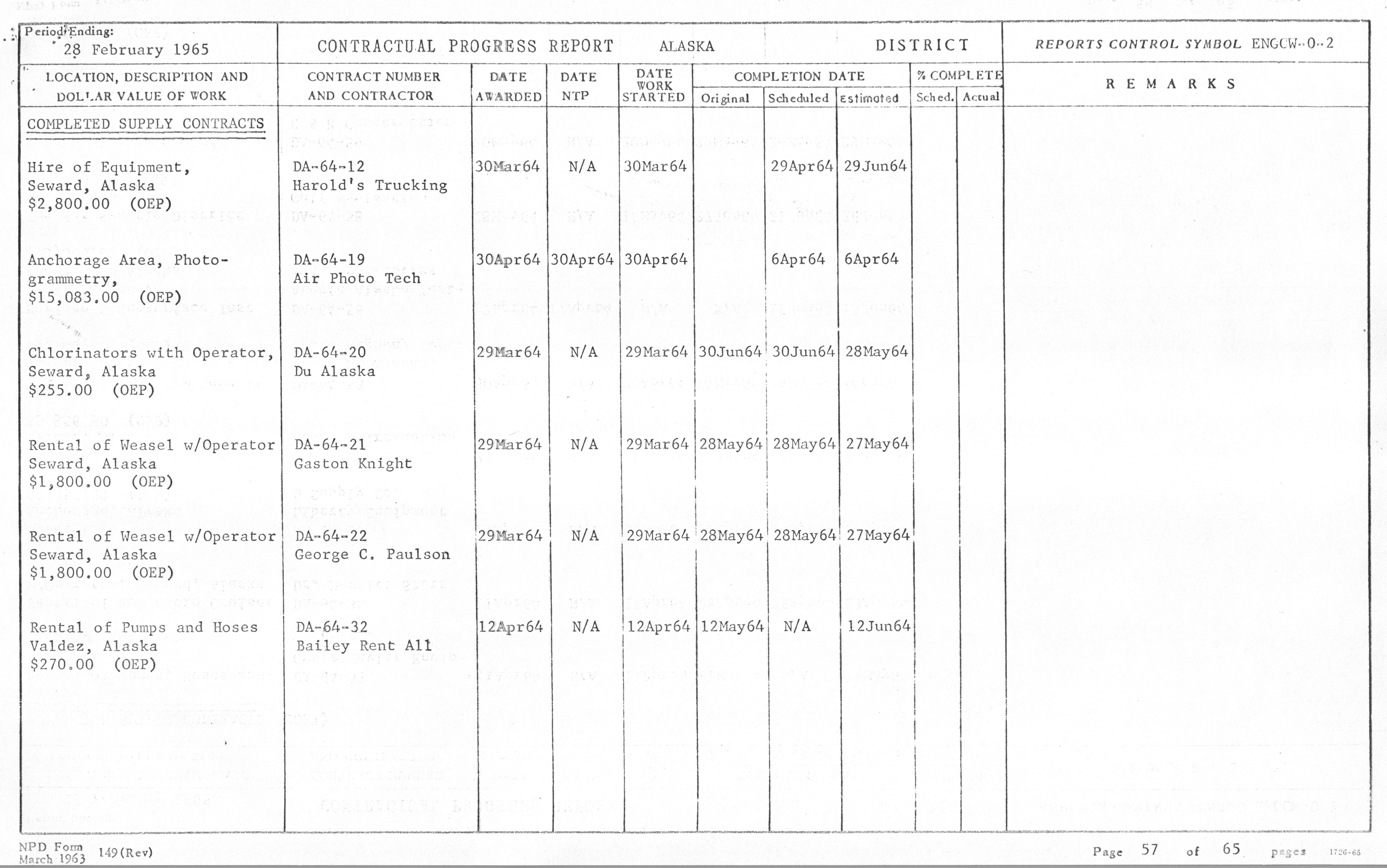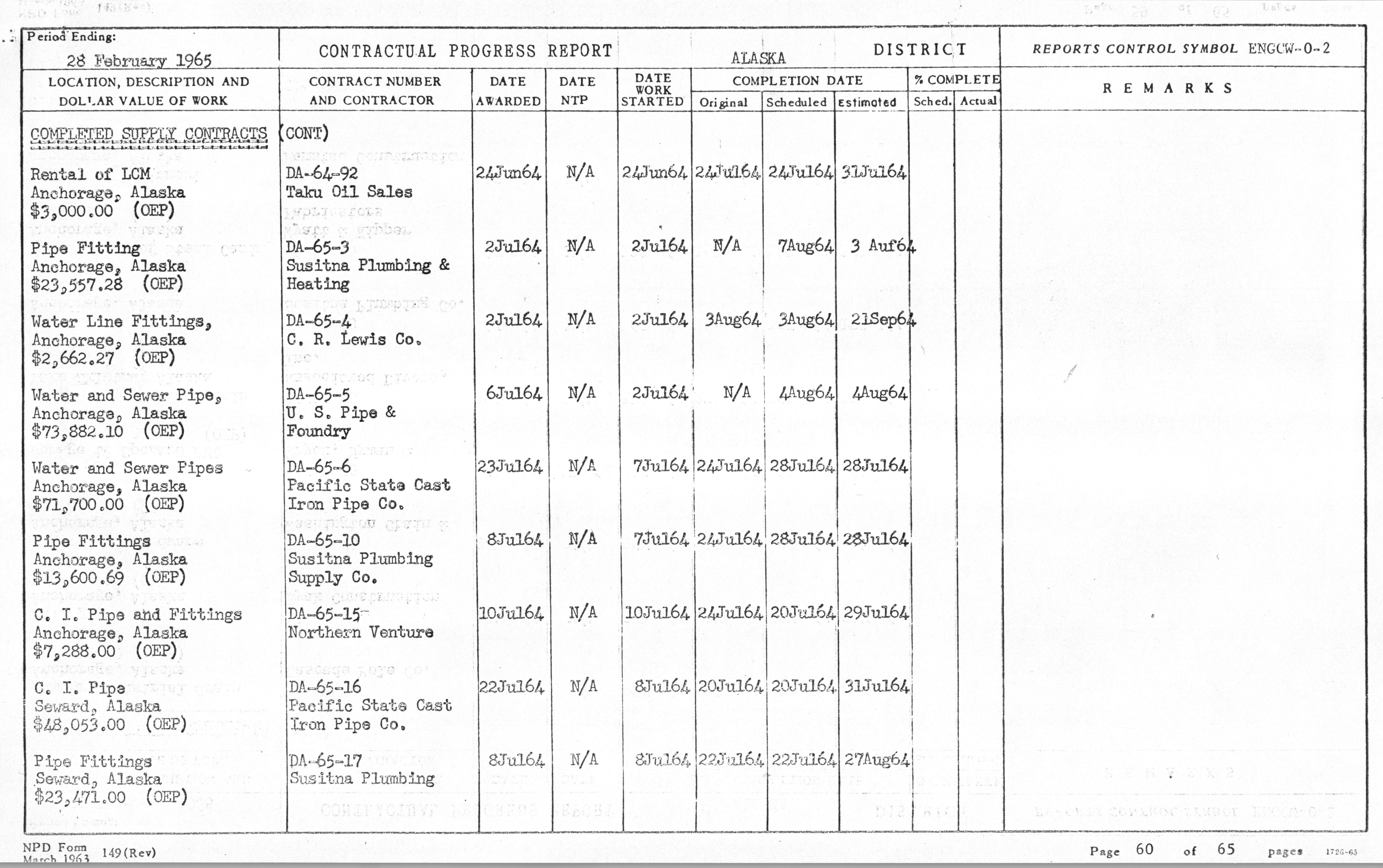 - "Alaska earthquake restoration projects contractual progress report, May 31, 1965", Dwight Ink Collection, Iowa State University Library Digital Collections