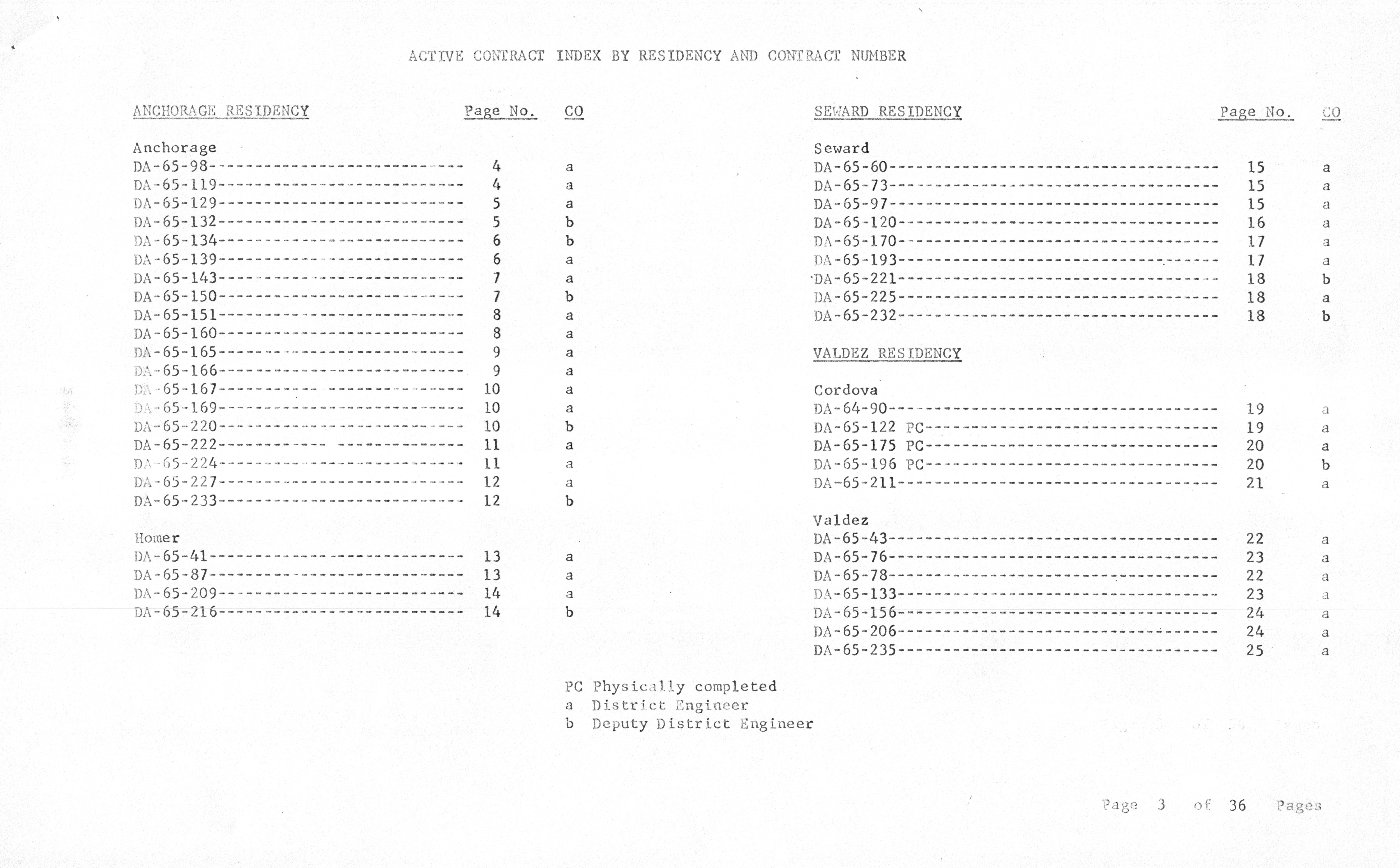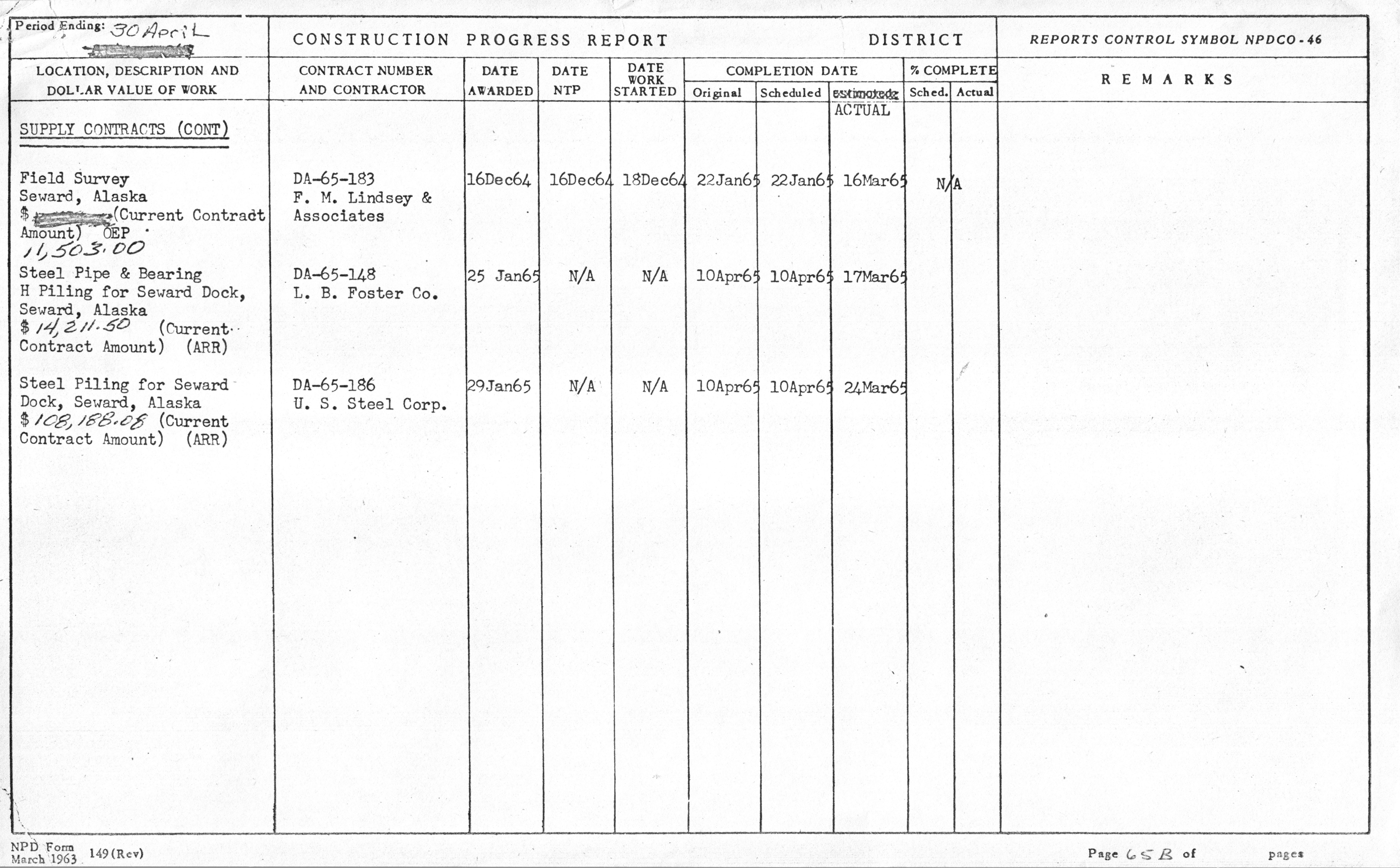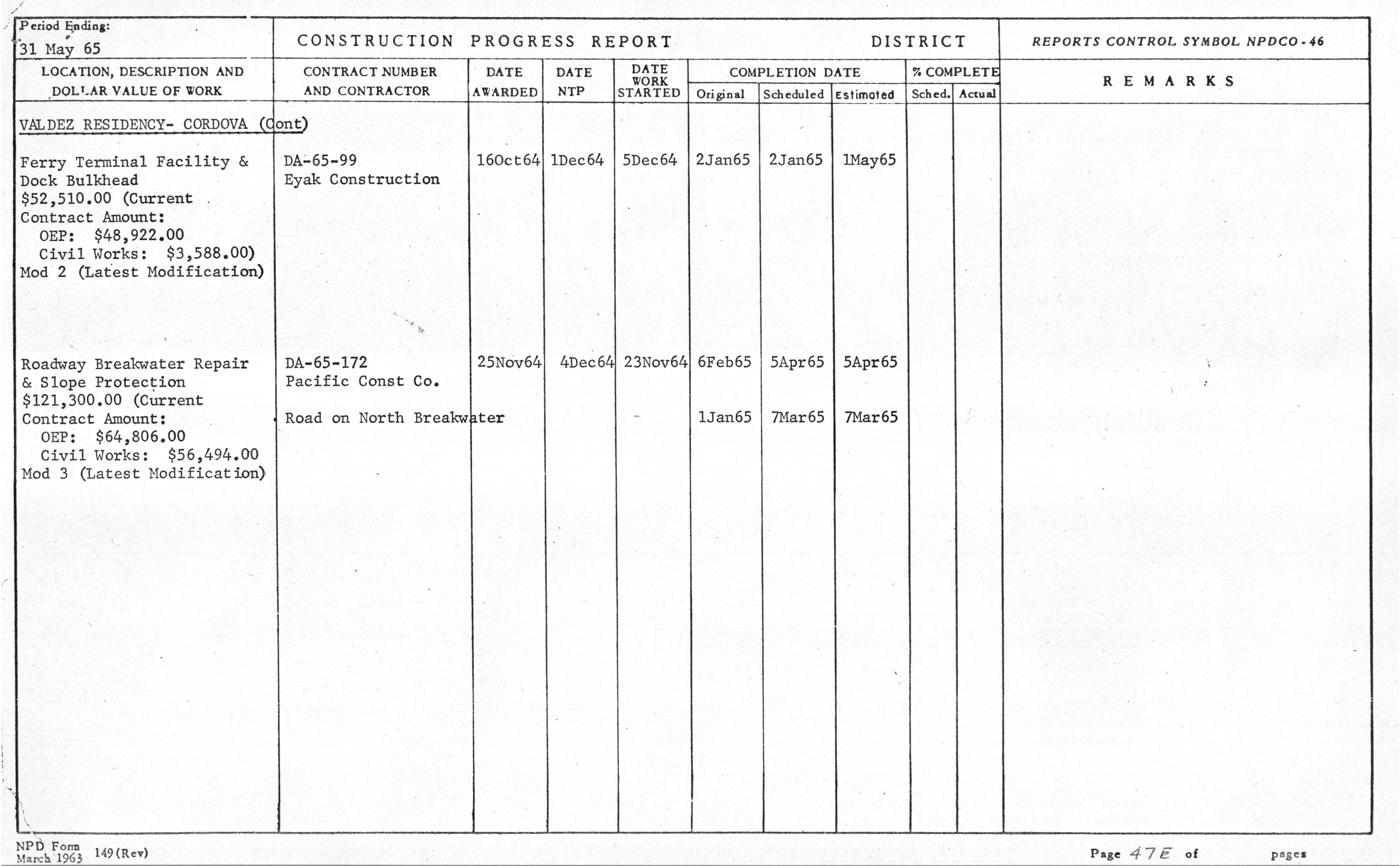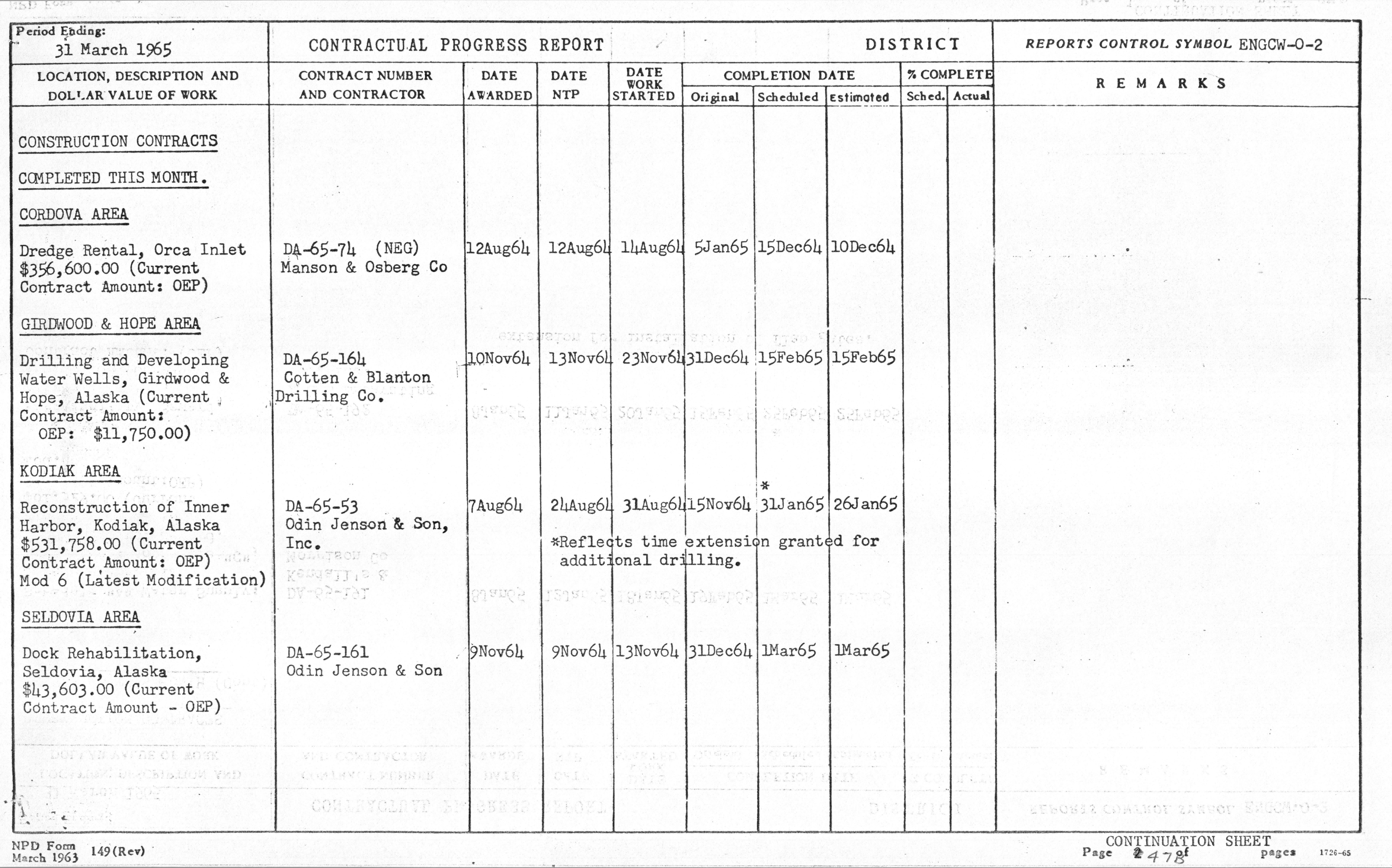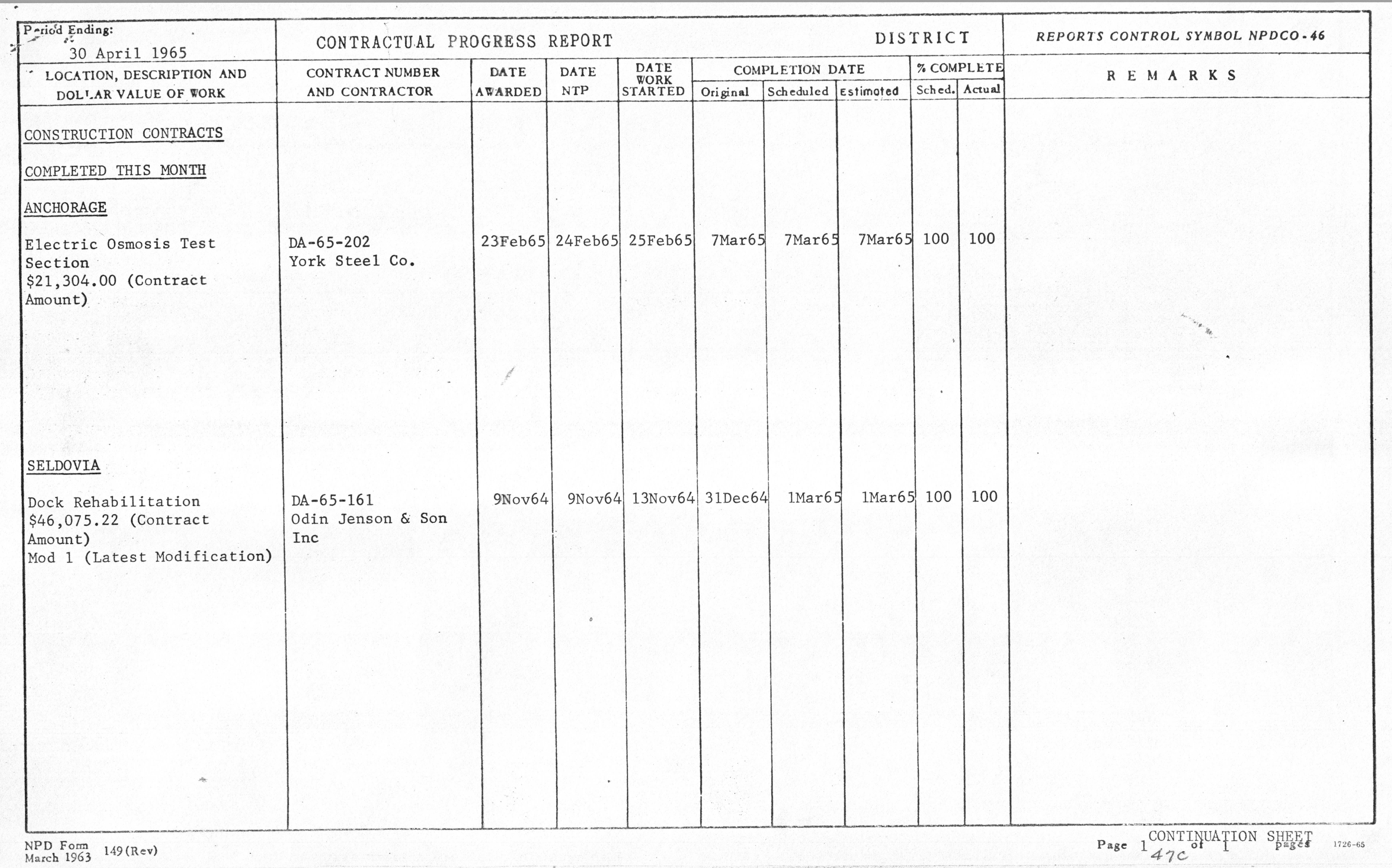 - "Alaska earthquake restoration projects contractual progress report, May 31, 1965", Dwight Ink Collection, Iowa State University Library Digital Collections