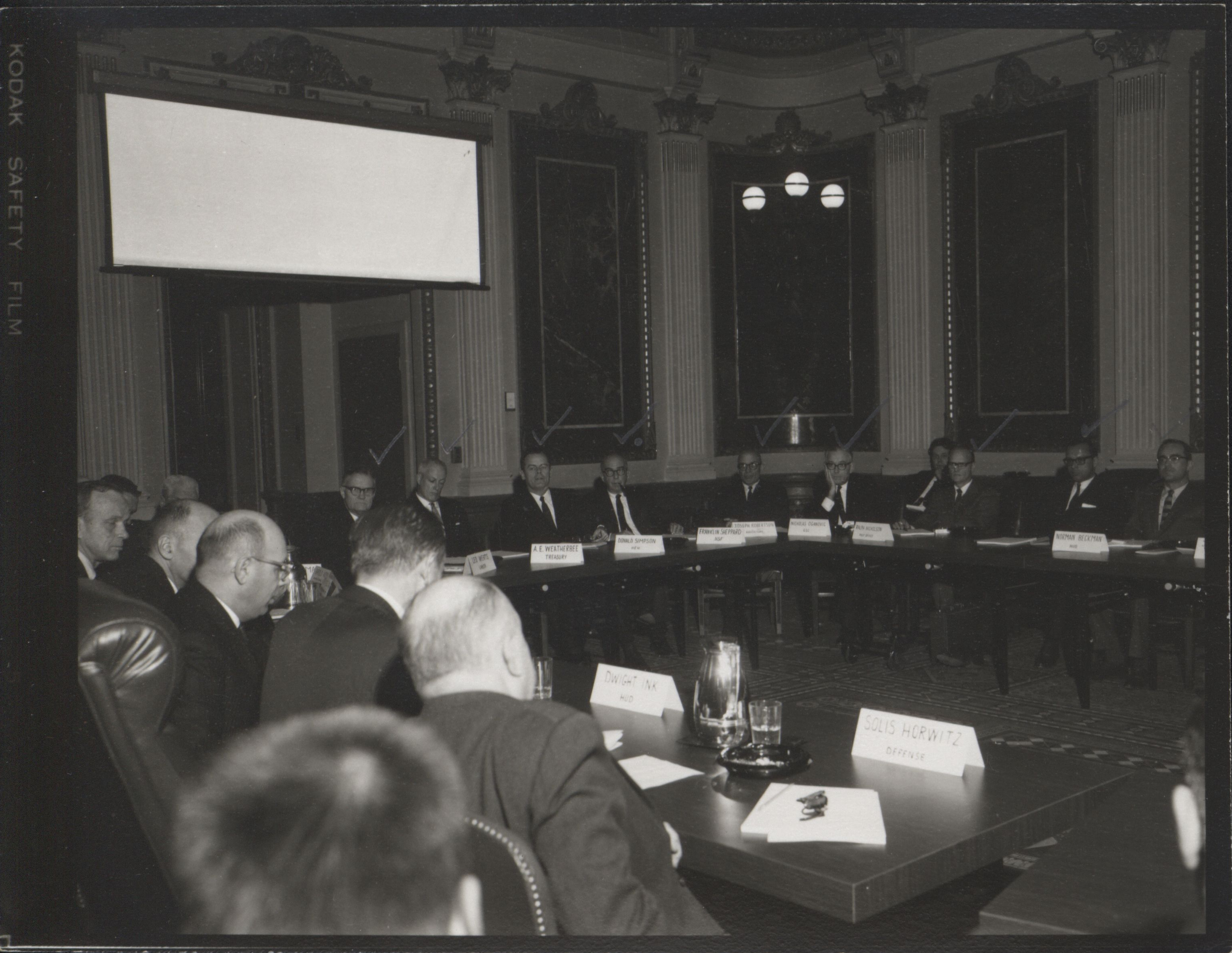 Photograph of Dwight Ink with others sitting around tables at the Indian Treaty Room Item Info