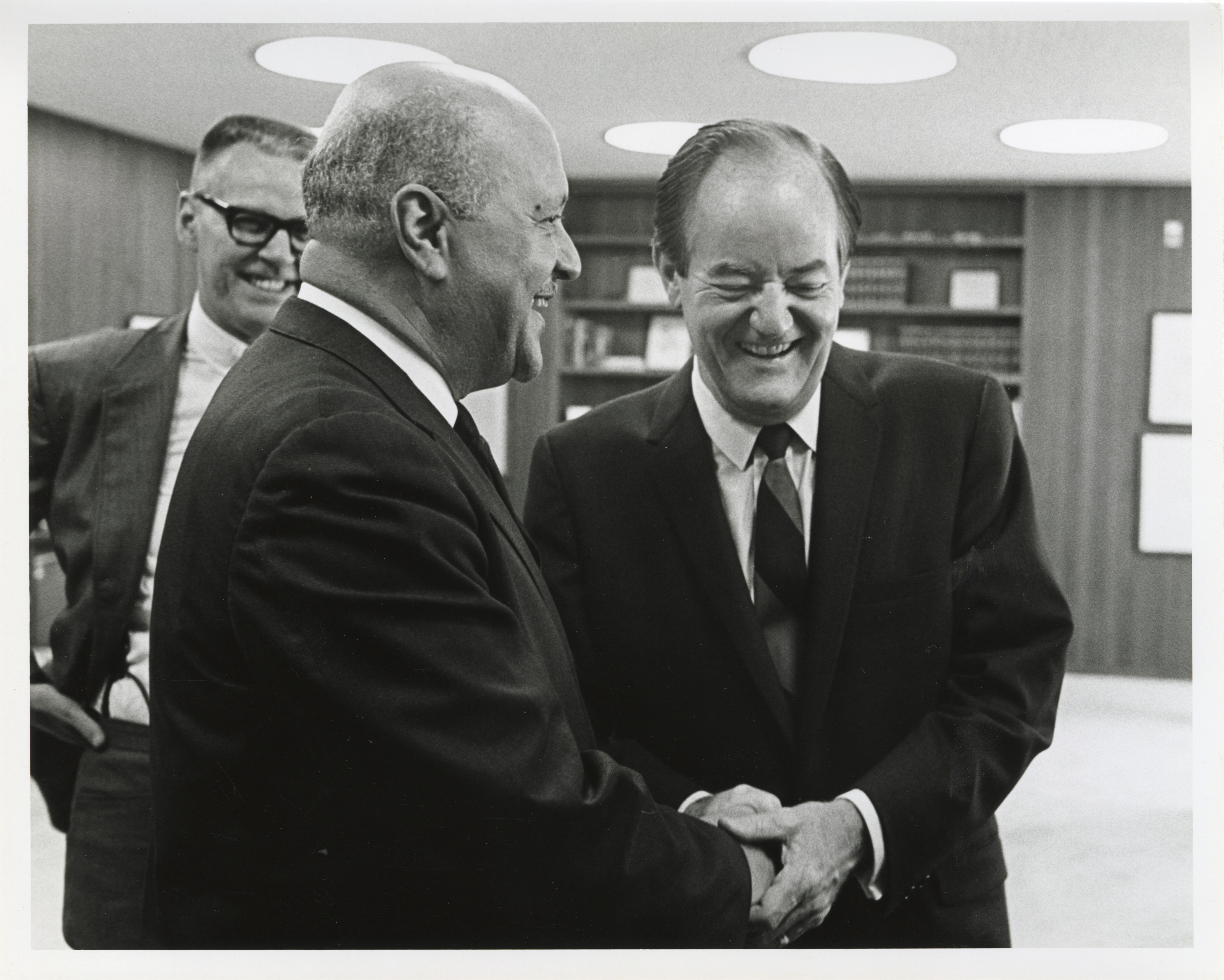 - Photograph of Robert Weaver shaking hands with Hubert Humphrey