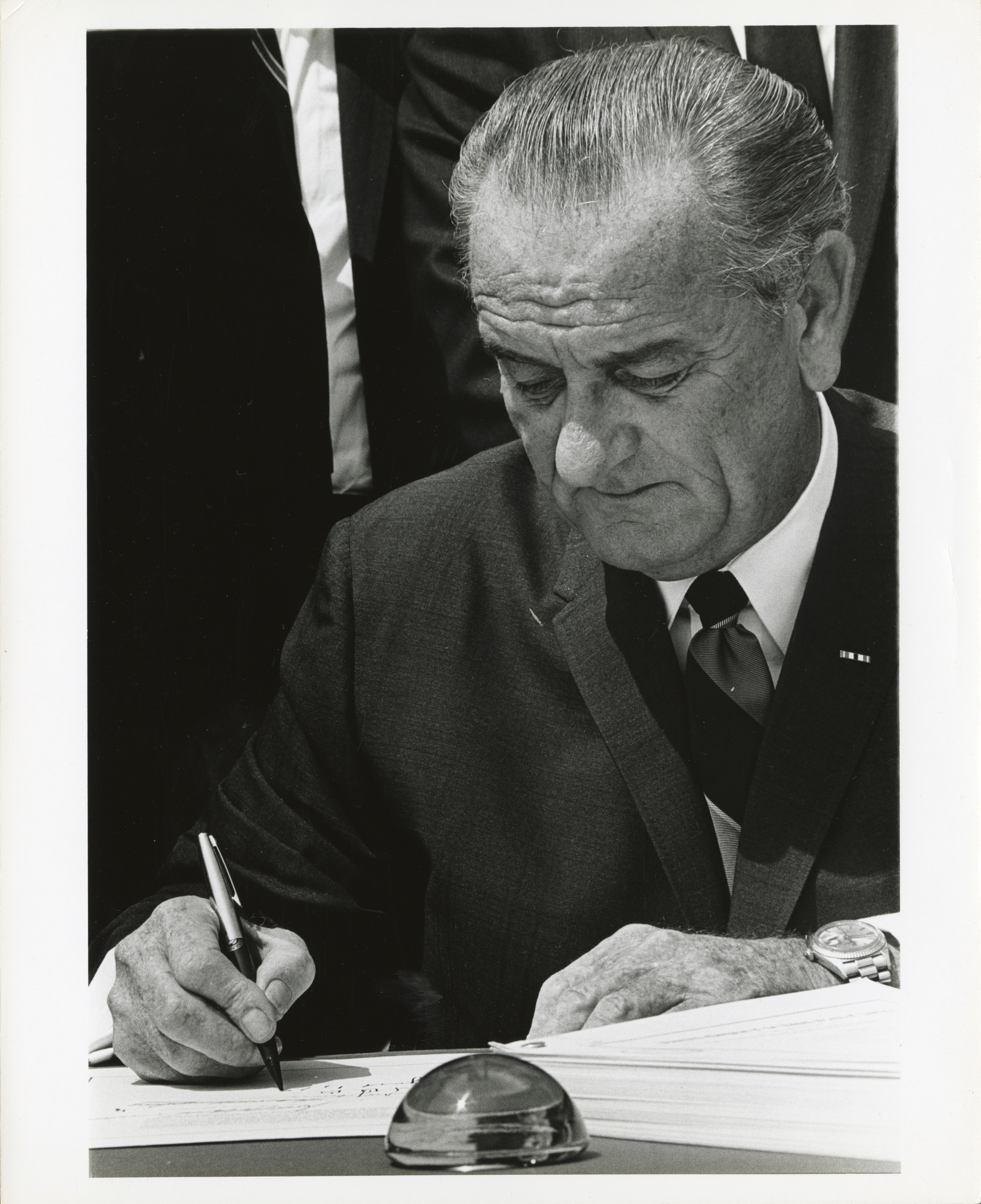 - "Photograph of Lyndon B. Johnson signing a document", Dwight Ink Collection, Iowa State University Library Digital Collections