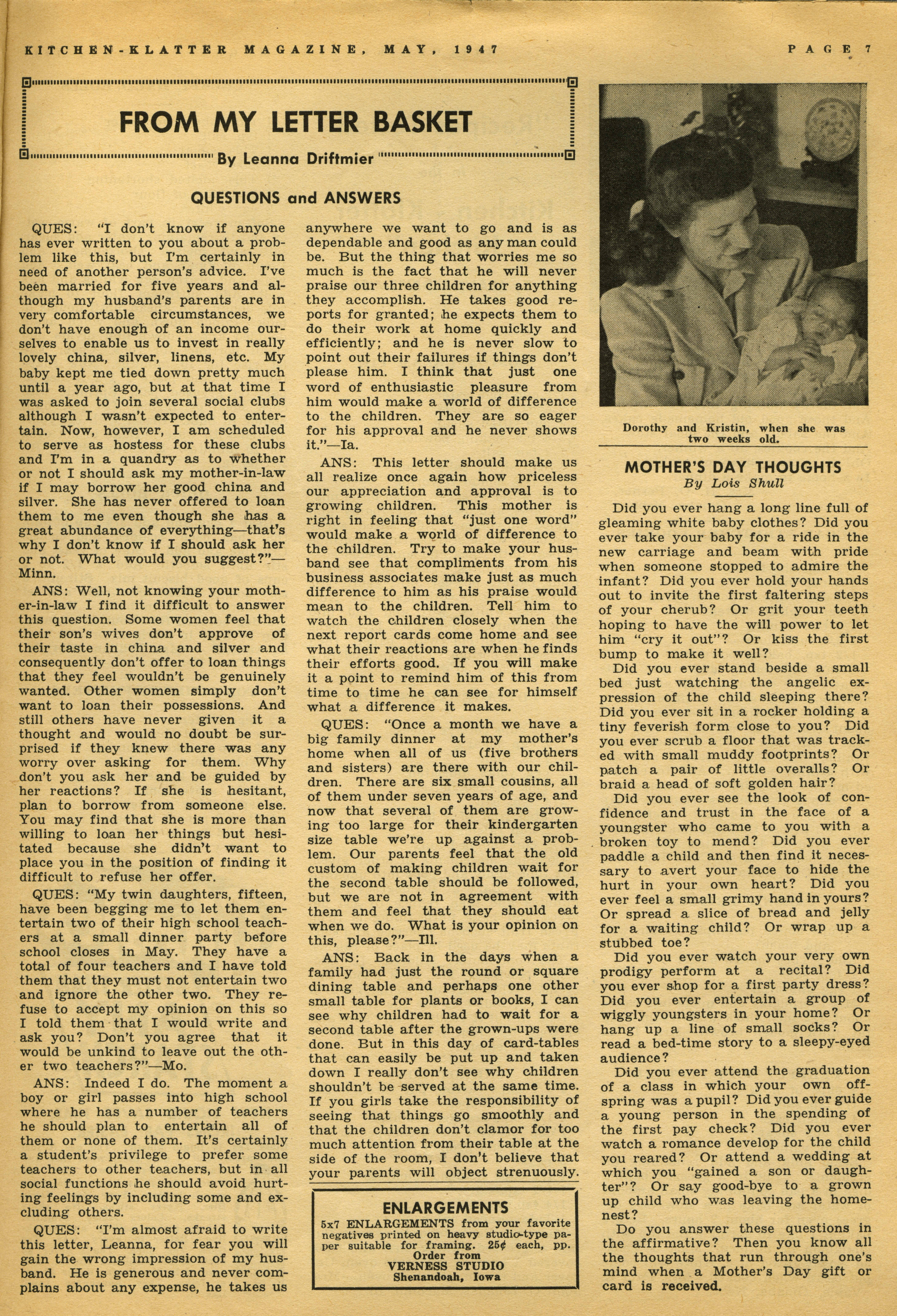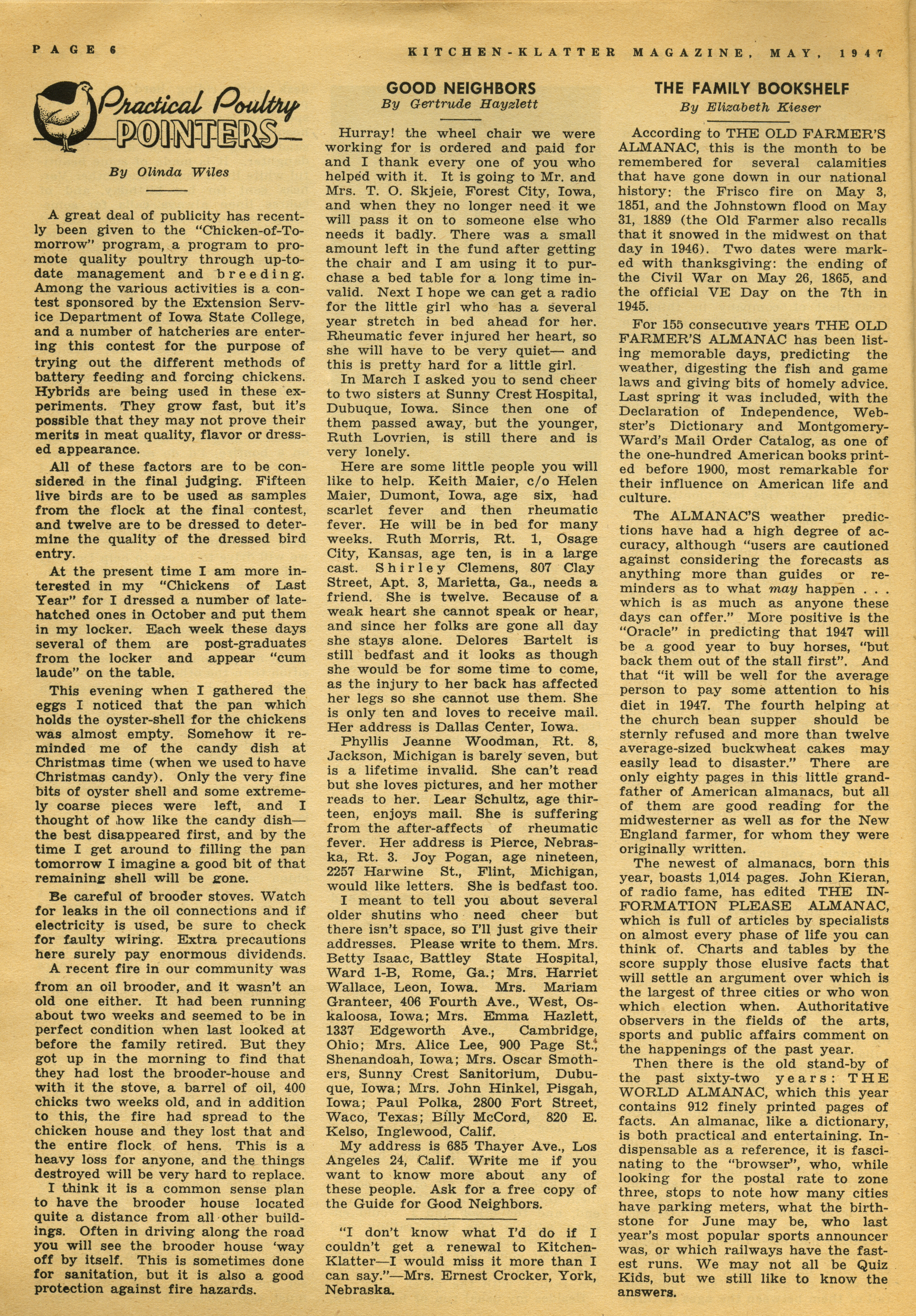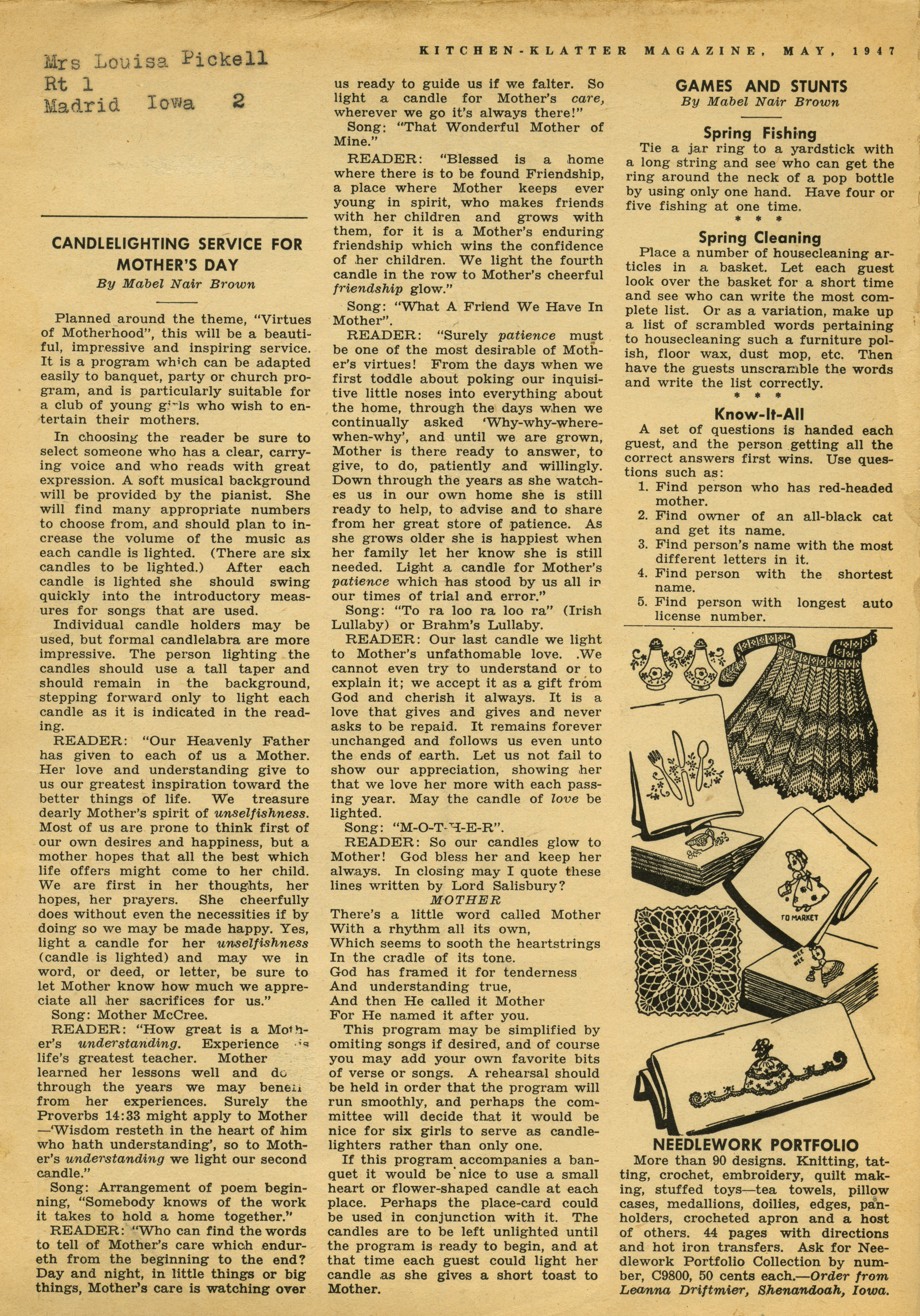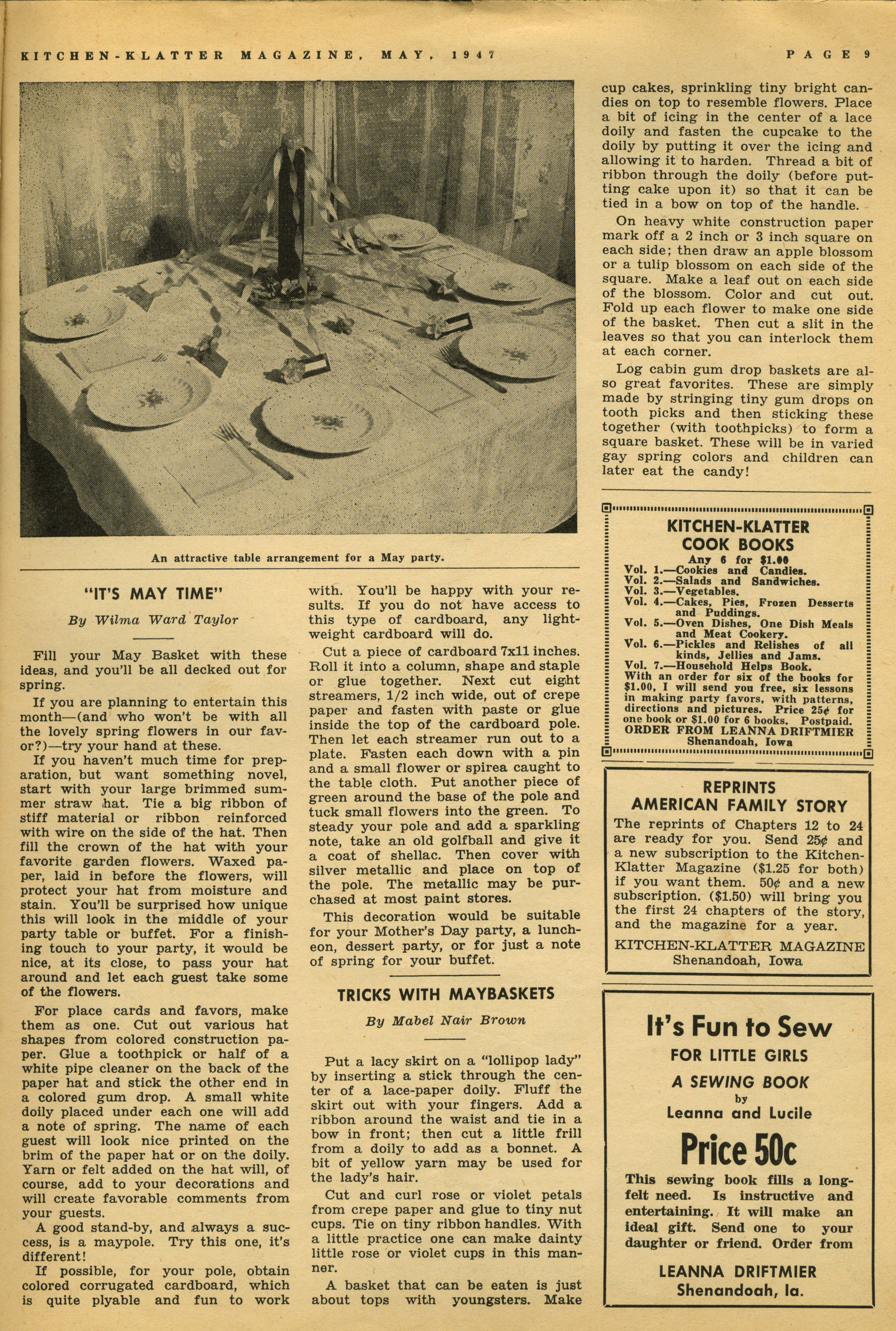 - "Kitchen-Klatter v. 12, n. 05, 1947", Kitchen-Klatter Magazine Issues, Iowa State University Library Digital Collections