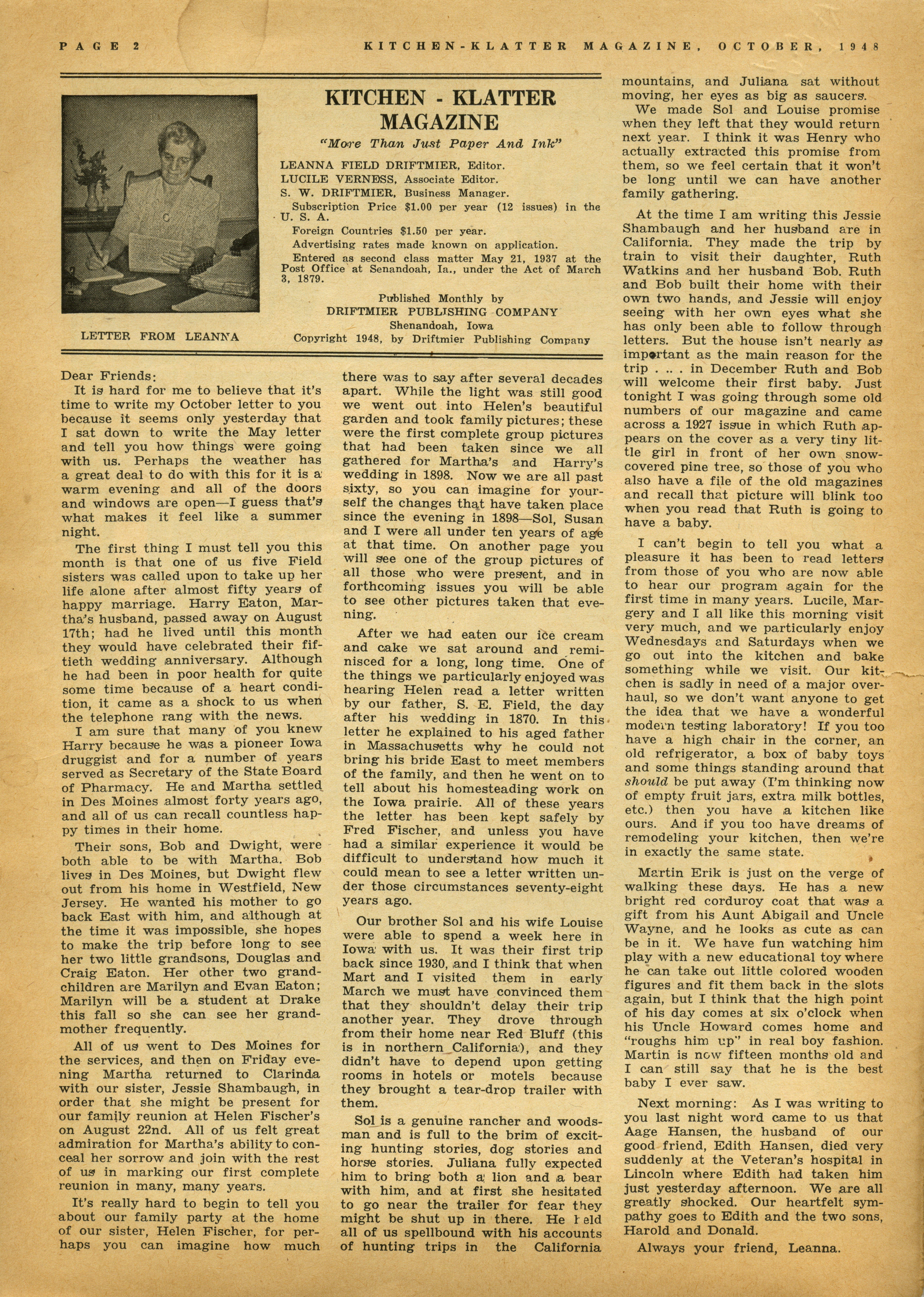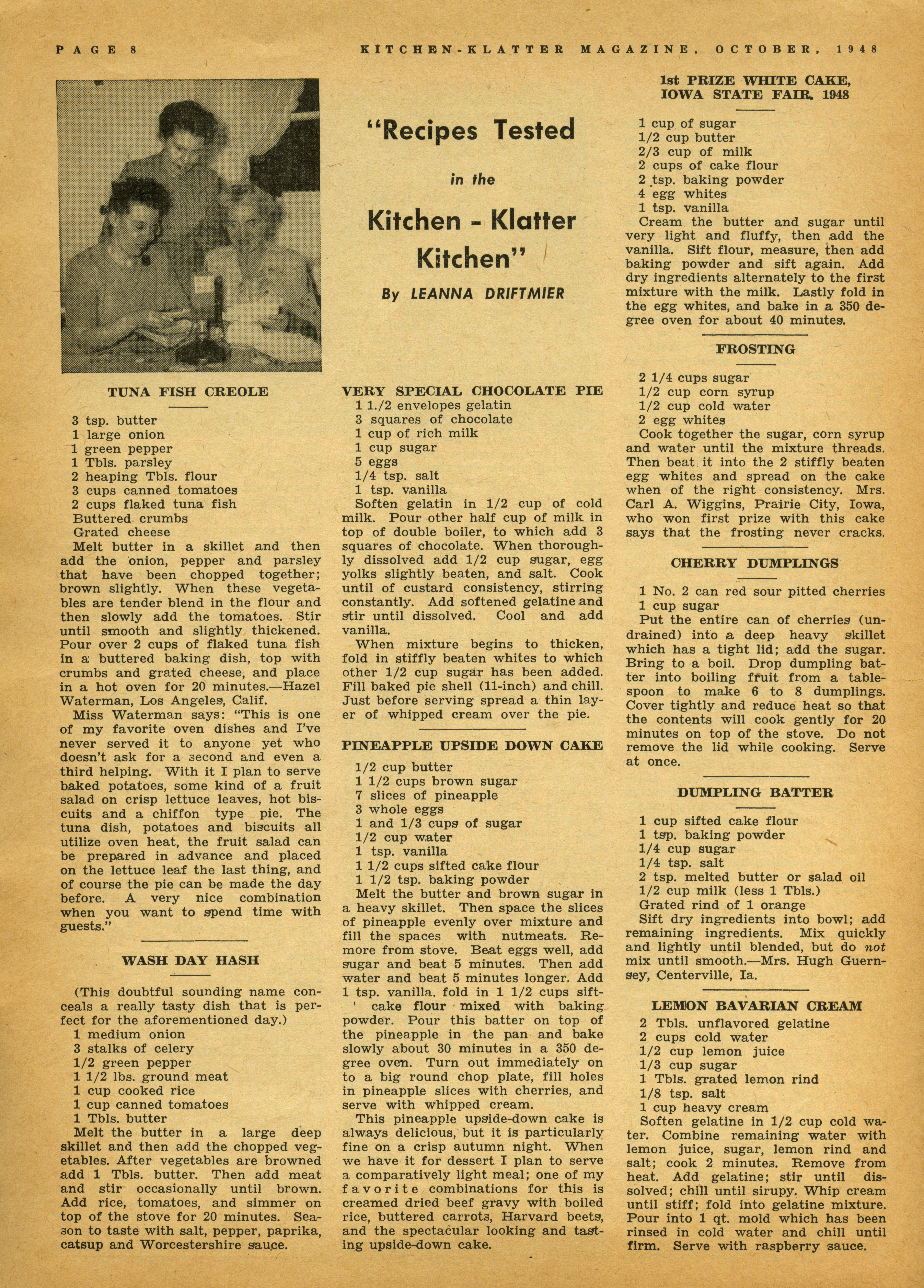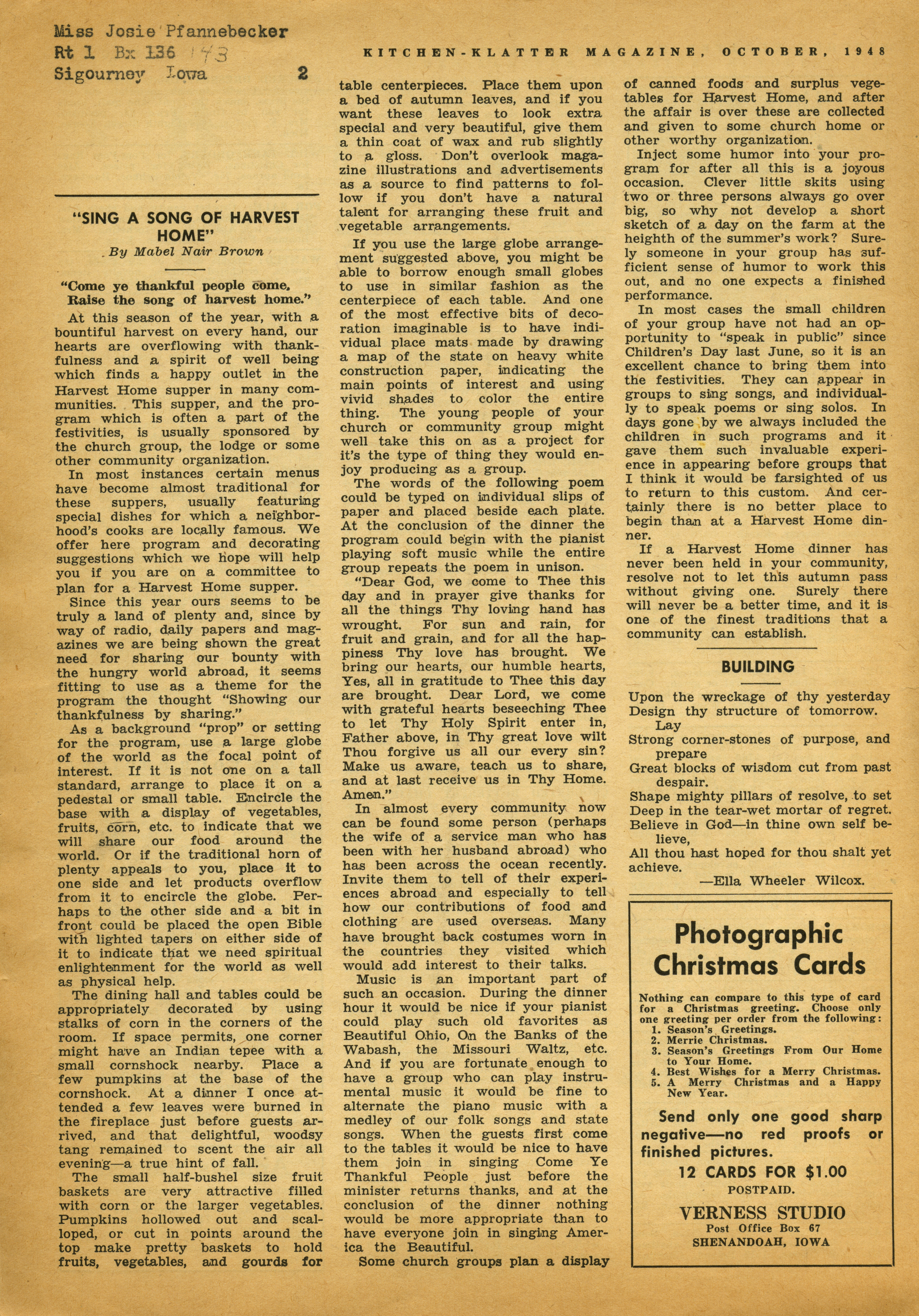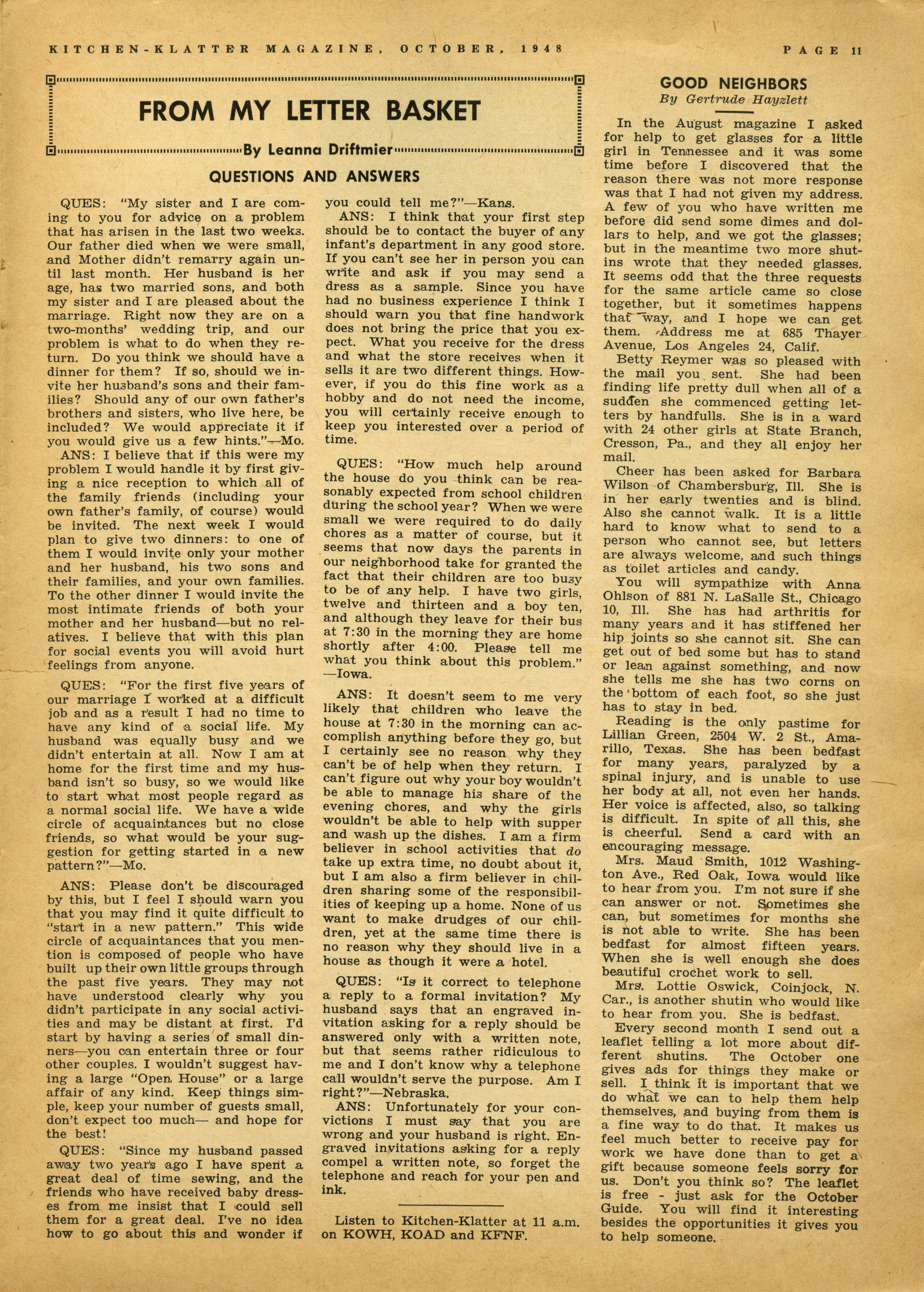 - "Kitchen-Klatter v. 13, n. 10, 1948", Kitchen-Klatter Magazine Issues, Iowa State University Library Digital Collections
