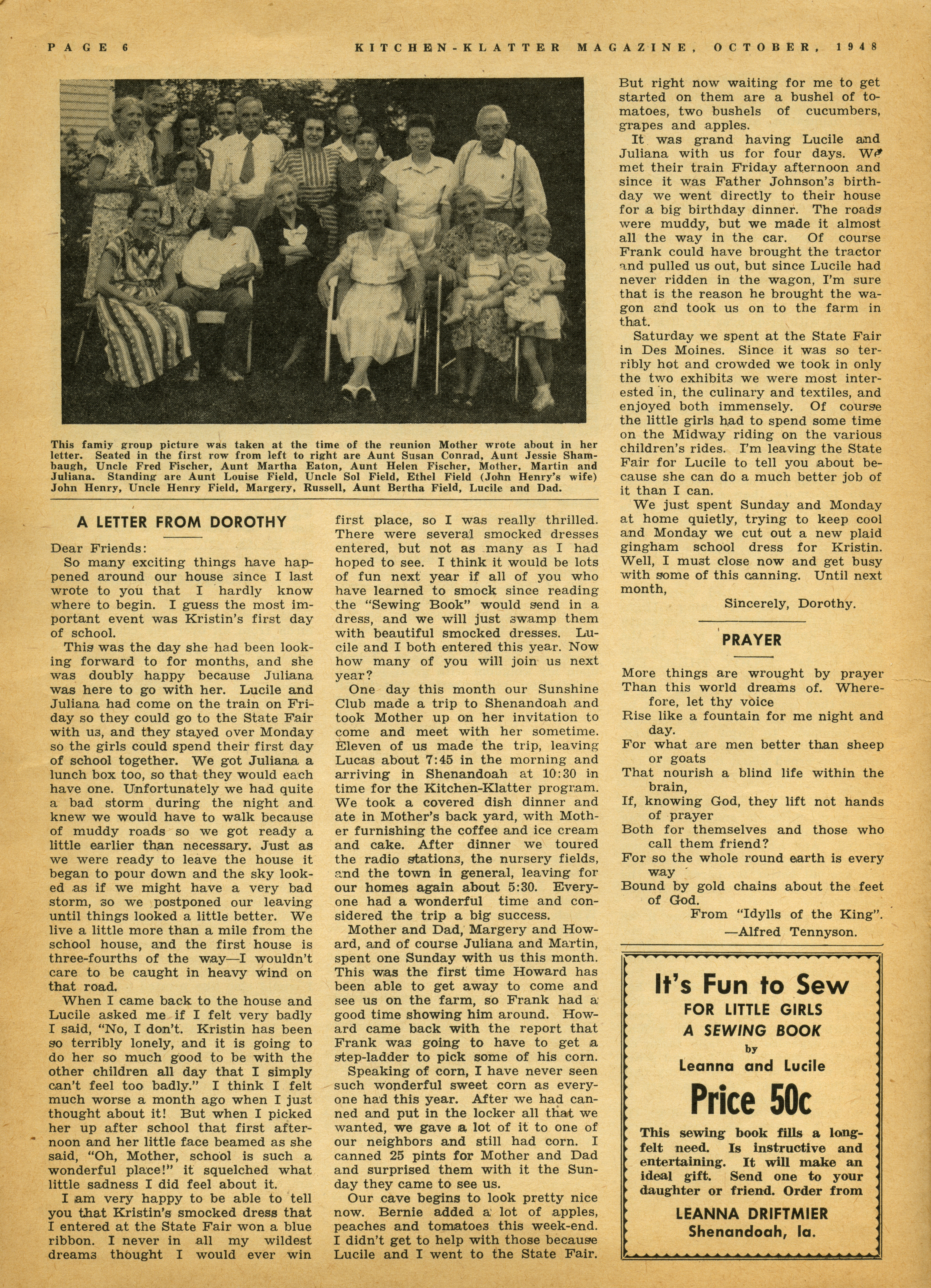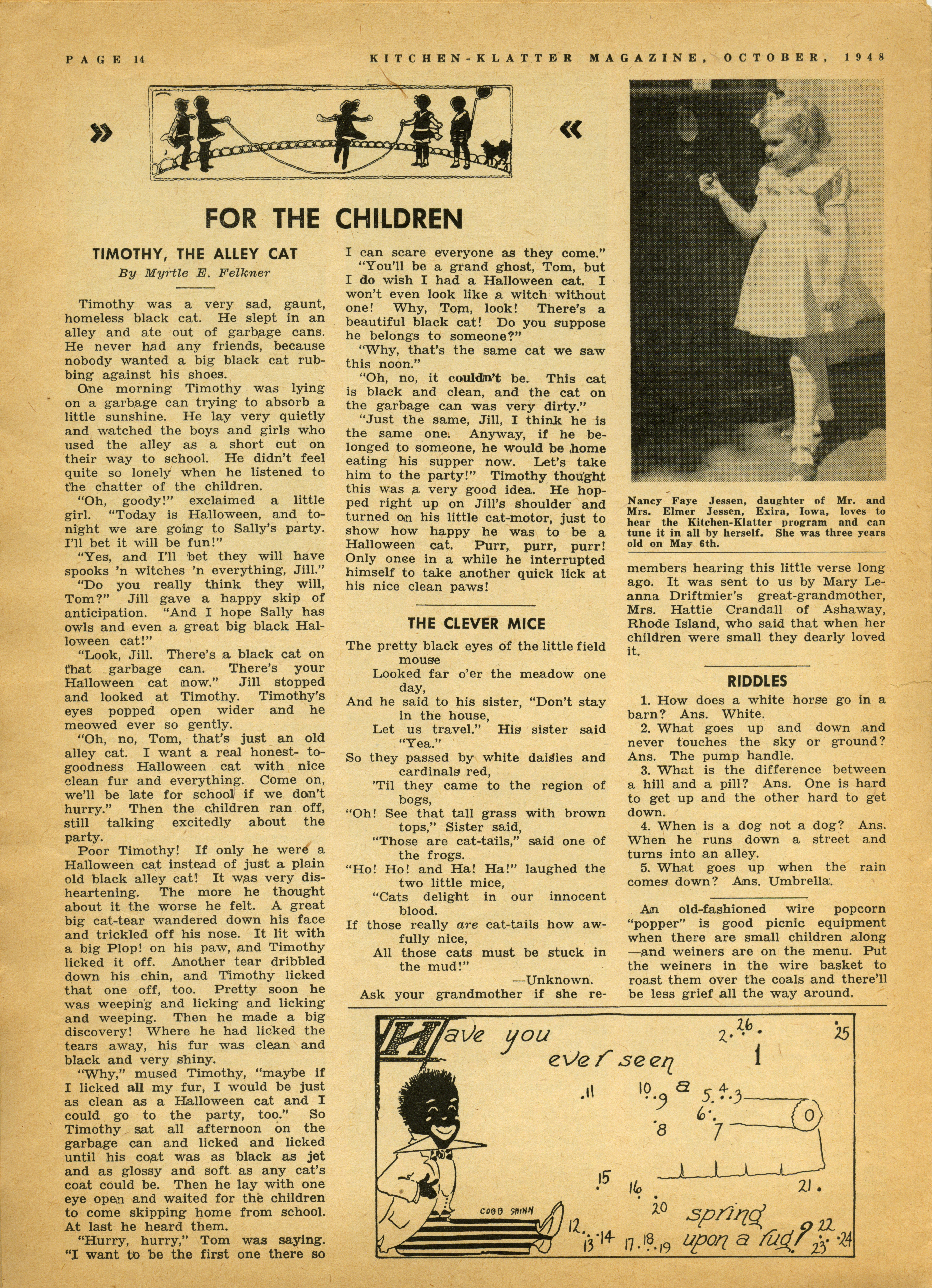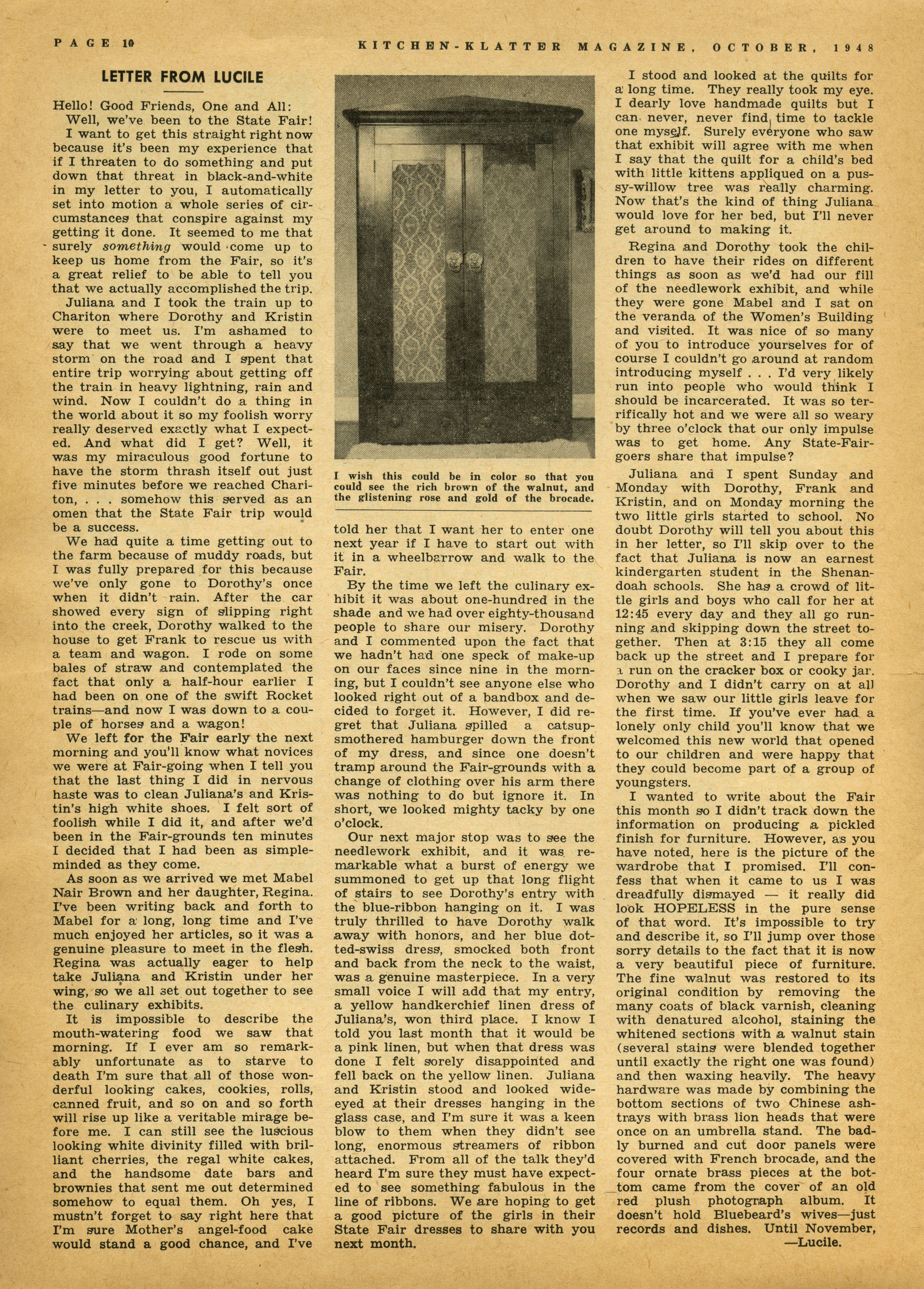 - "Kitchen-Klatter v. 13, n. 10, 1948", Kitchen-Klatter Magazine Issues, Iowa State University Library Digital Collections