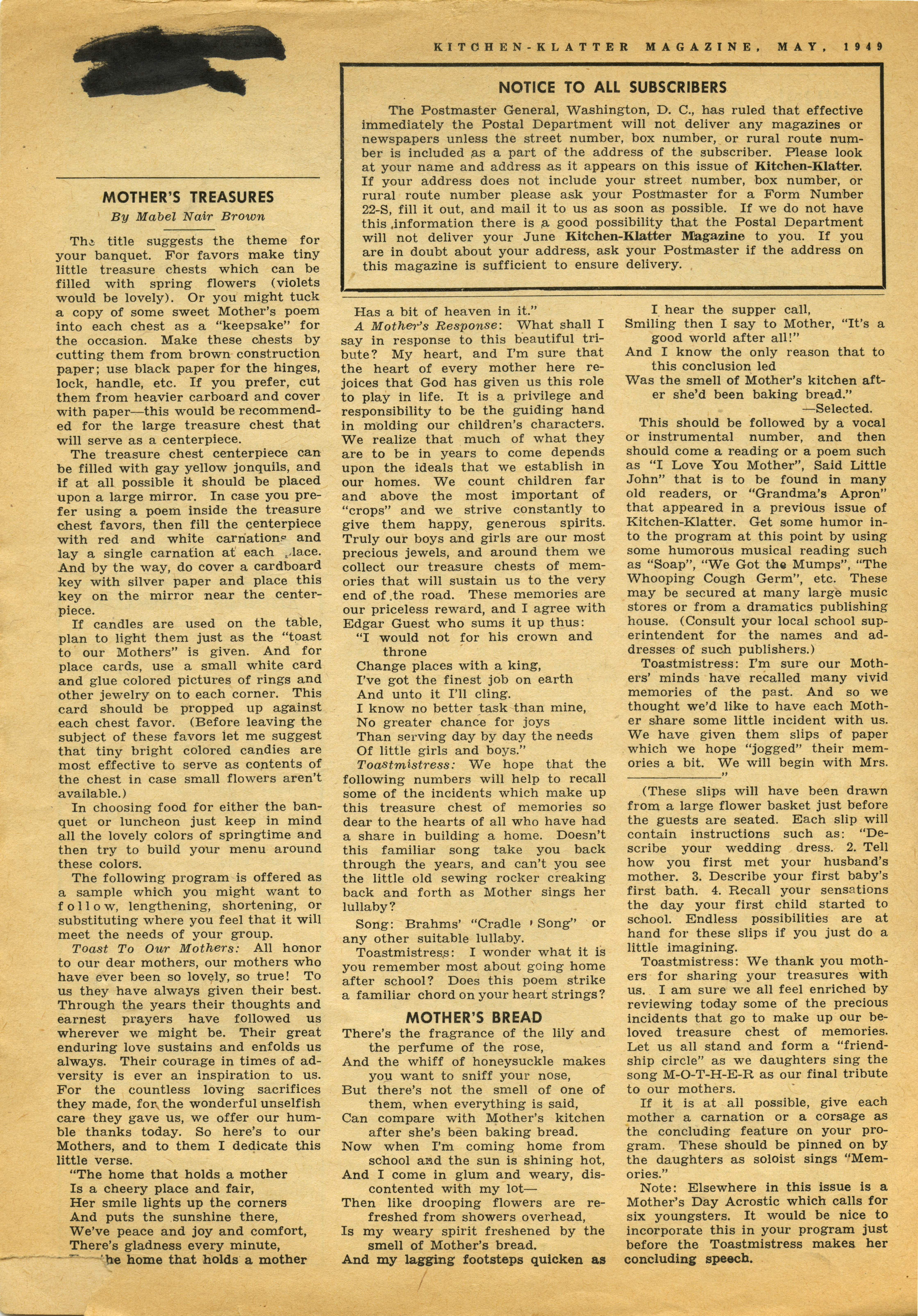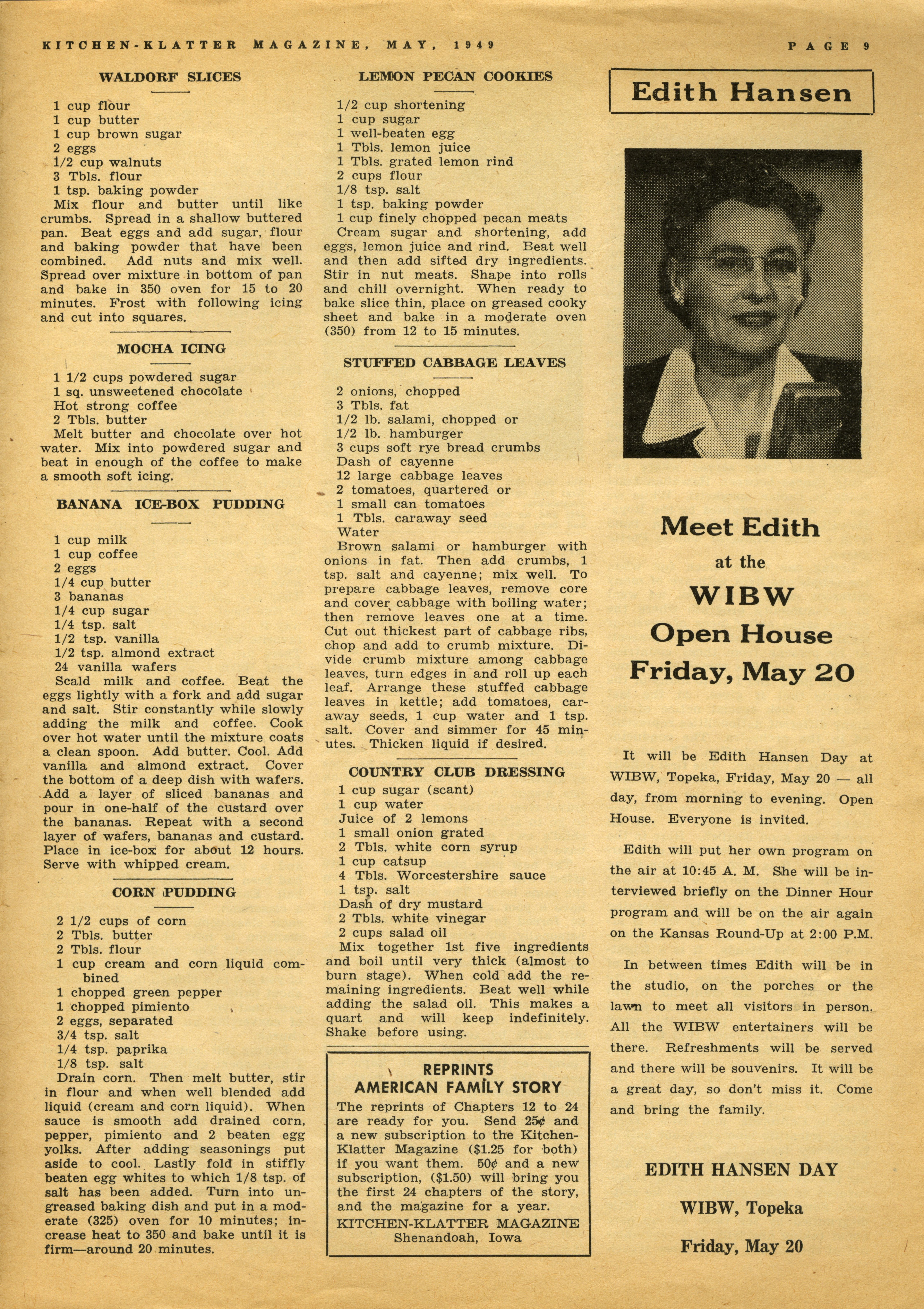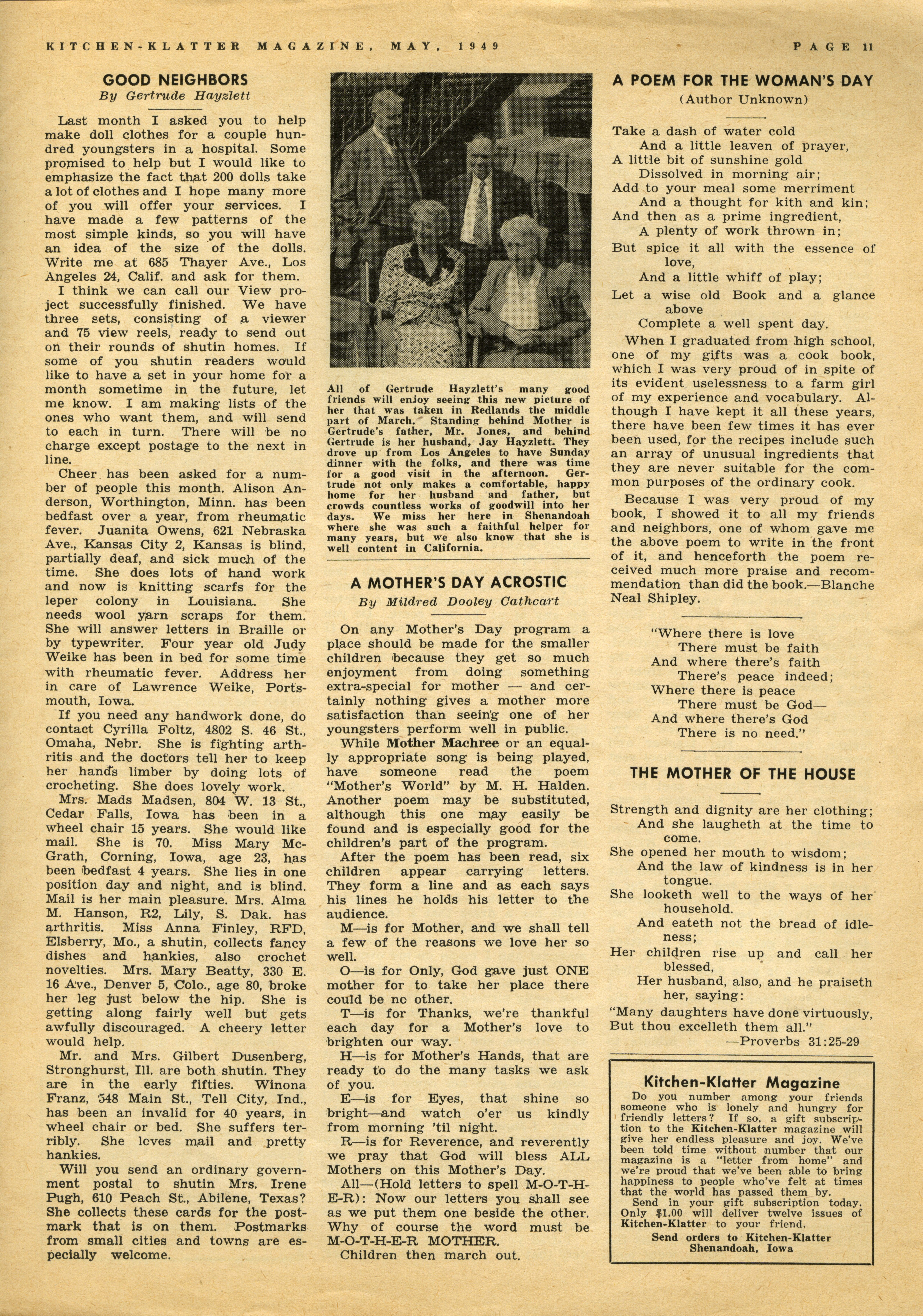 - "Kitchen-Klatter v. 14, n. 05, 1949", Kitchen-Klatter Magazine Issues, Iowa State University Library Digital Collections