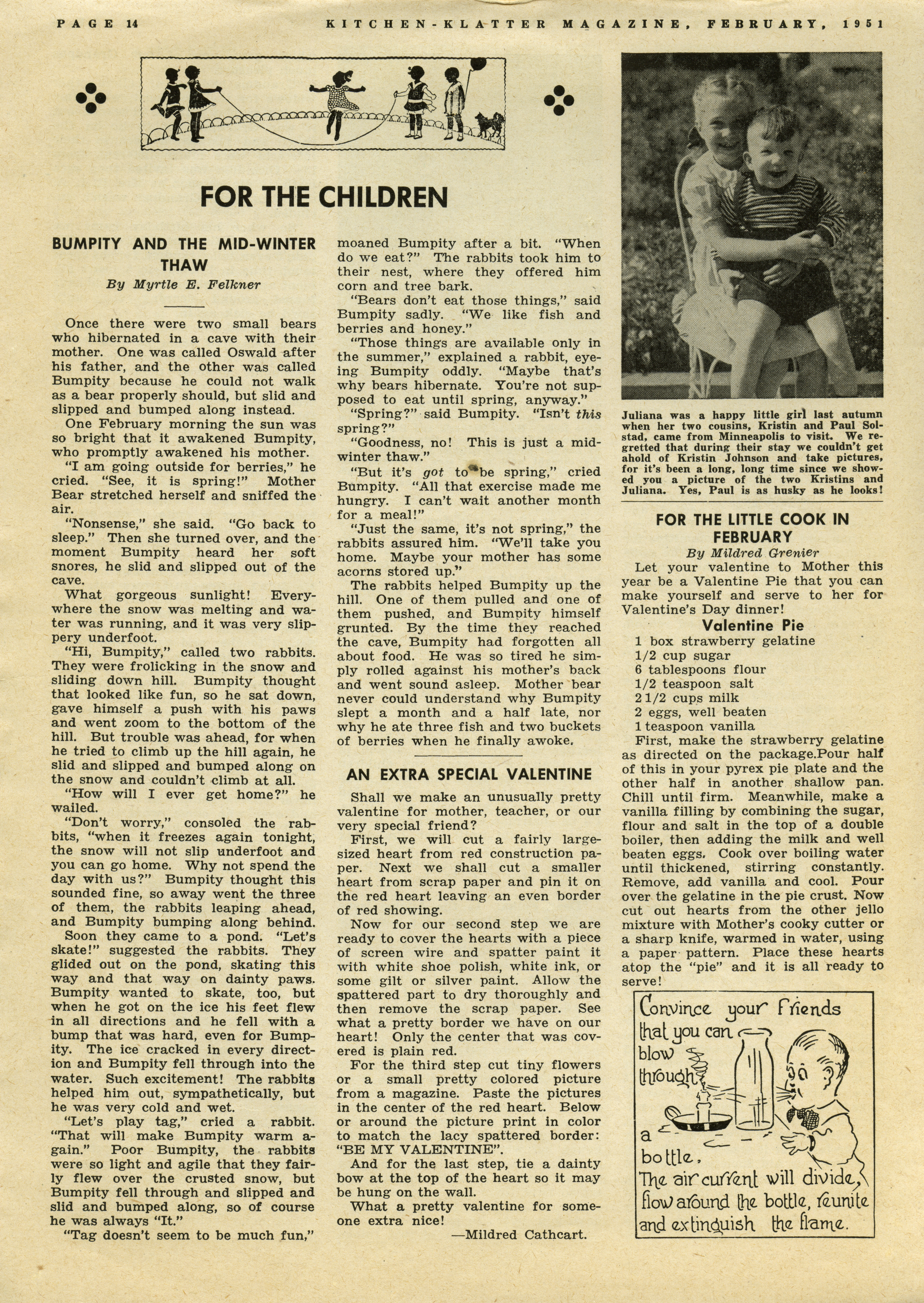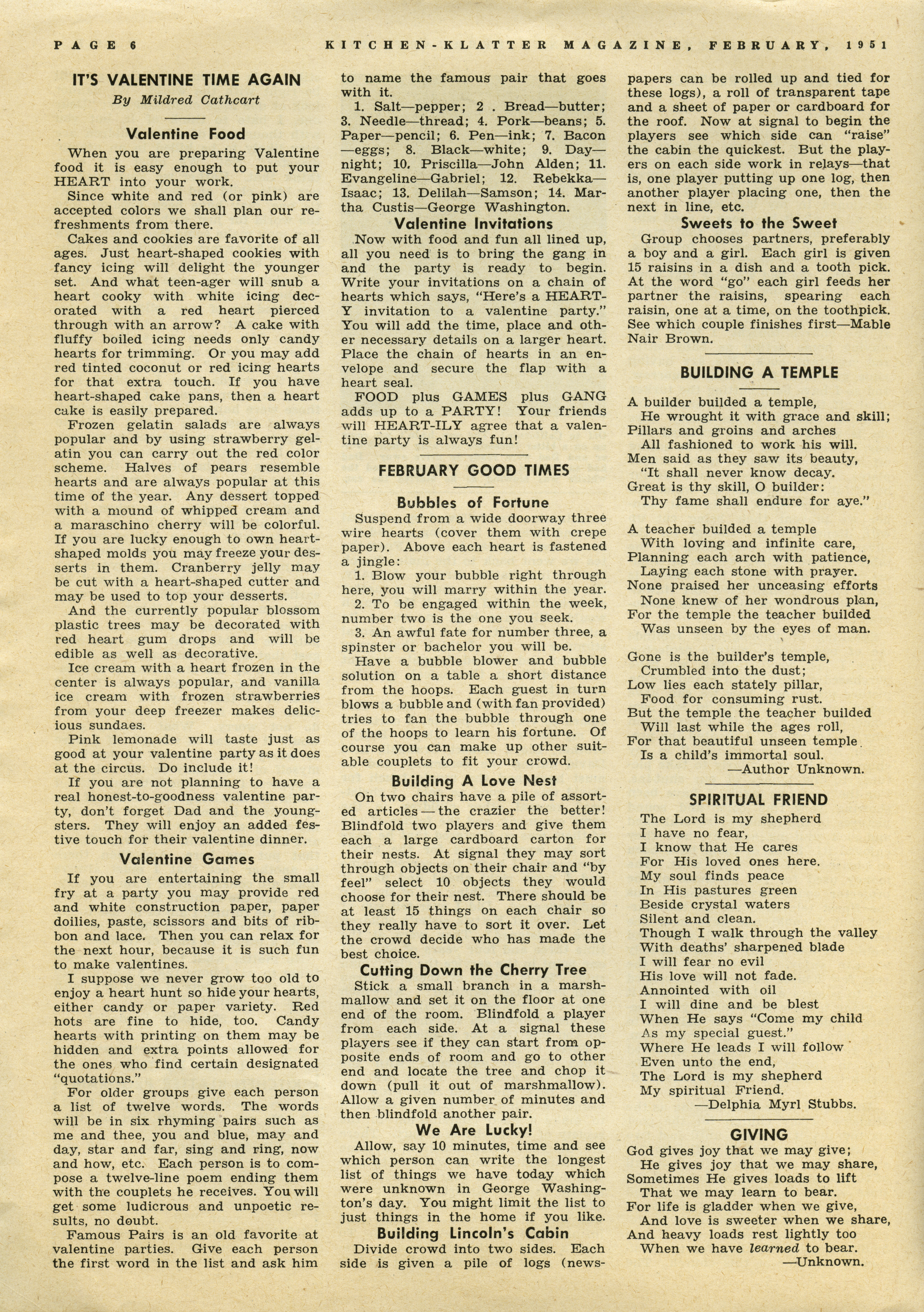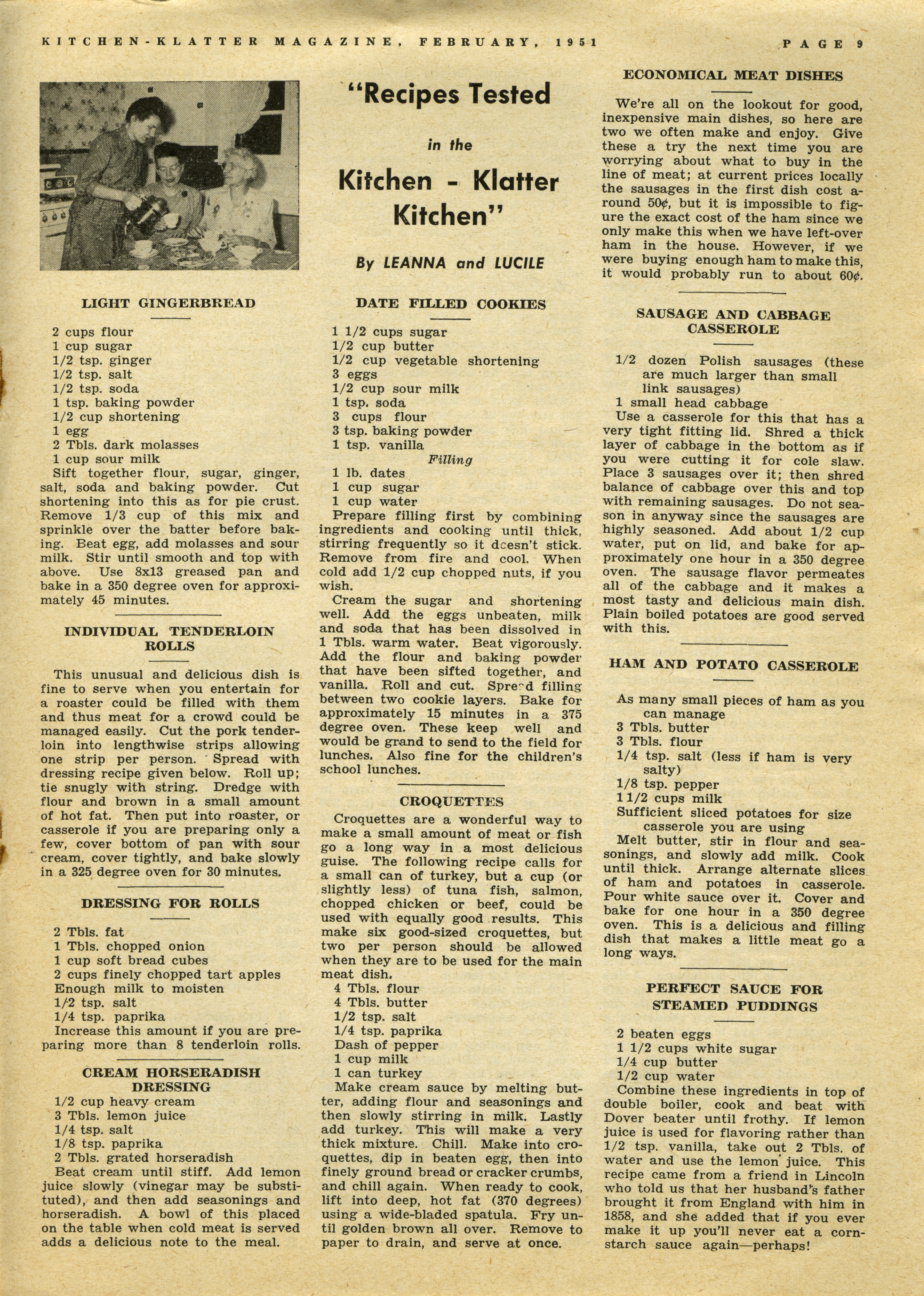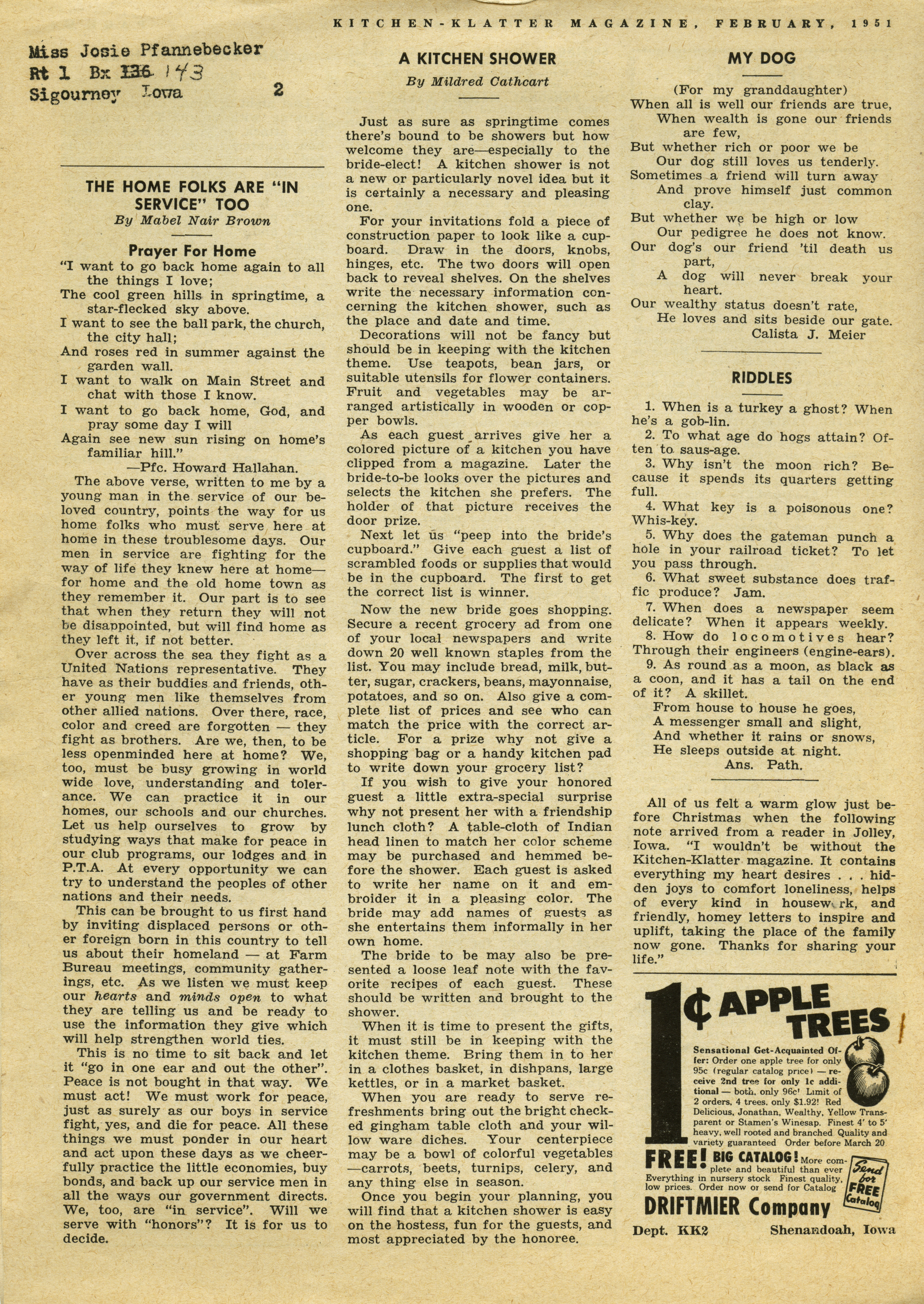 - "Kitchen-Klatter v. 16, n. 02, 1951", Kitchen-Klatter Magazine Issues, Iowa State University Library Digital Collections