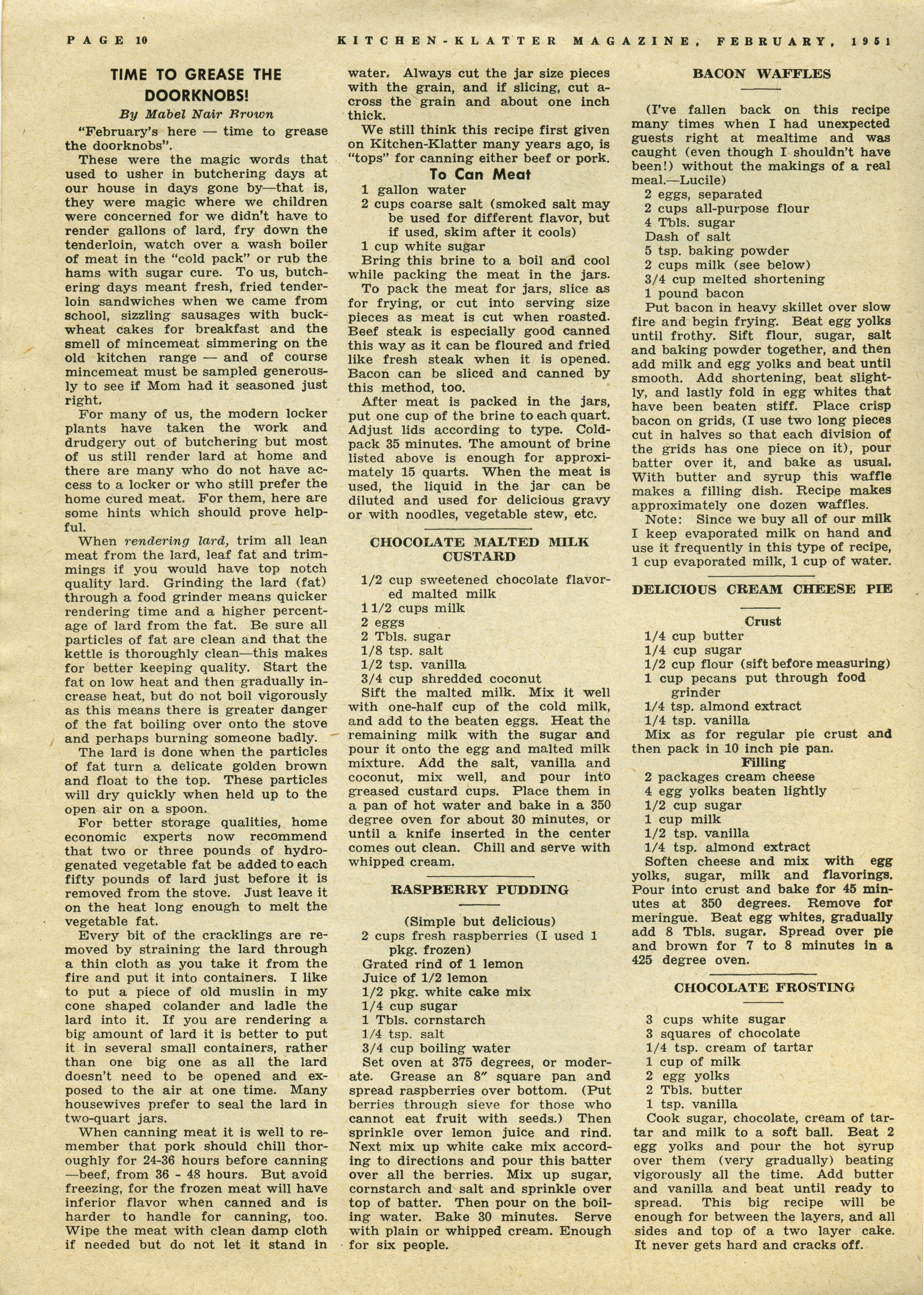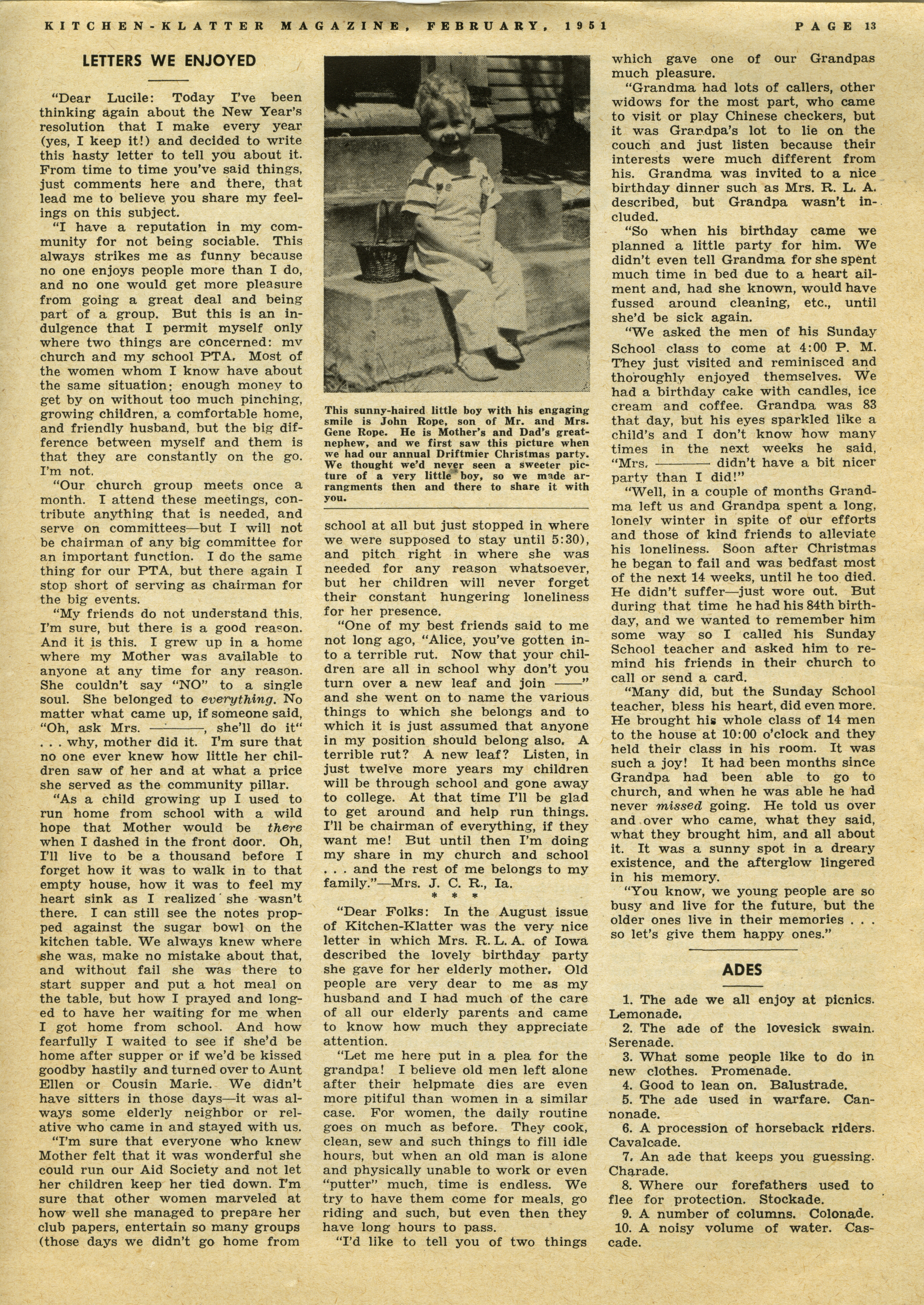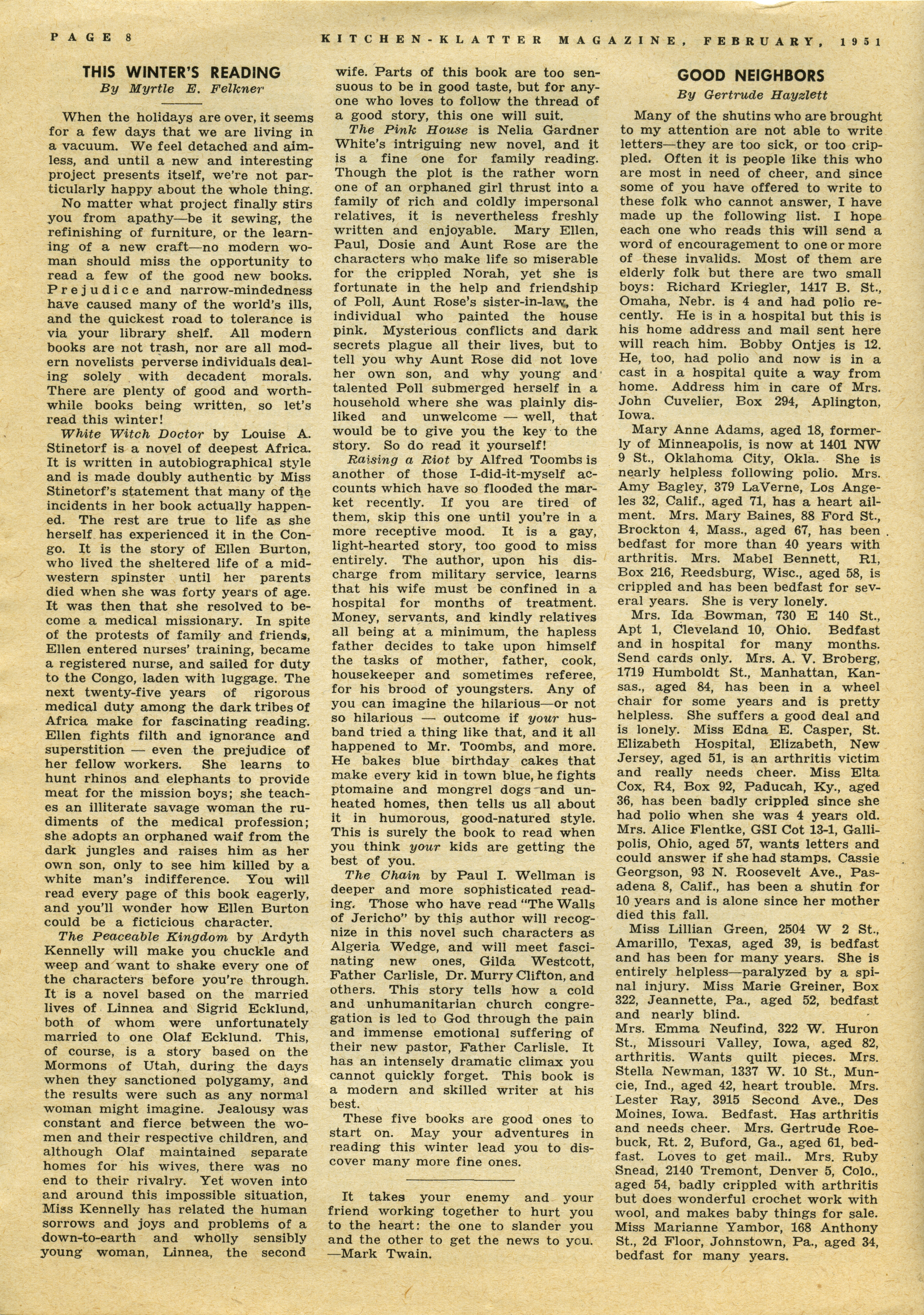 - "Kitchen-Klatter v. 16, n. 02, 1951", Kitchen-Klatter Magazine Issues, Iowa State University Library Digital Collections