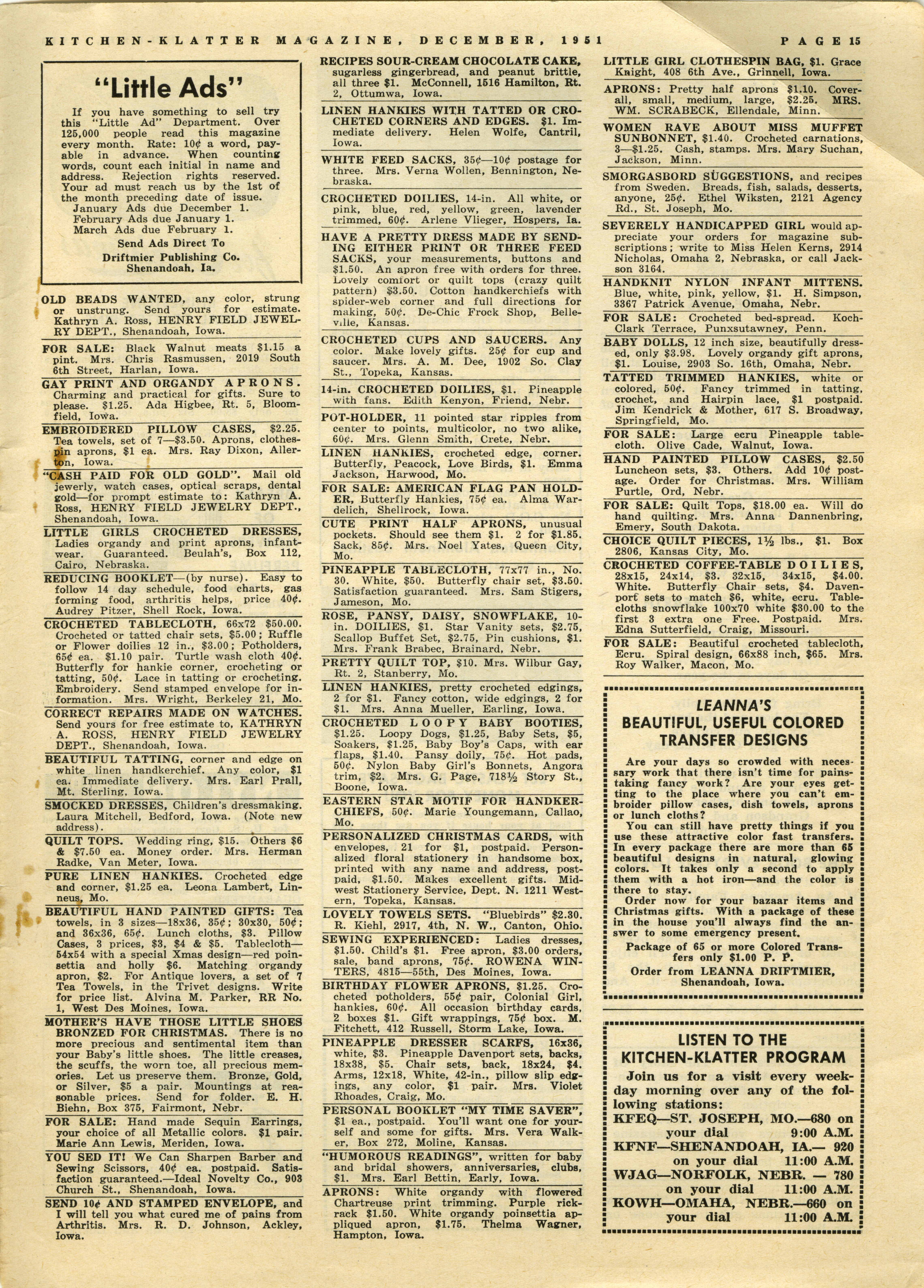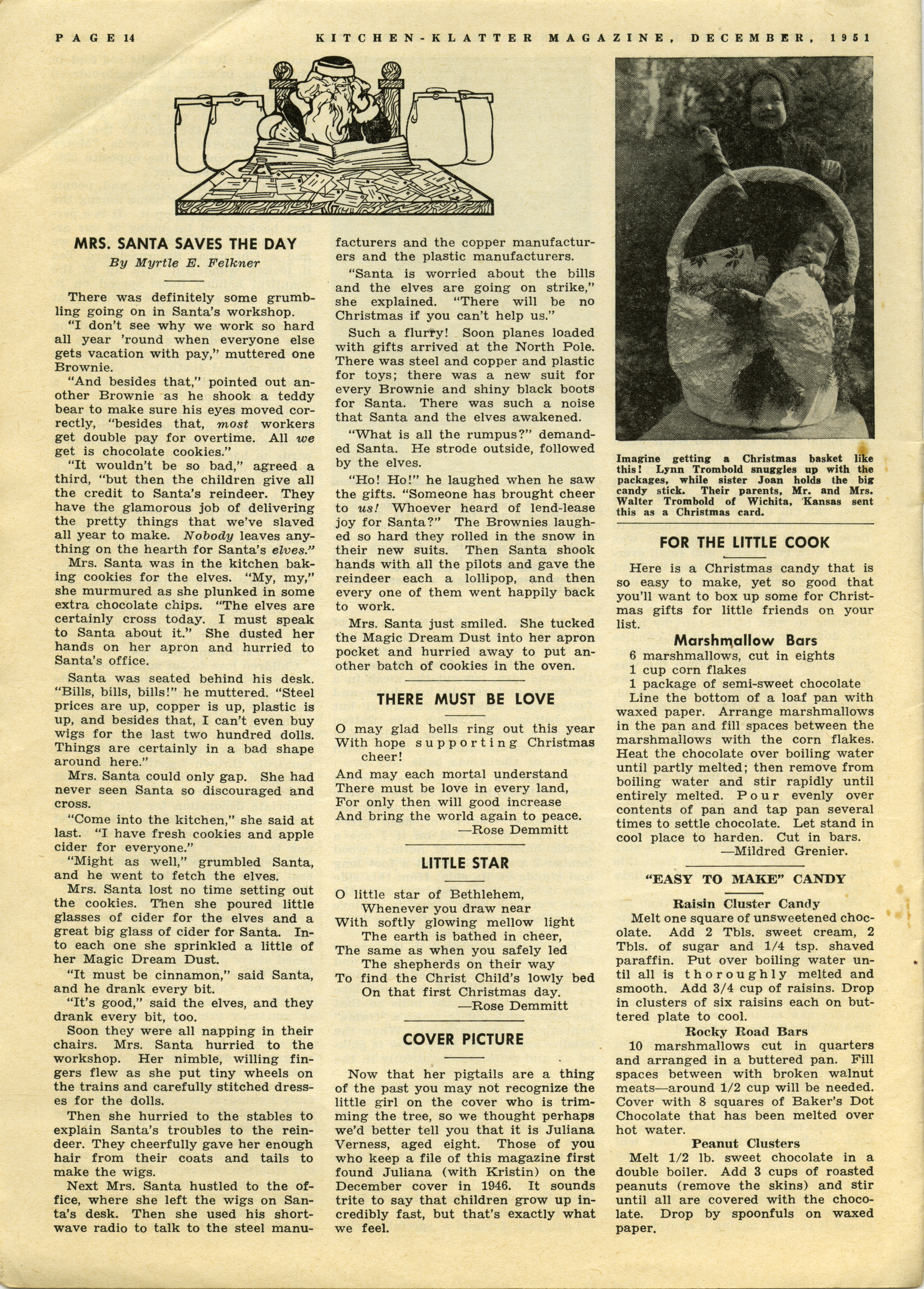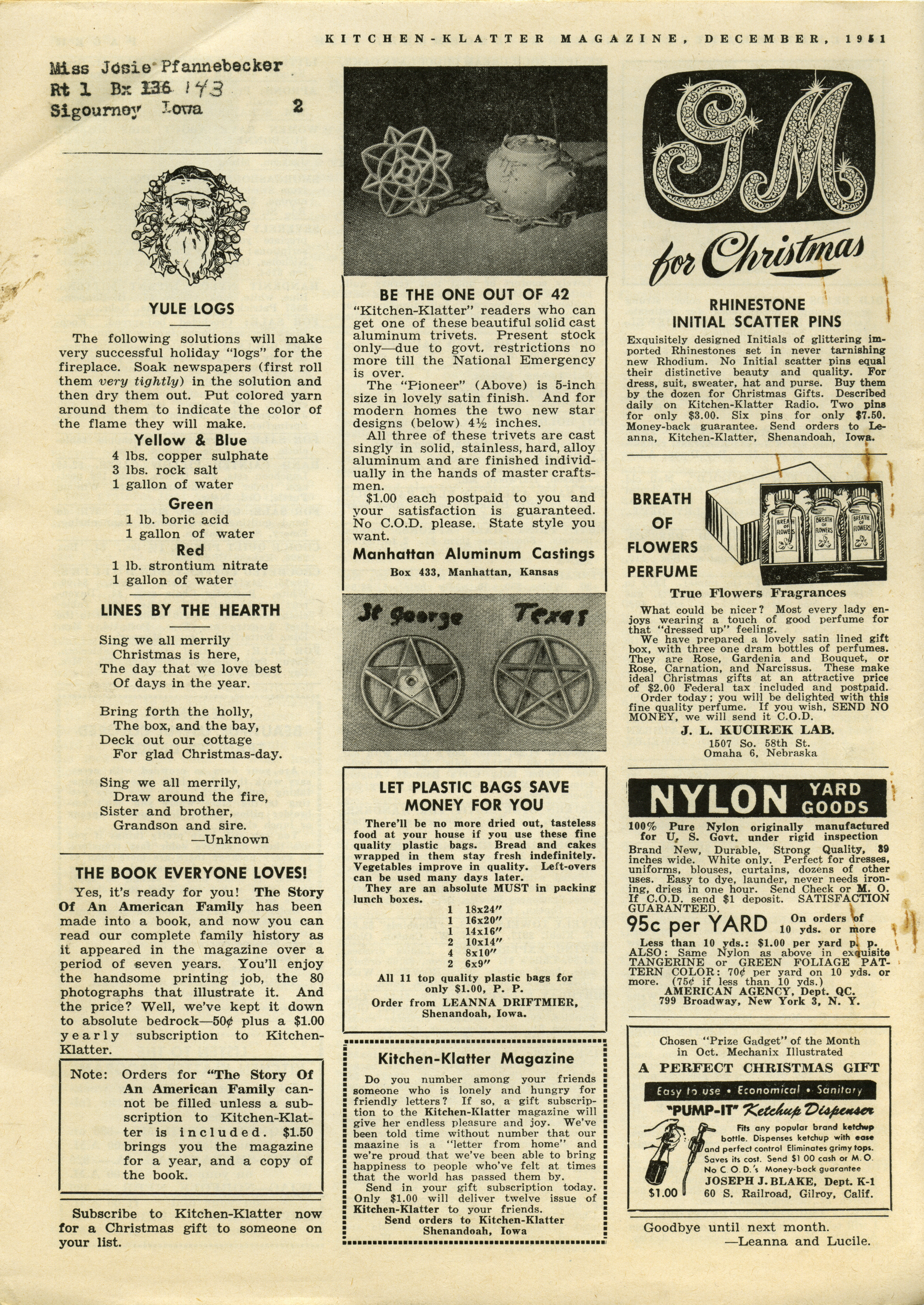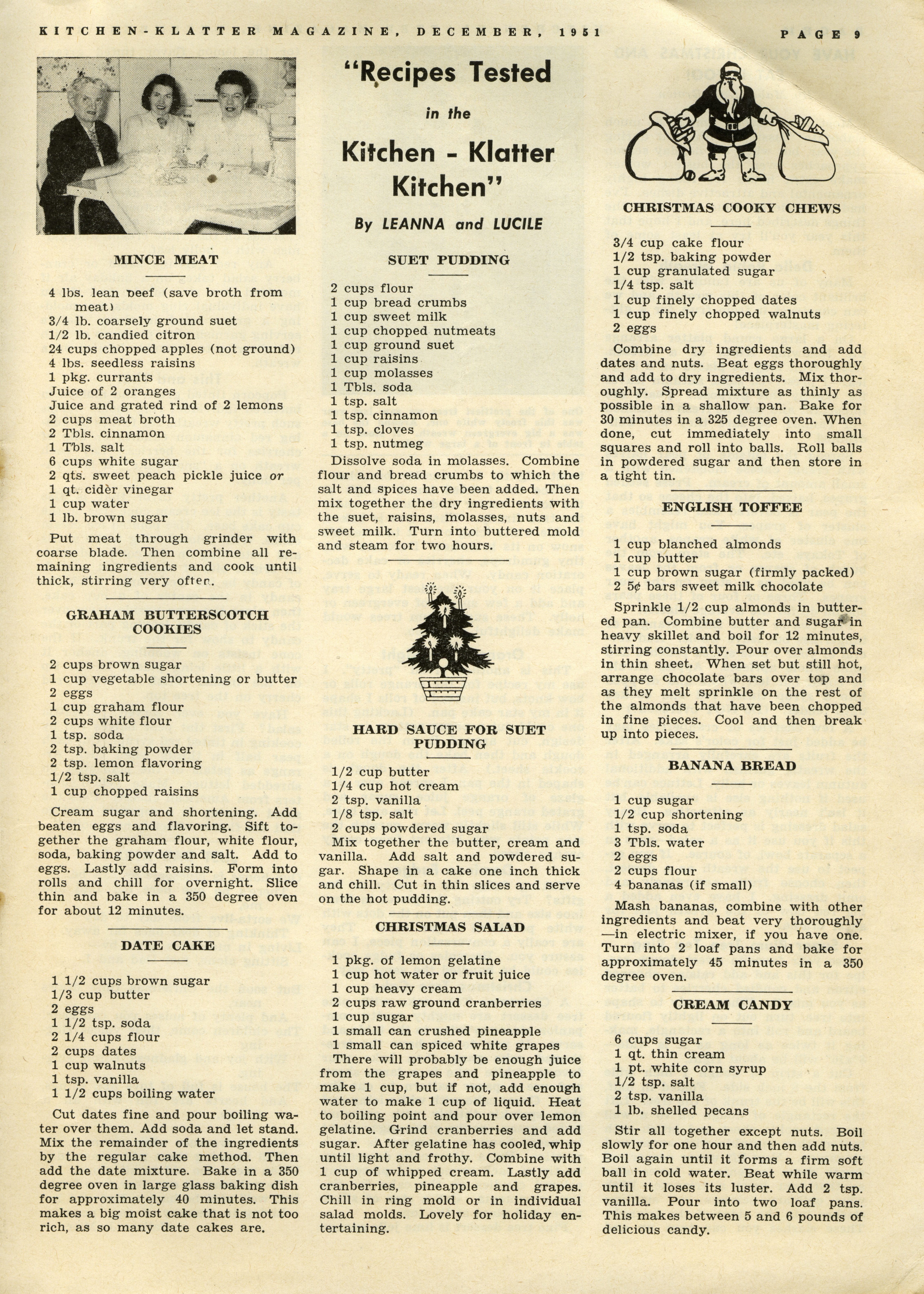 - "Kitchen-Klatter v. 16, n. 12, 1951", Kitchen-Klatter Magazine Issues, Iowa State University Library Digital Collections