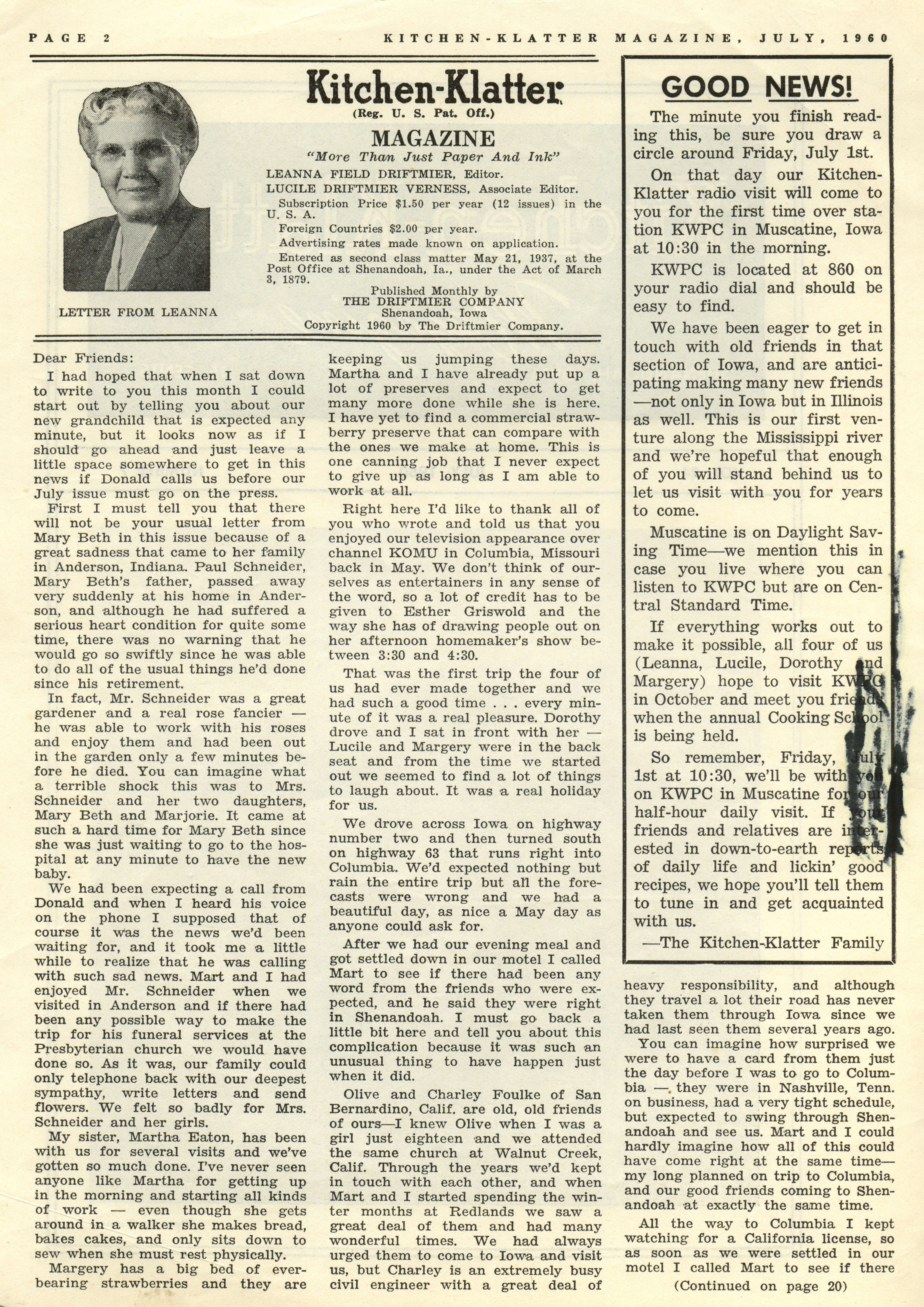 - Kitchen-Klatter began as a half-hour radio show with Leanna Driftmier sharing household tips, recipes, and childrearing advice among other topics. The radio show aired from 1926 to 1986, making it the longest-running homemaker program in the history of radio. Kitchen-Klatter magazine was issued monthly from 1936 to 1986 and at one point had a circulation of 150,000.
