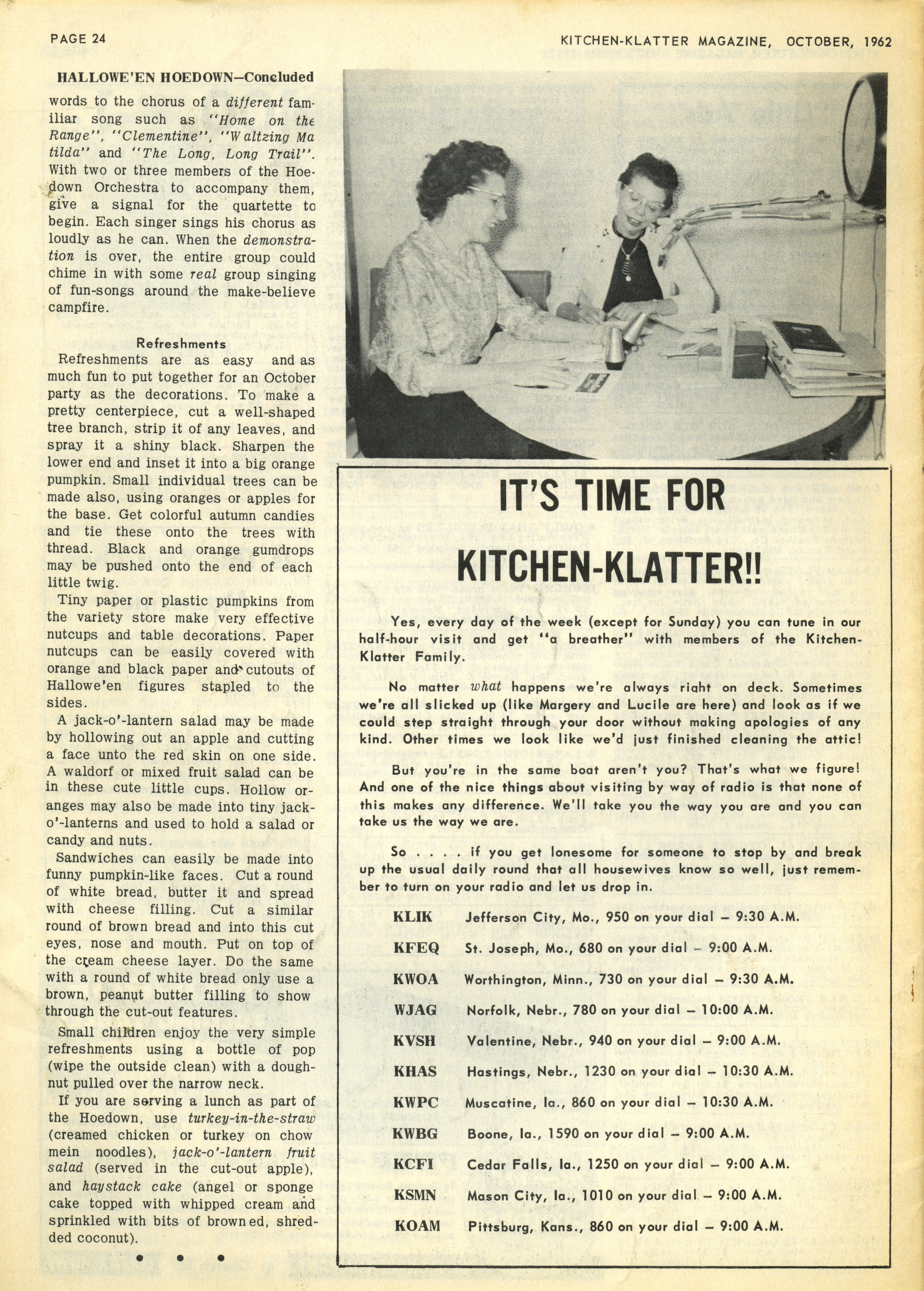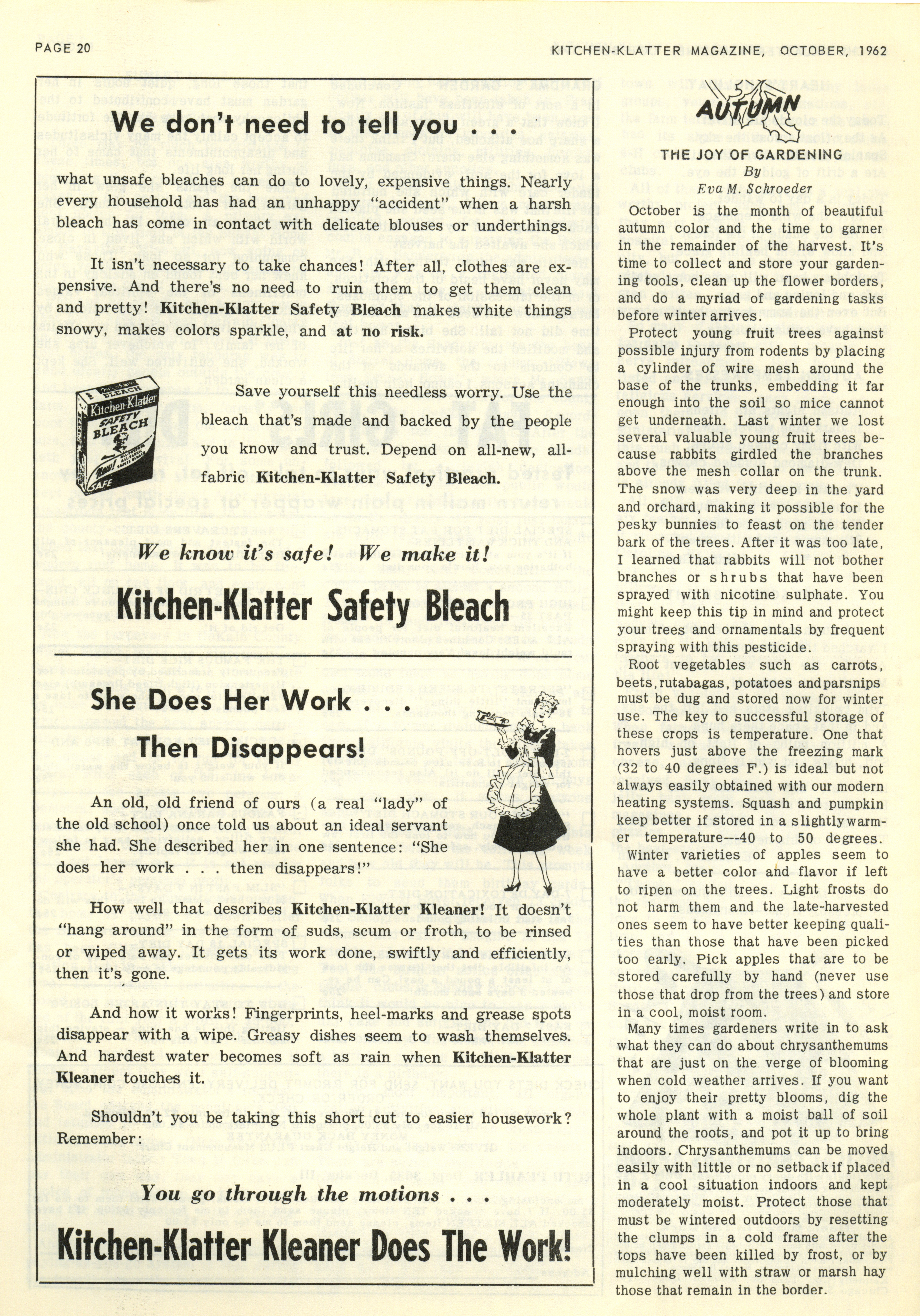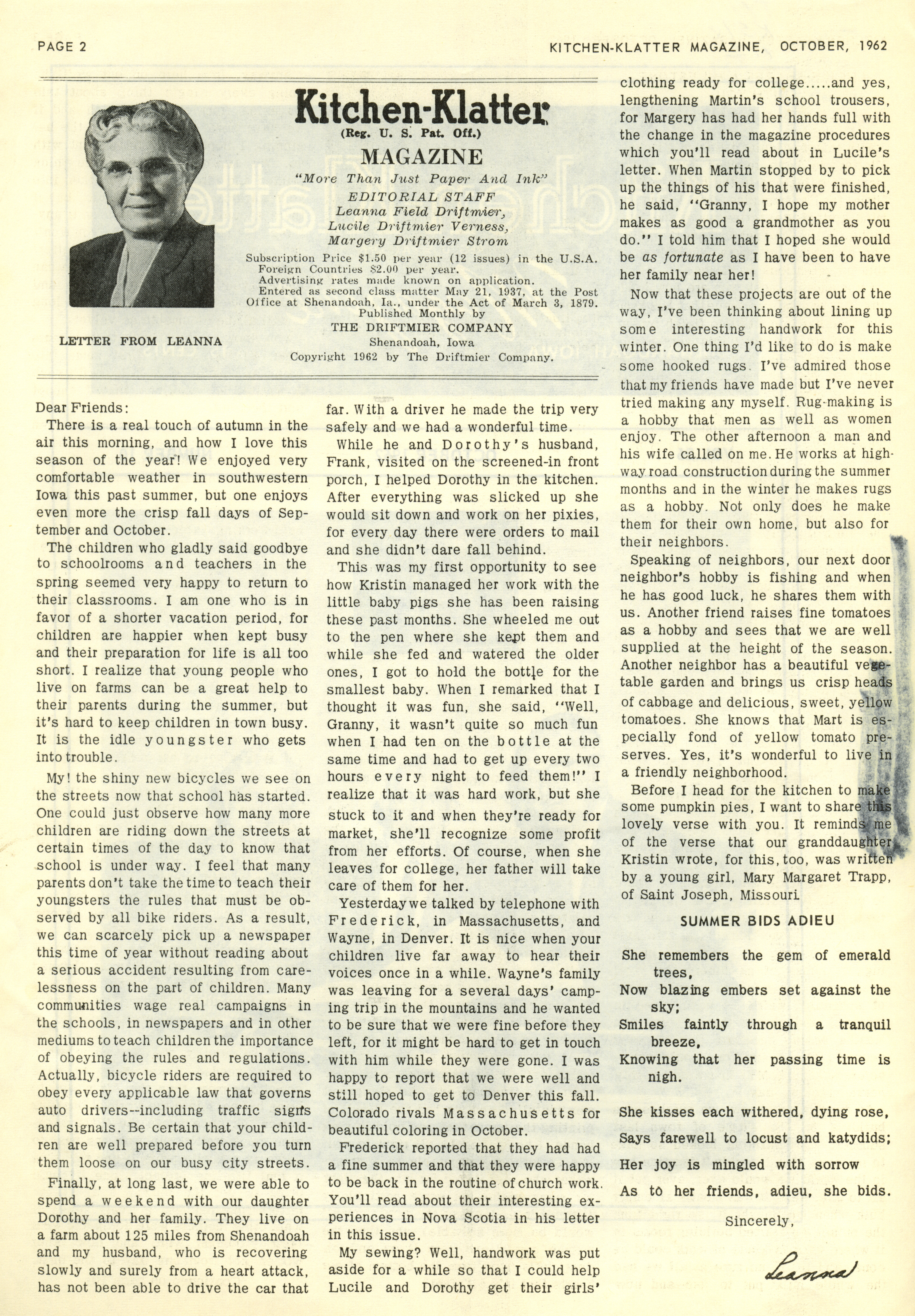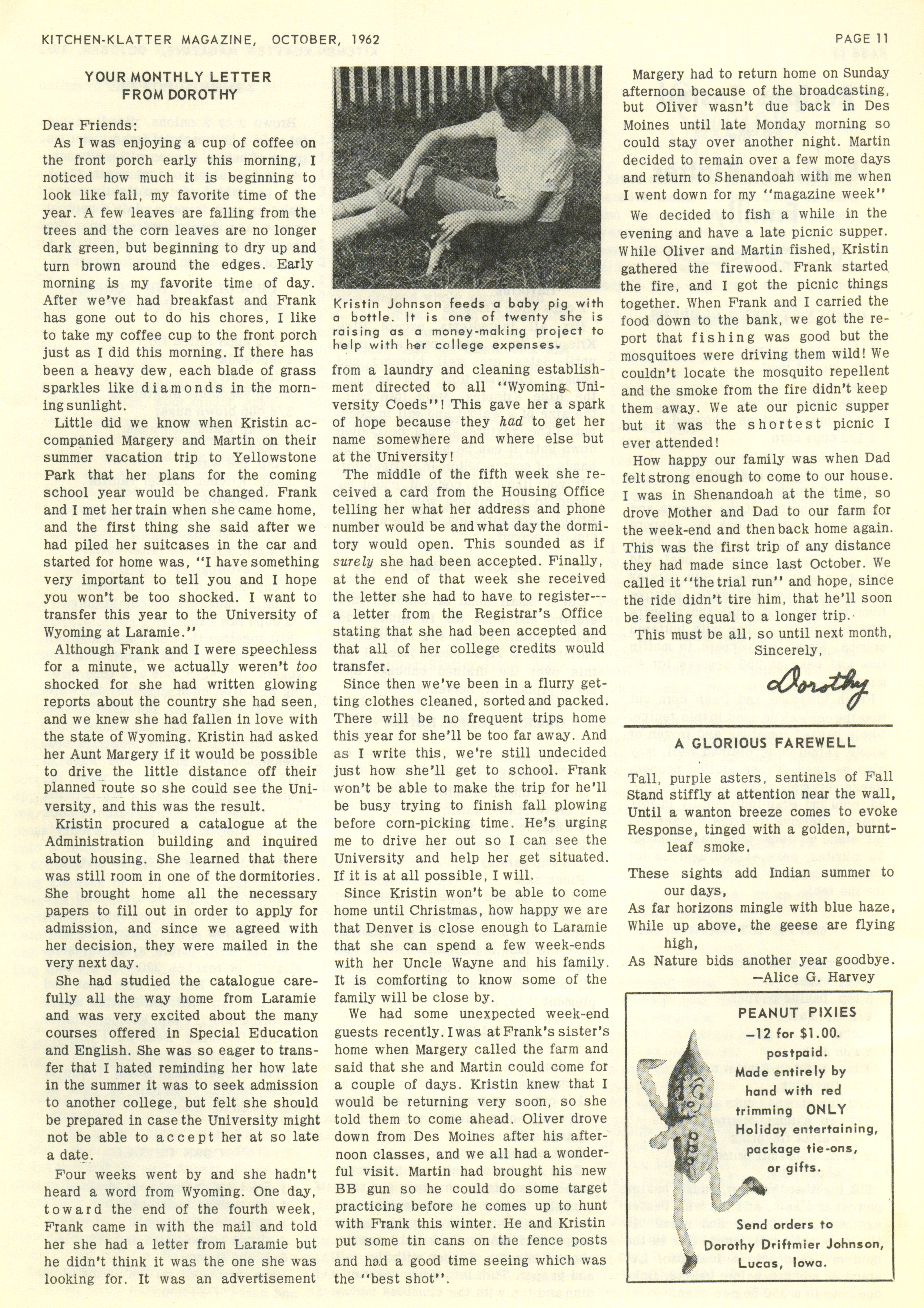- "Kitchen-Klatter v. 26, n. 10, 1962", Kitchen-Klatter Magazine Issues, Iowa State University Library Digital Collections