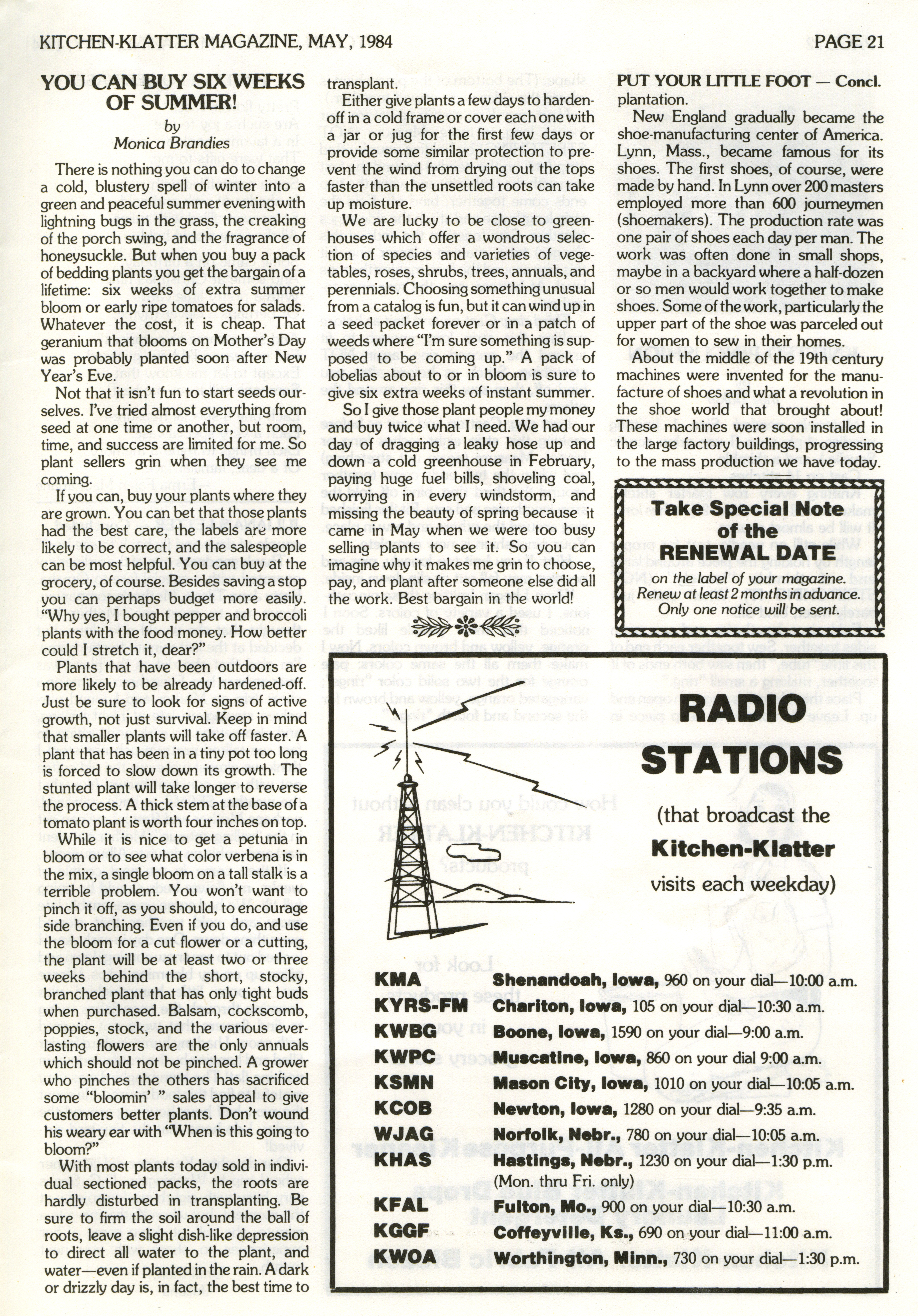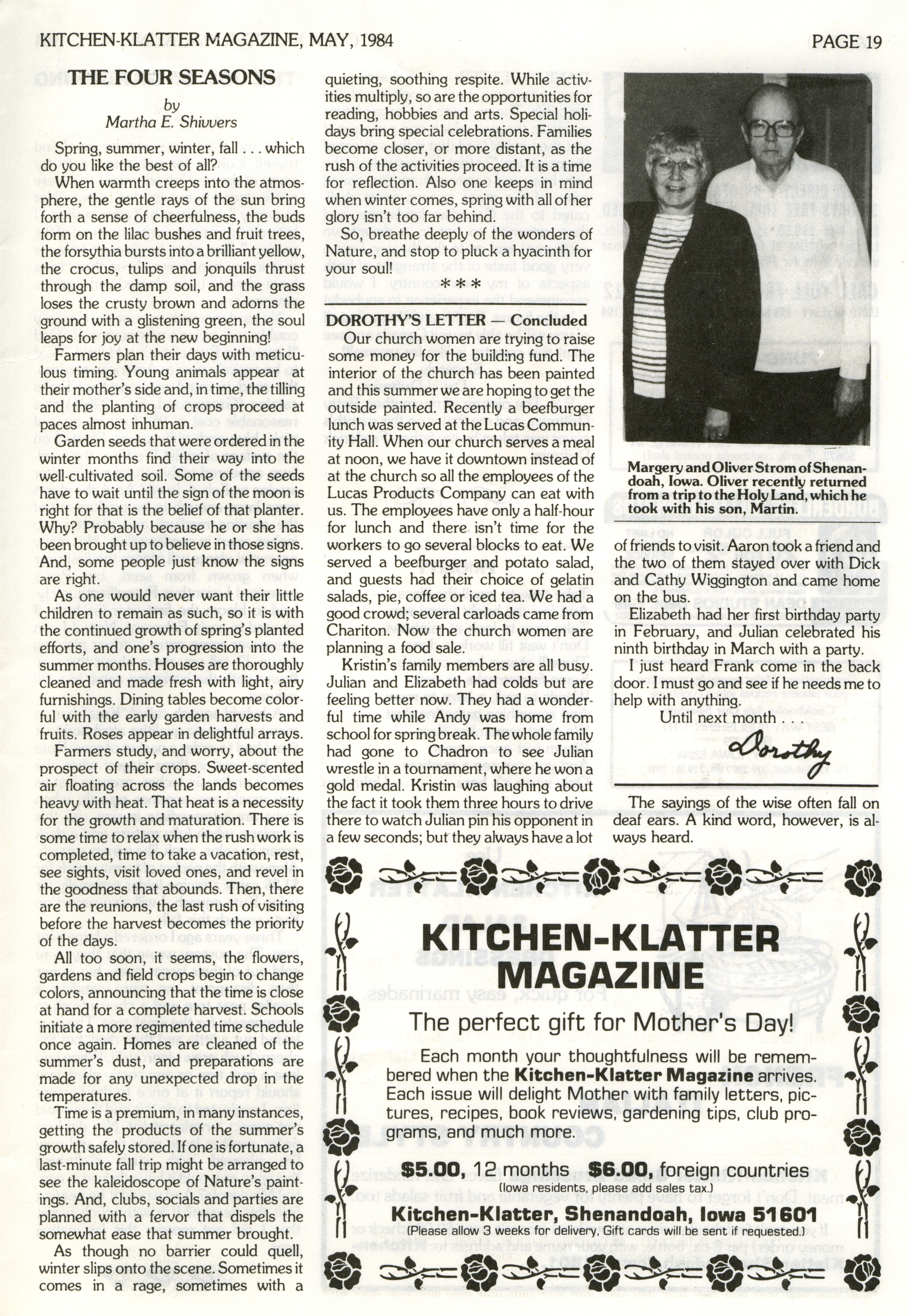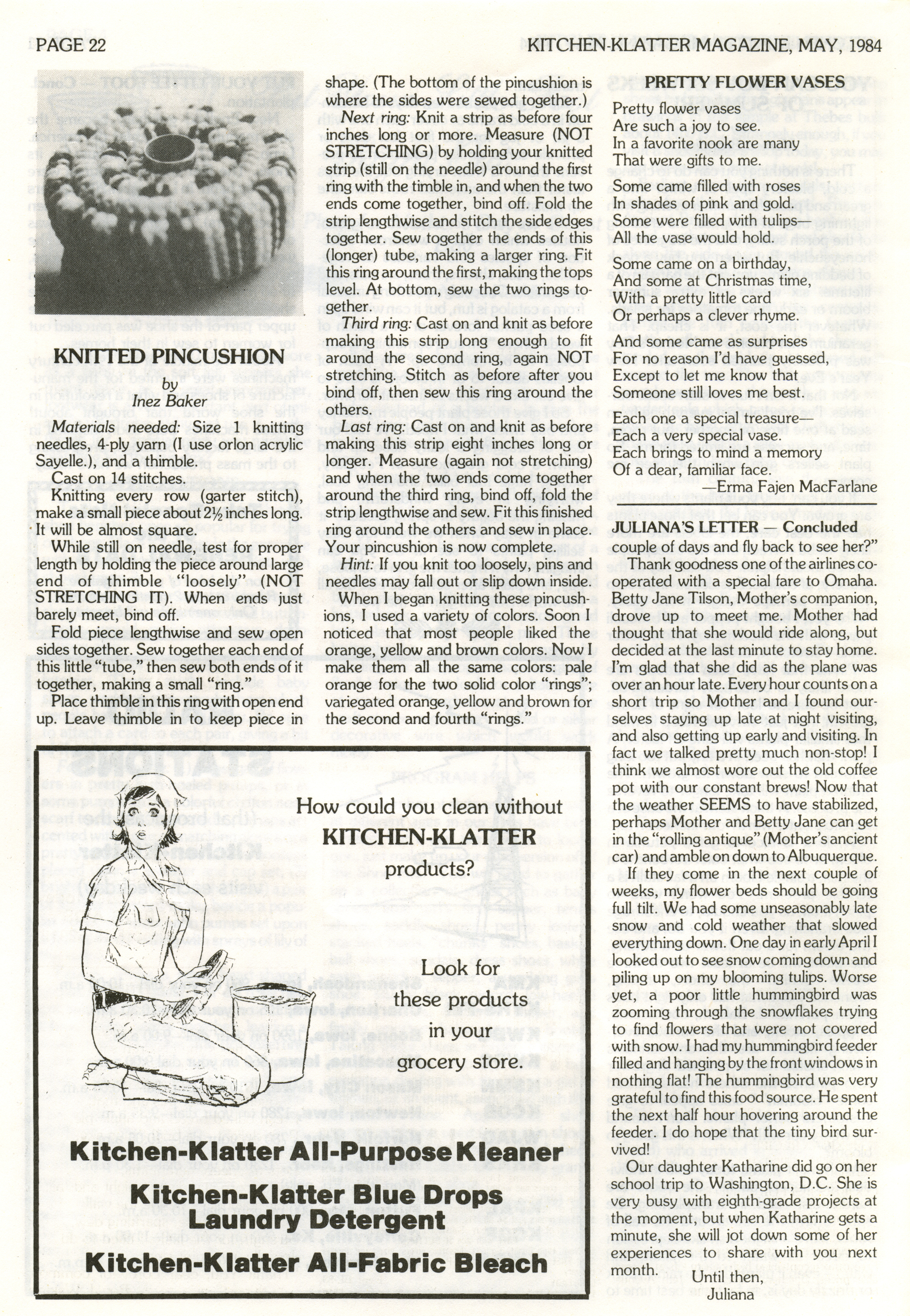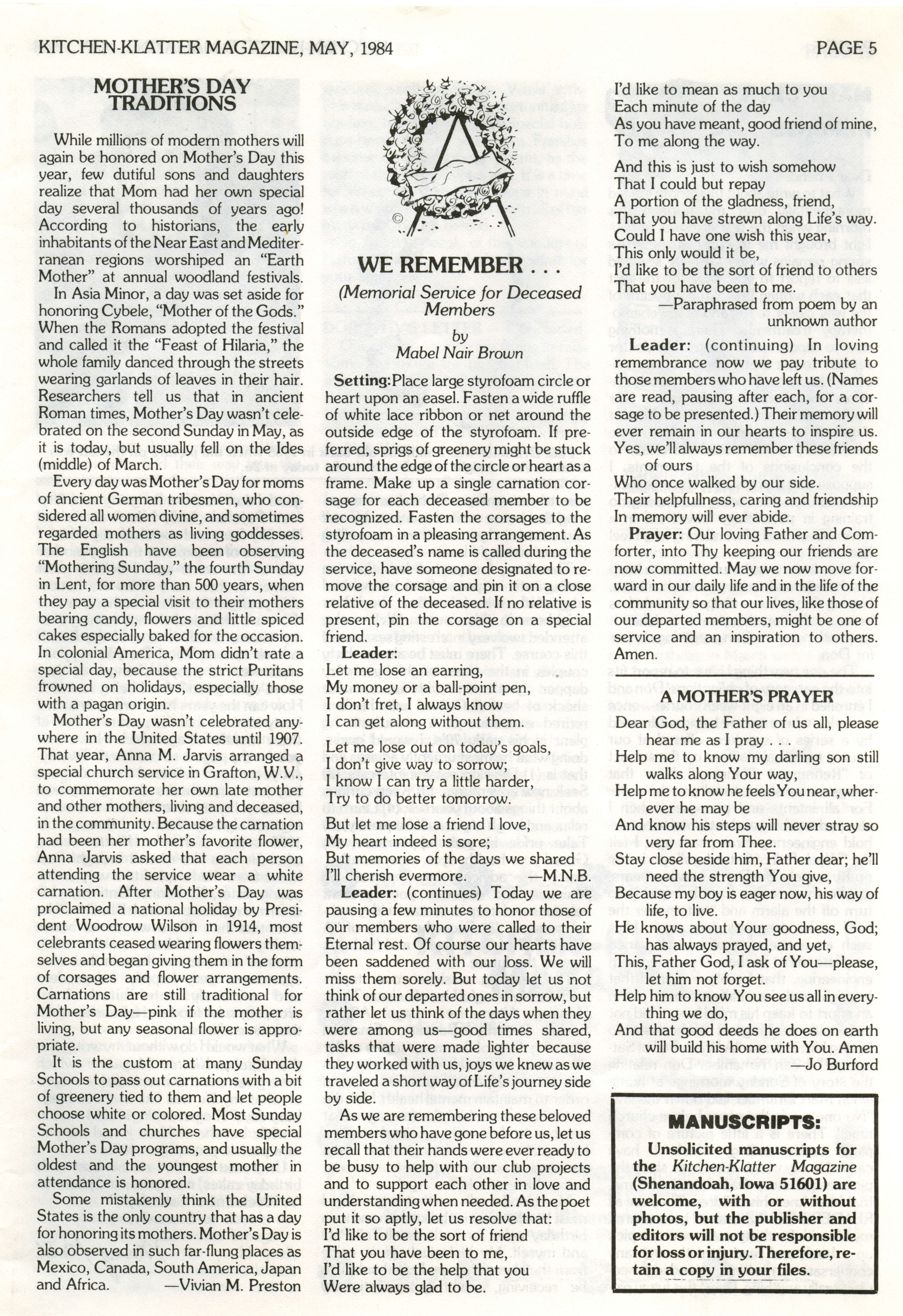 - "Kitchen-Klatter v. 48, n. 05, 1984", Kitchen-Klatter Magazine Issues, Iowa State University Library Digital Collections