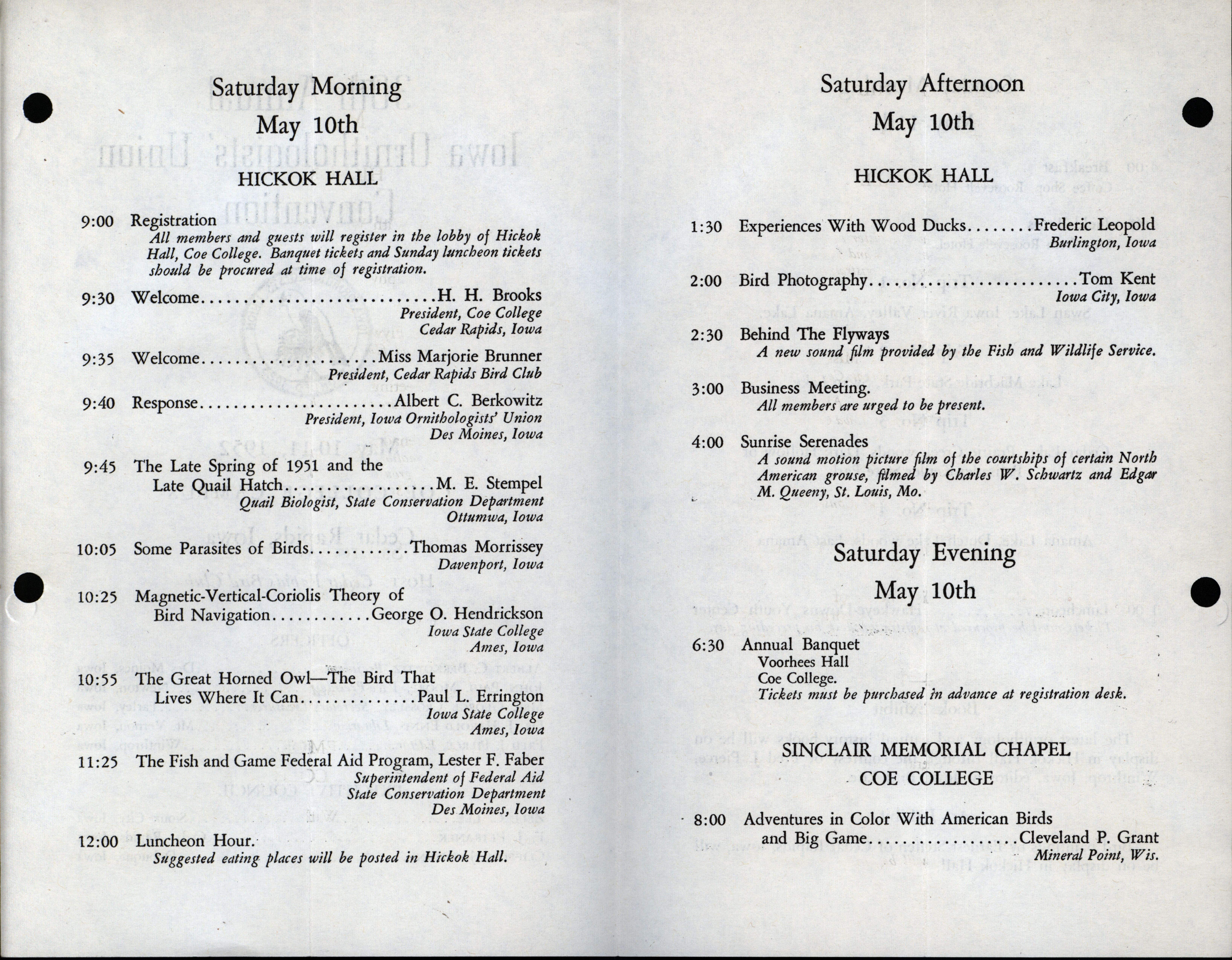 - The program for the 30th Annual Iowa Ornithologists' Union Convention which was held May 10-11, 1952, on the campus of Coe College. The Cedar Rapids Bird Club was the host for the event. Frederic Leopold was one of the featured speakers and gave a presentation titled "Experiences with wood ducks." This document is related to correspondence discussing the convention.