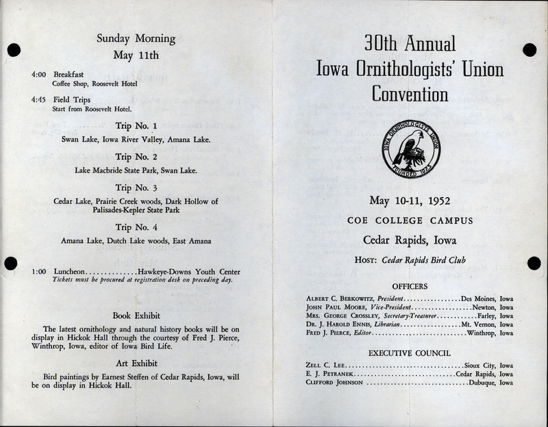 - "30th Annual Iowa Ornithologists' Union Convention program, May 10-11, 1952", Frederic Leopold Collection, Iowa State University Library Digital Collections