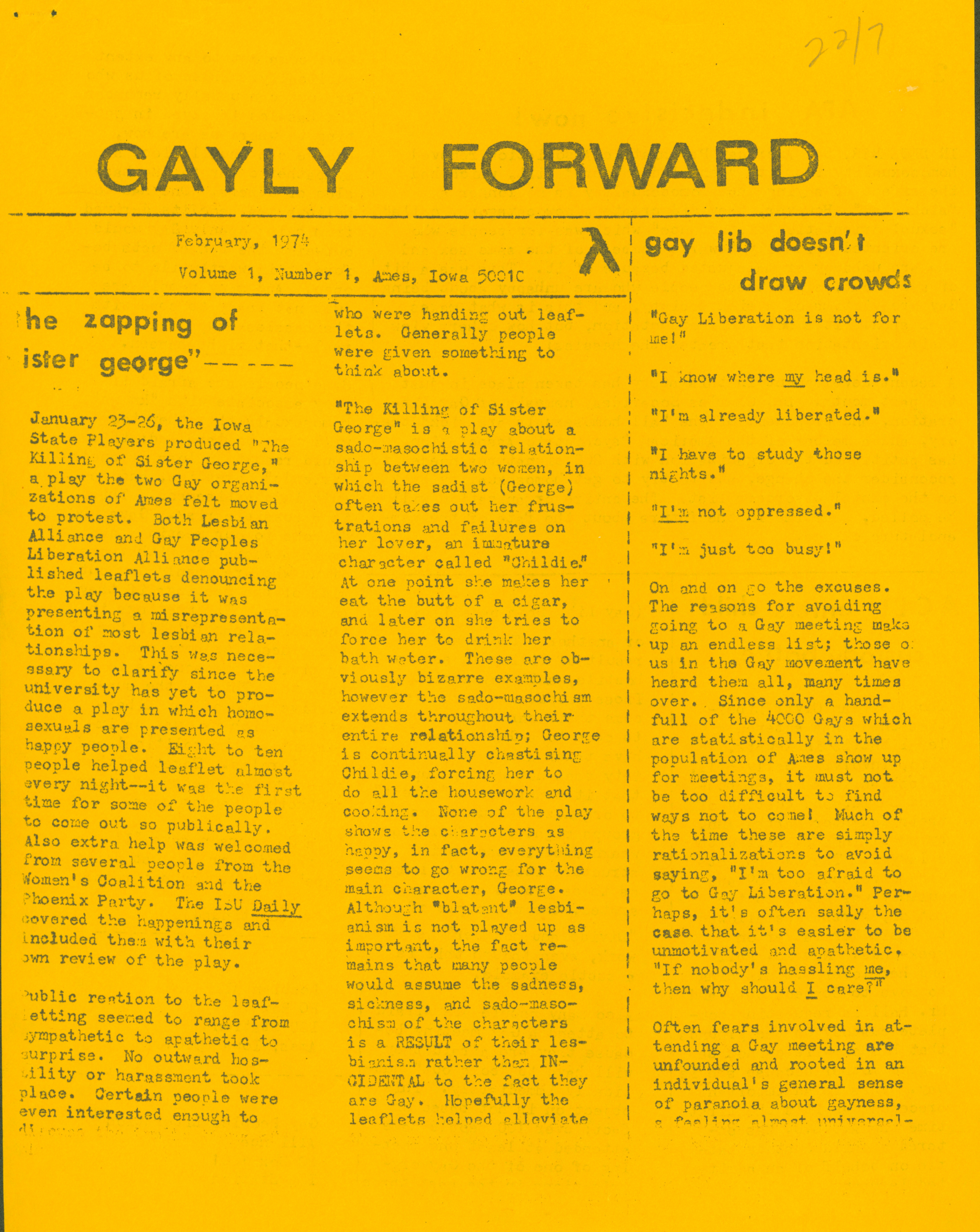 - Newsletter entitled, "Gayly Forward" depicting stories of LGBT+ people at Iowa State and informing members of the community of what was happening at Iowa State University .