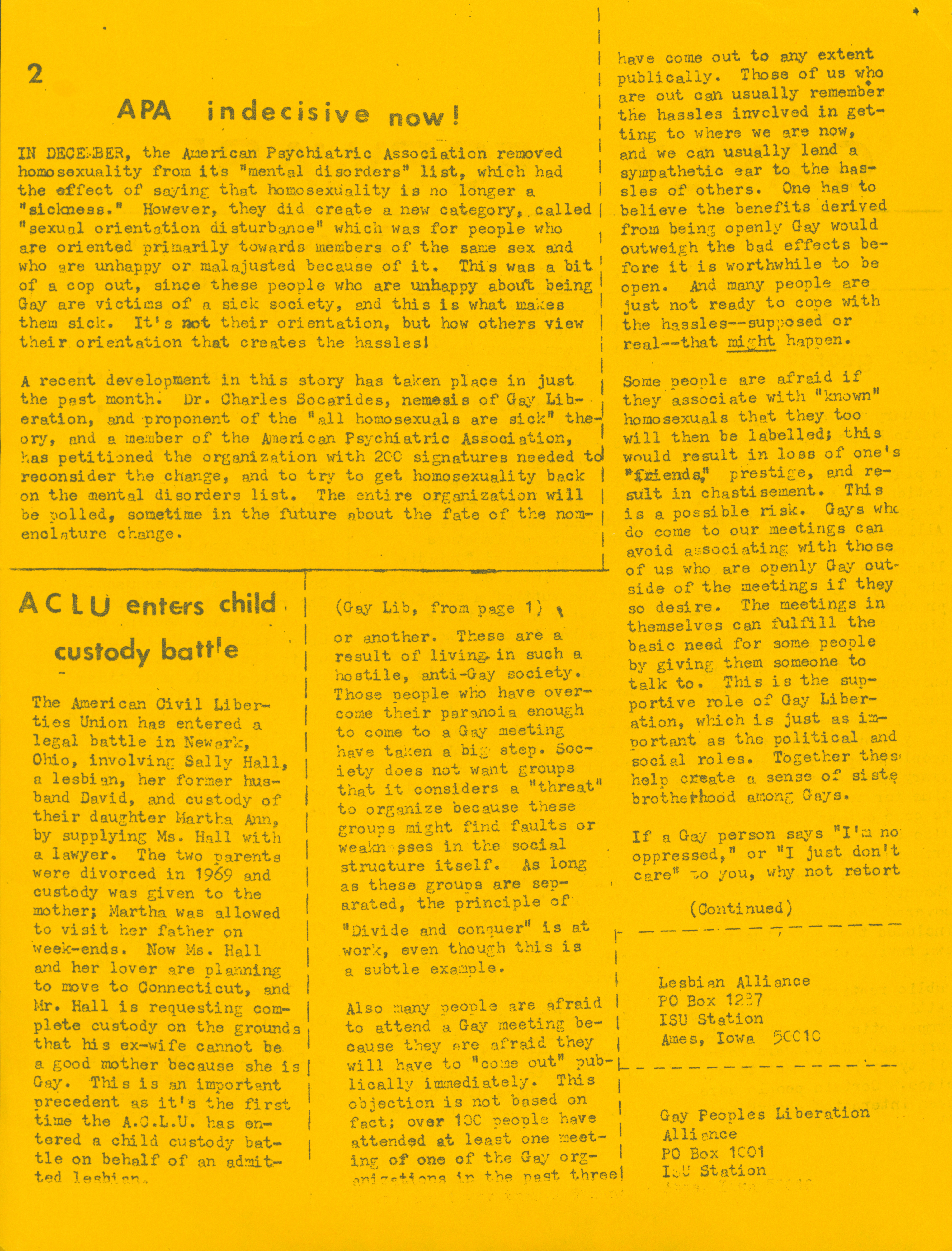 - "Gayly forward, February 1974", LGBT+ student life at Iowa State University collection, Iowa State University Library Digital Collections