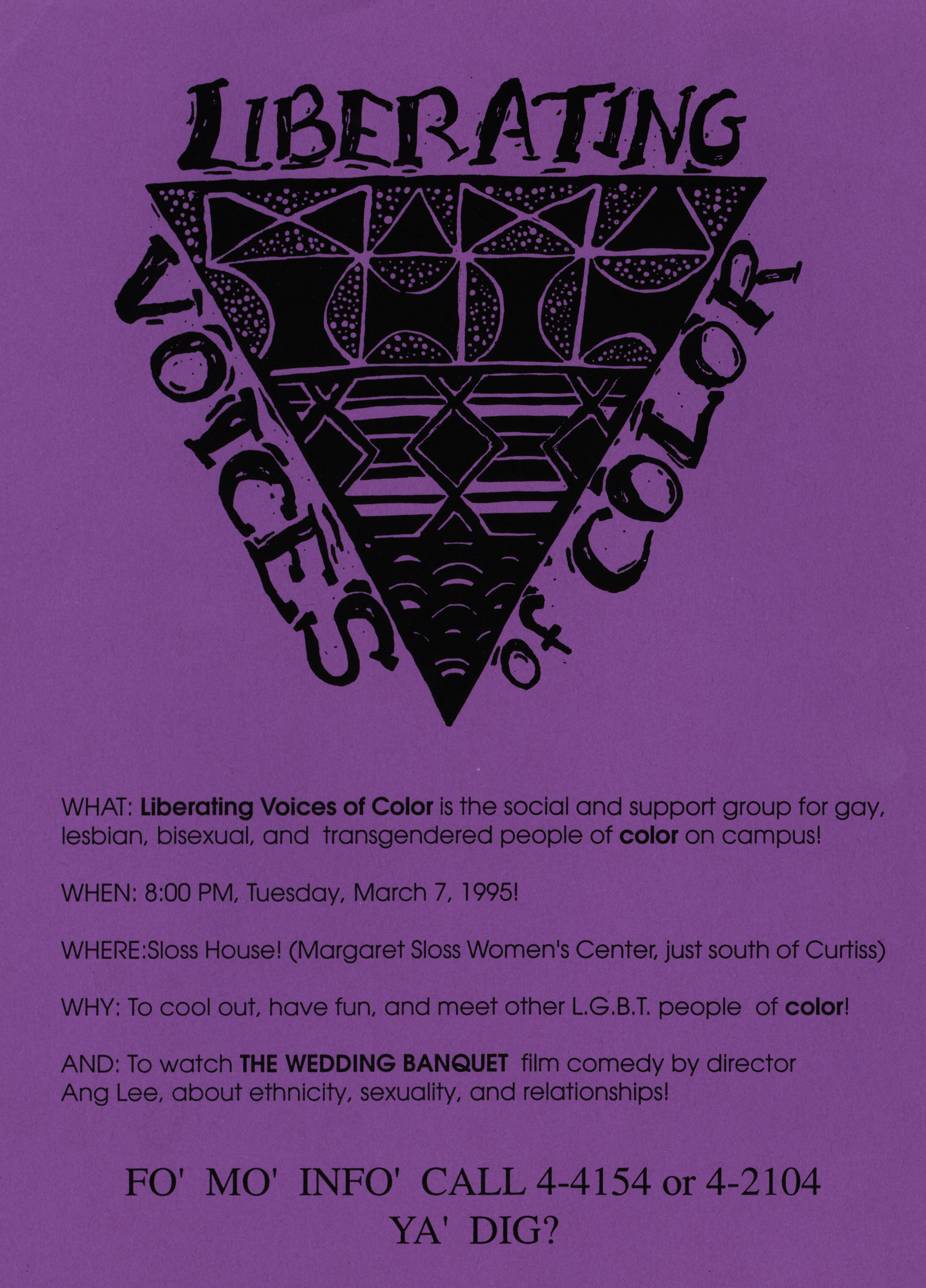 - Flier promoting a banquet entitled, "Liberating Voices of Color." The event was in support for gay, lesbian, bisexual, and transgendered people of color on campus.