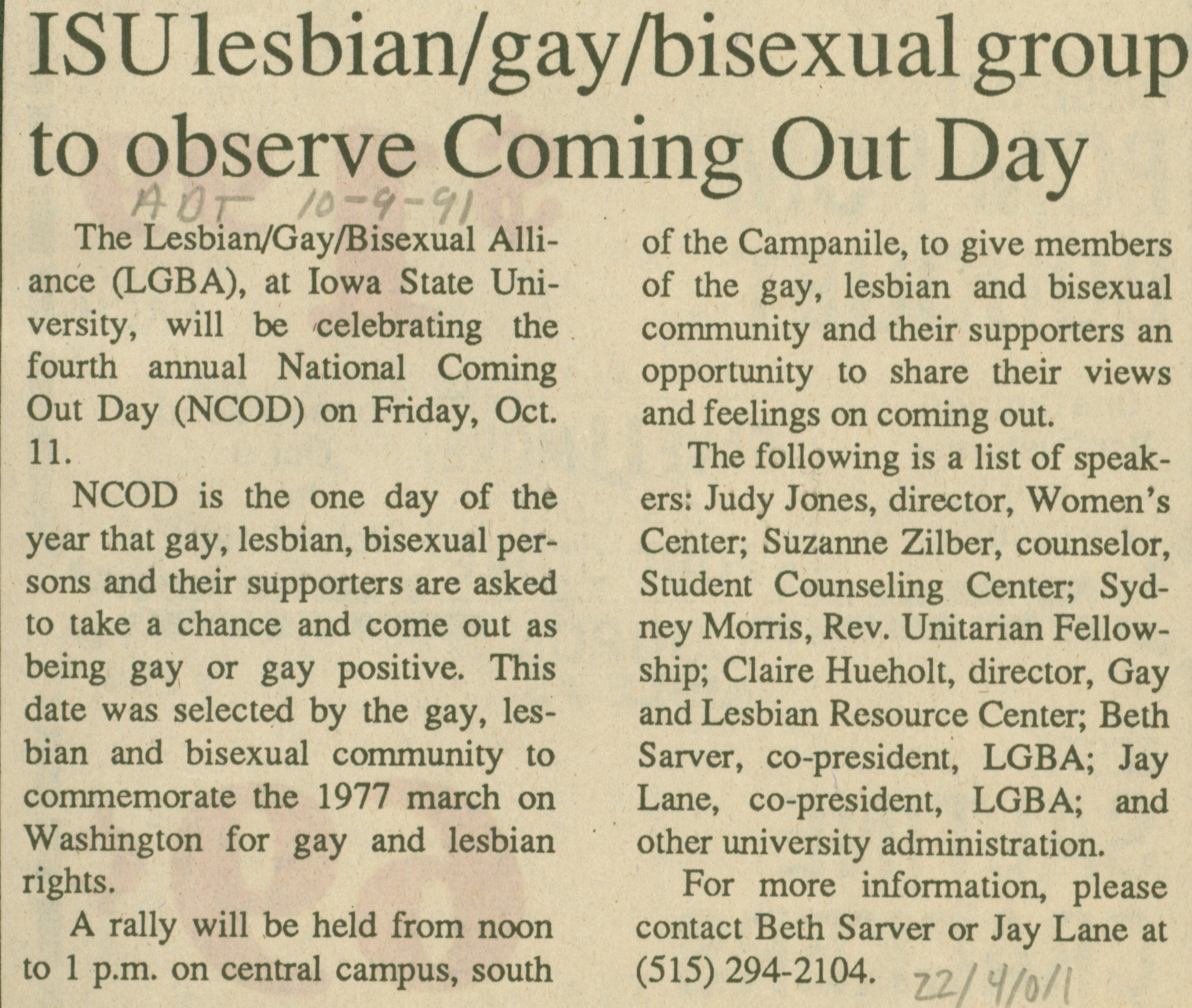 - Iowa State Daily article discussing Lesbian/Gay/Bisexual Alliance (LGBA) celebration of Coming Out Day at Iowa State University.
