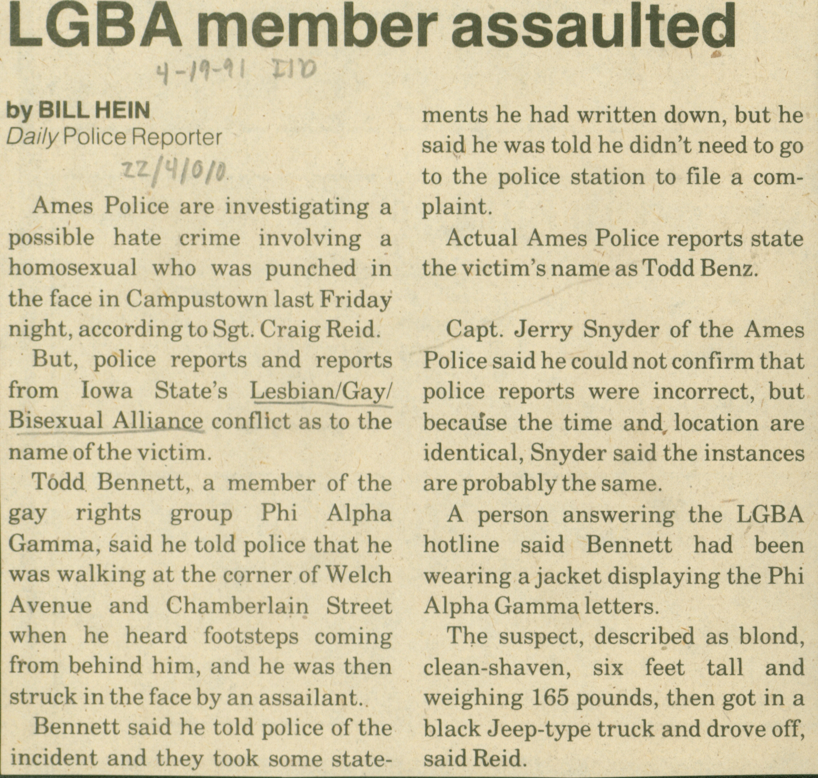 LGBA member assaulted (Iowa State daily) Item Info