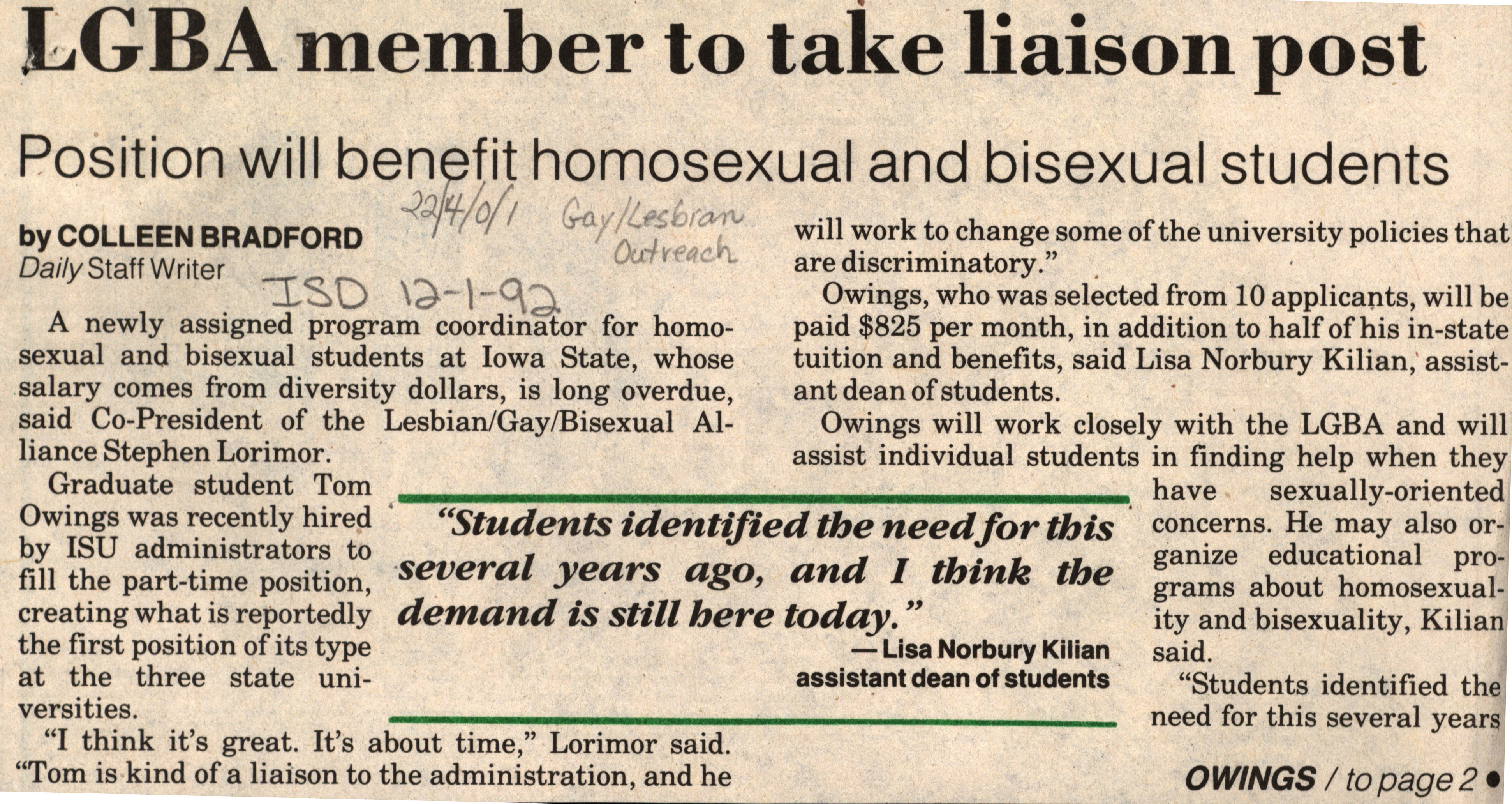 - LGBA member to take liaison post (Iowa State daily)