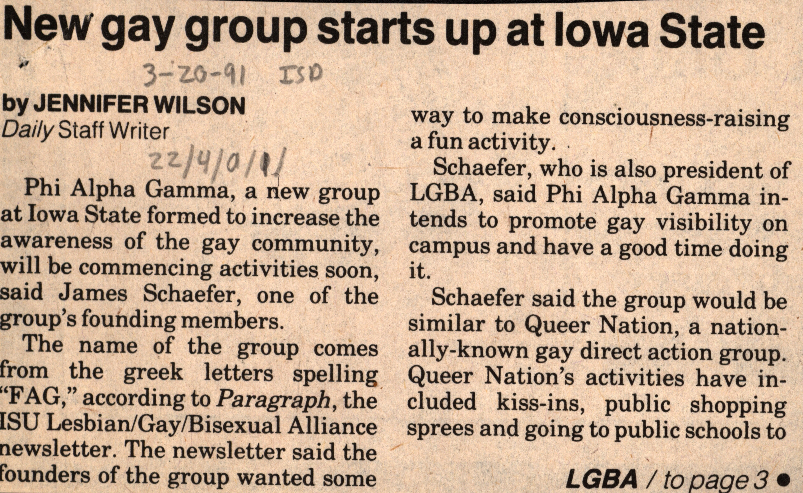 - Iowa State Daily article discussing a new student group on campus. The group, Phi Alpha Gamma, was formed to increase the awareness of the gay community at Iowa State University.