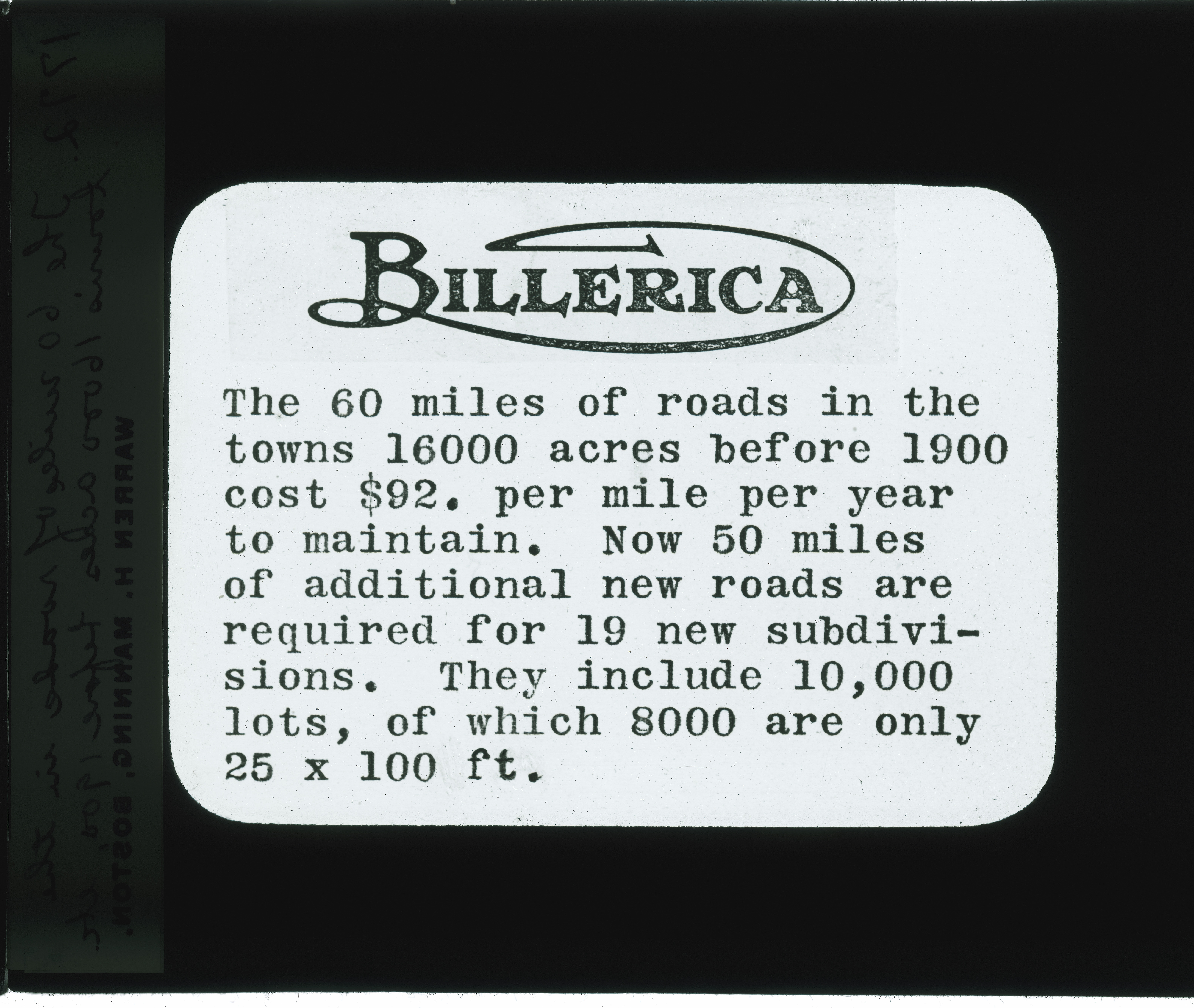 - Billerica Improvement Association, lecture word slide #10: "The 60 miles of roads in the towns 16000 acres before 1900 cost $92. per mile per year to maintain. Now 50 miles of additional new roads are required for 19 new subdivisions. They include 10,000 lots, of which 8000 are only 25 x 100 ft.".