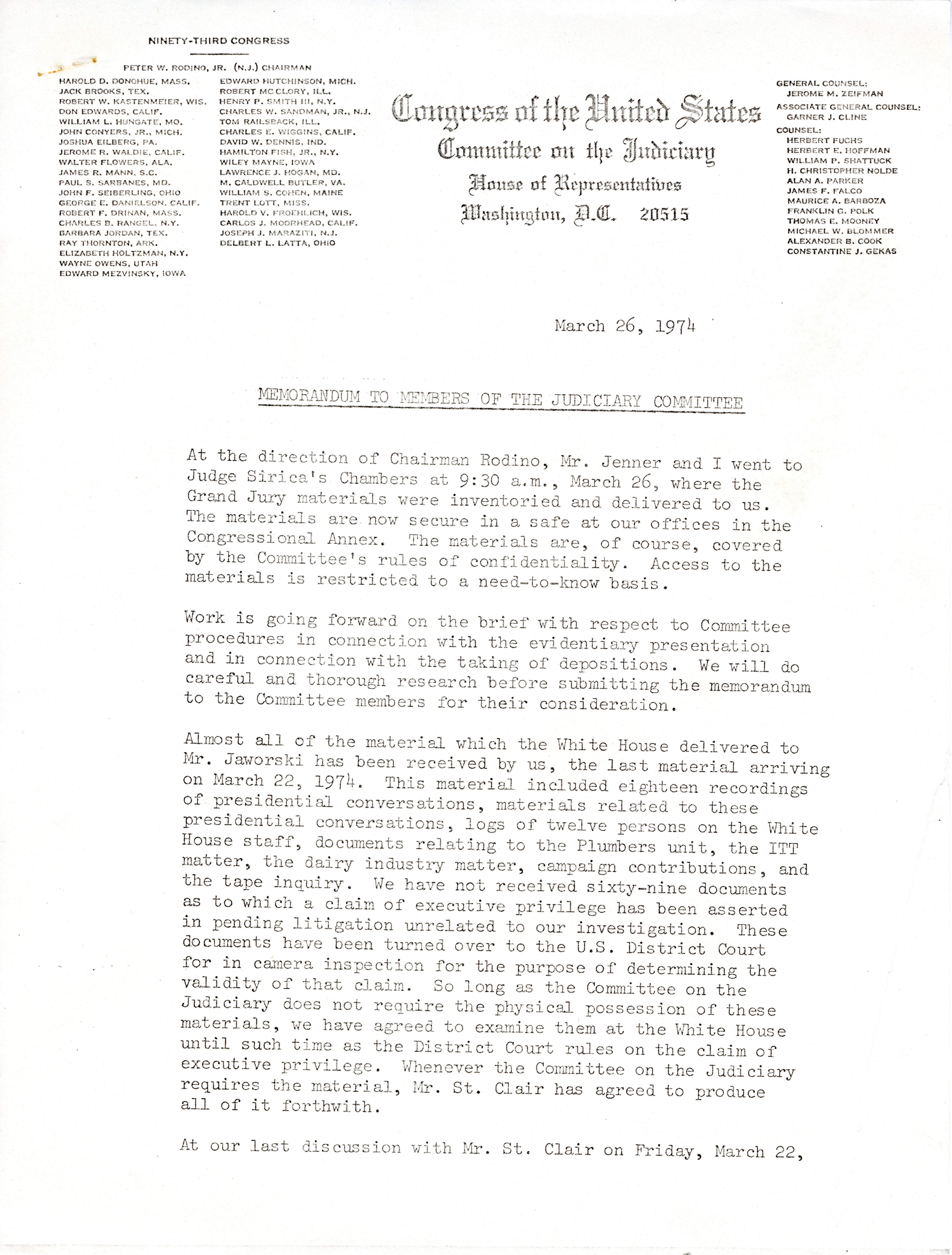 - Memorandum to Members of the Judiciary Committee from Special Counsel John Doar, March 26, 1974