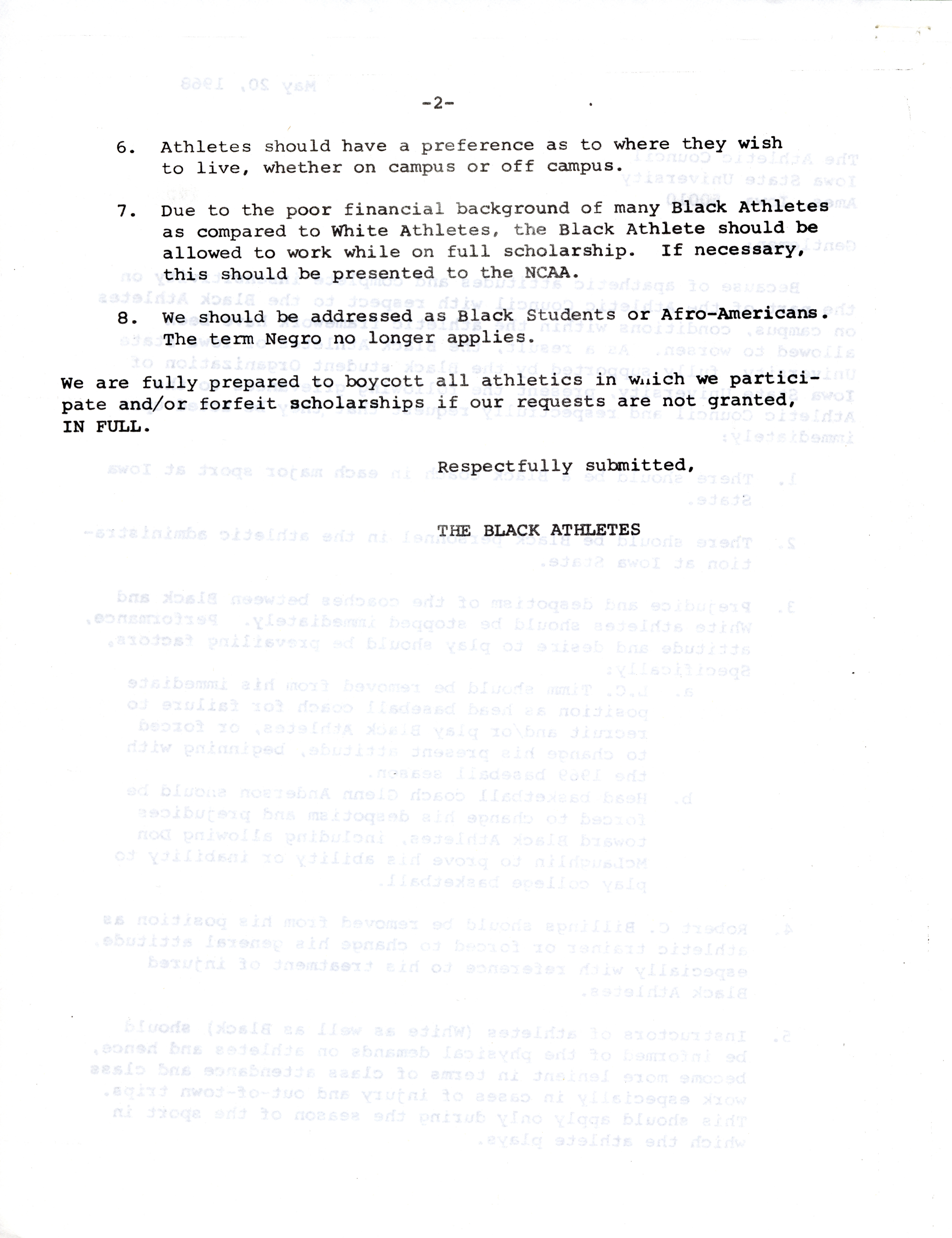 - Black athletes letter to the Iowa State University Athletic Council regarding eight grievances, May 20, 1968