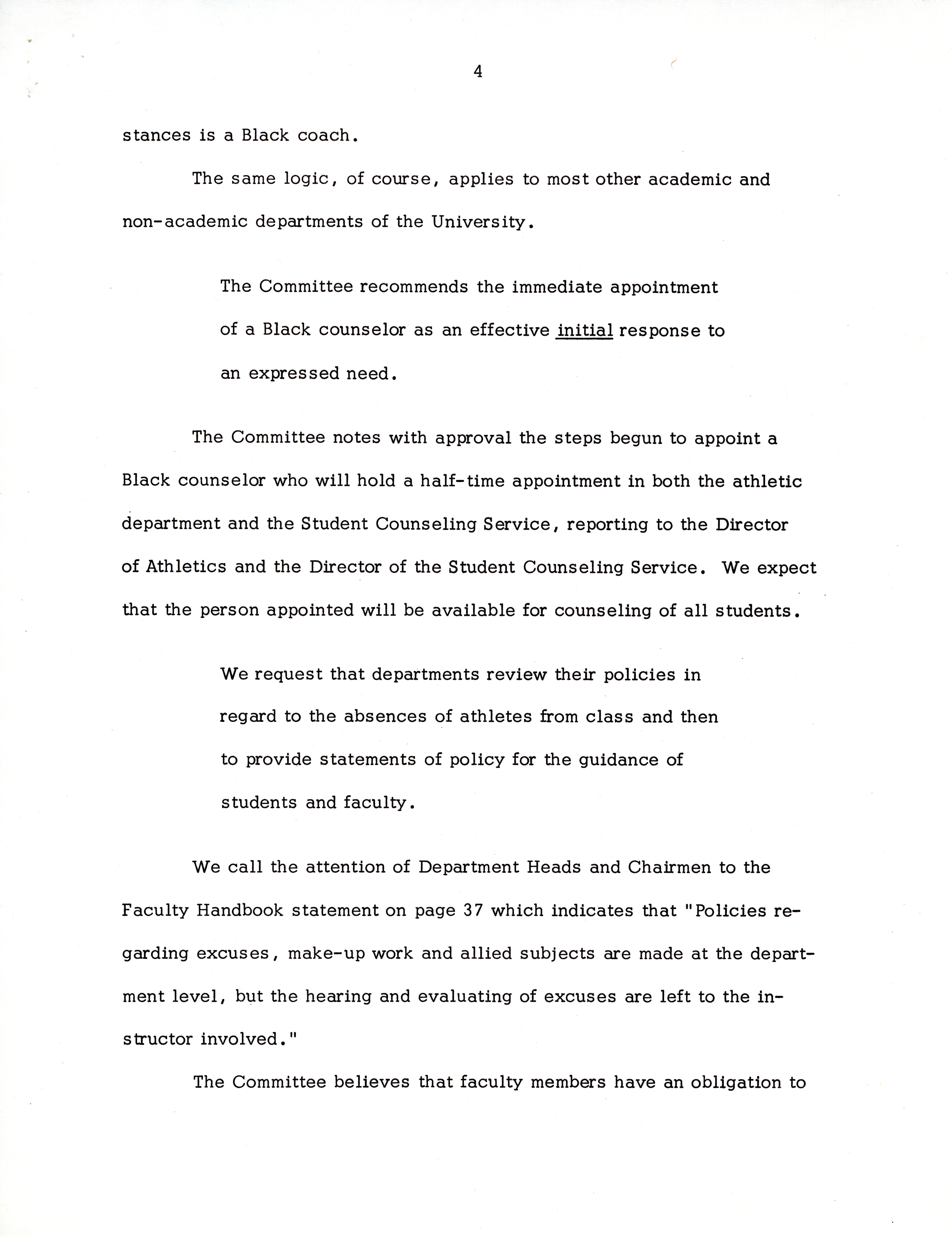 - Report of the special work requested by President Parks, the meeting with Athletic Department members and the Black Student Organization, and recommendations.
