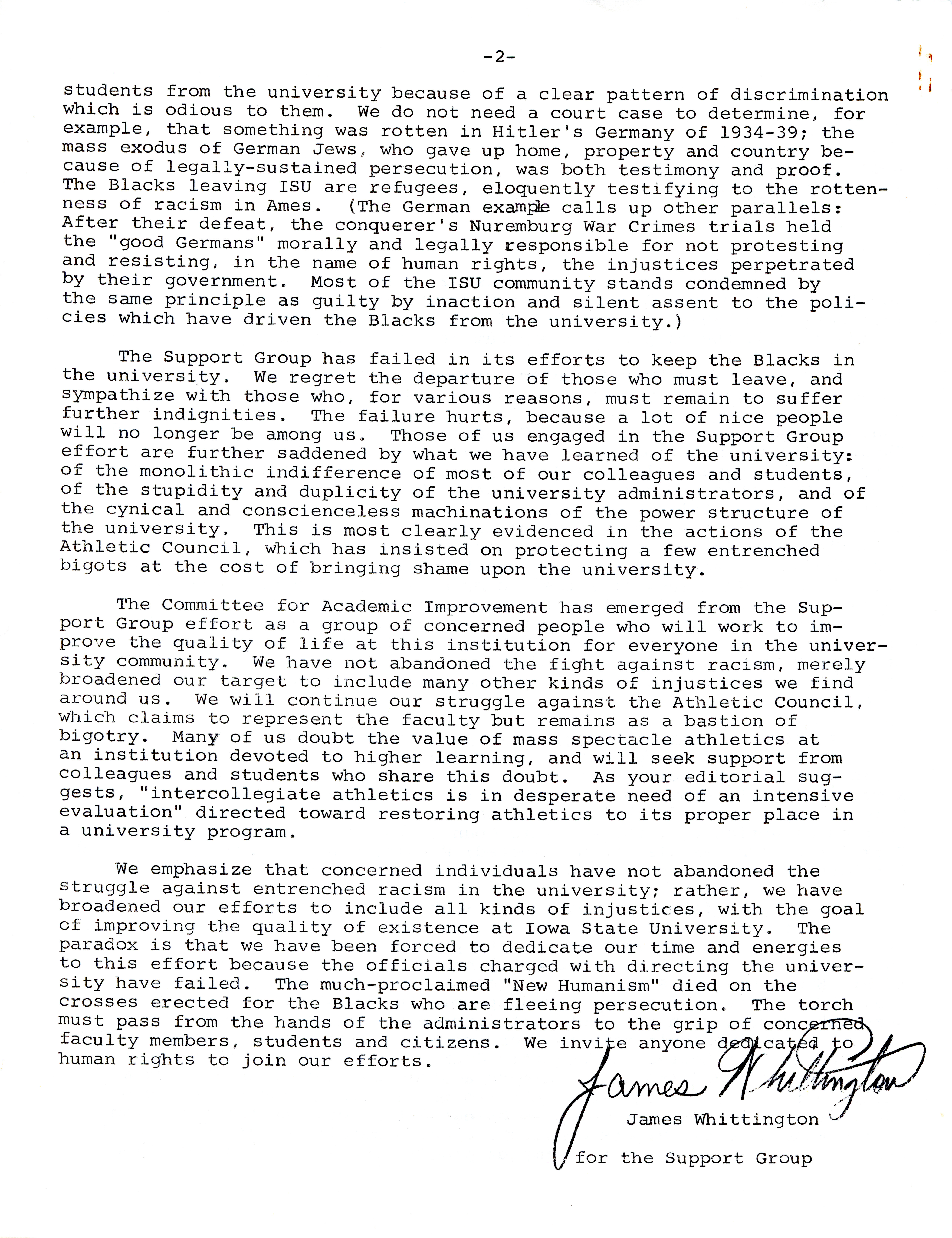 - James Whittington letter to the editor of Iowa State Daily, August 2, 1968