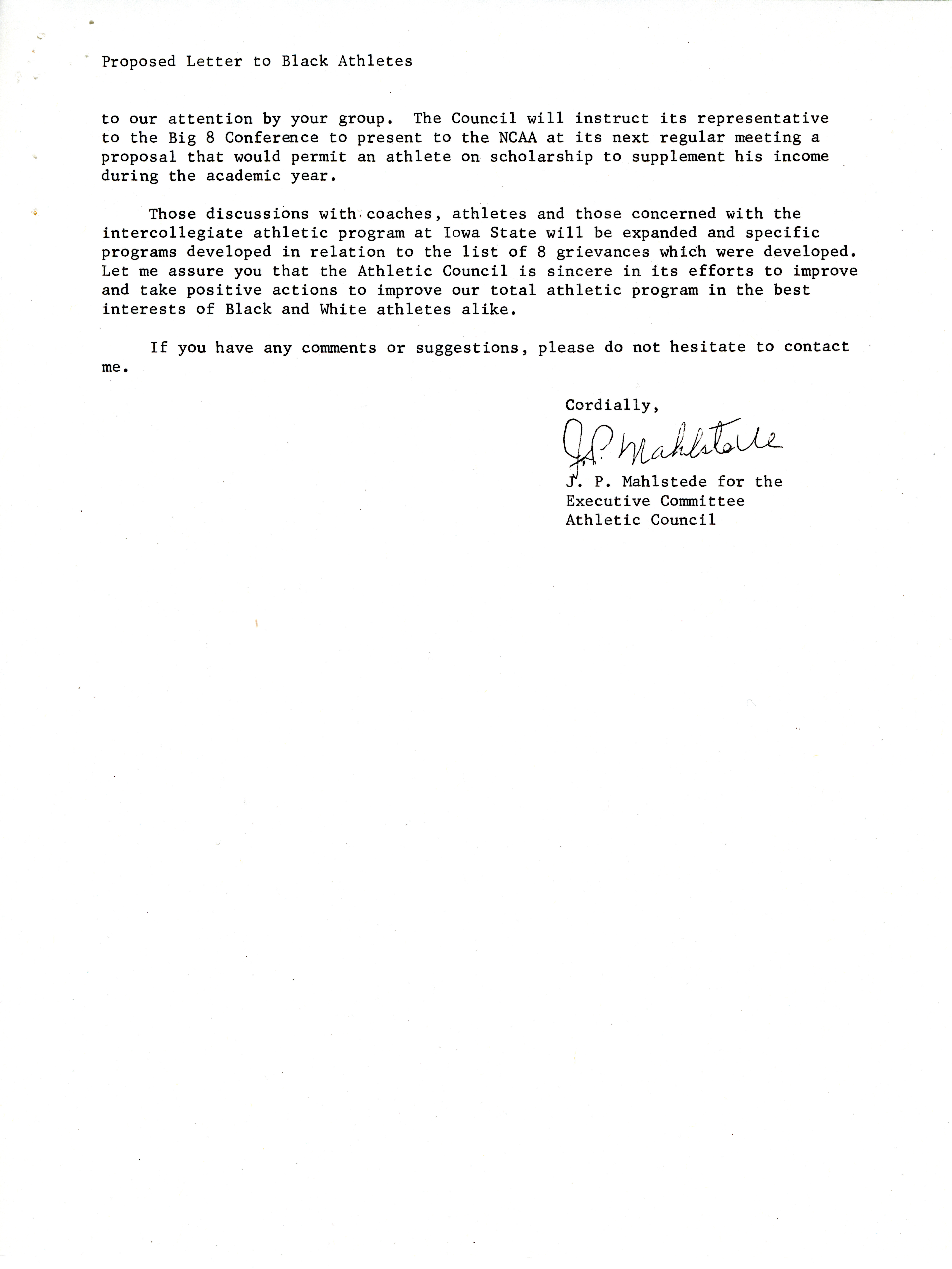 - "John P. Mahlstede proposed letter to Black athletes, June 8, 1968", Iowa State University Multicultural Student Organizations Collection, Iowa State University Library Digital Collections