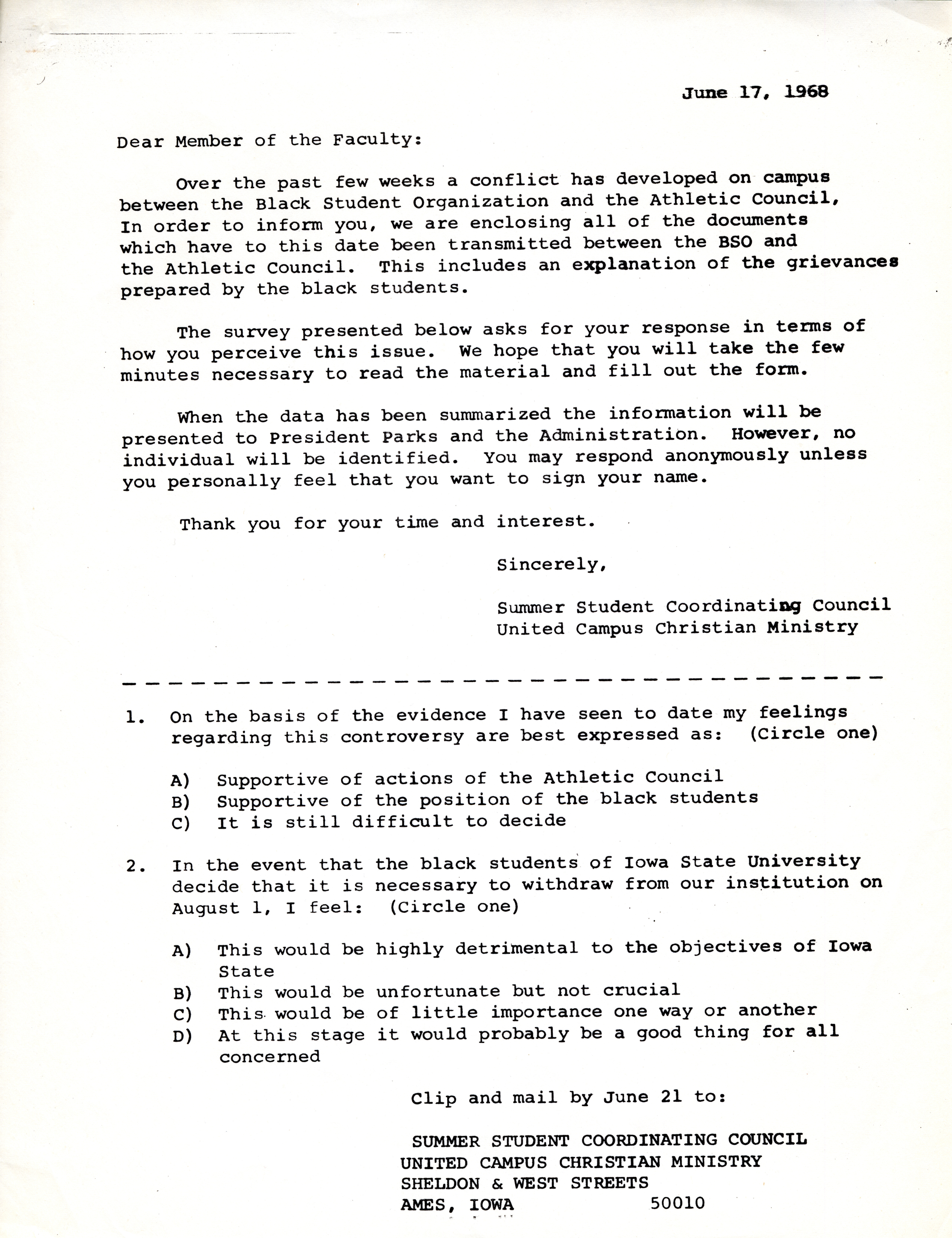 United Campus Christian Ministry letter to the Iowa State University Faculty, June 17, 1968 Item Info