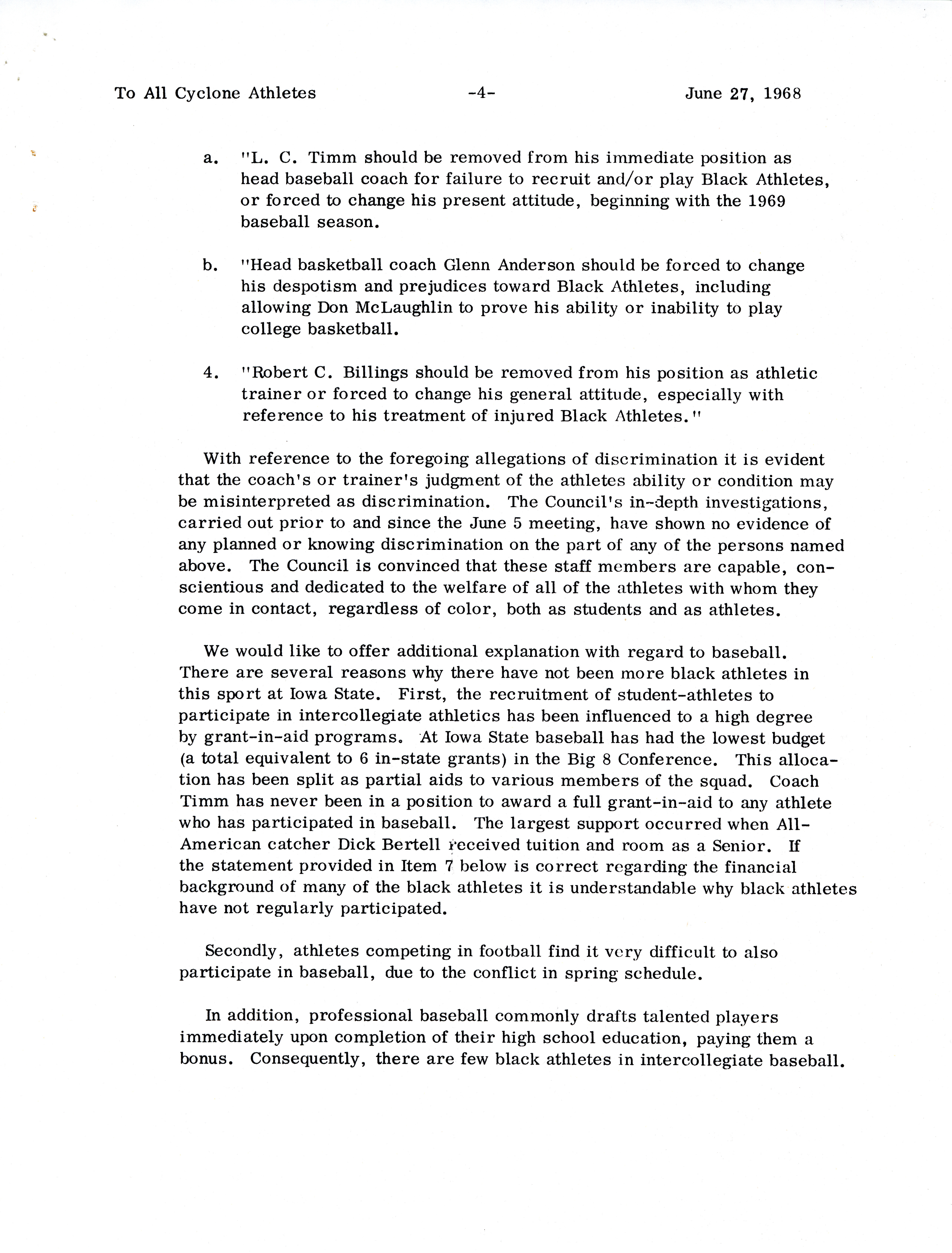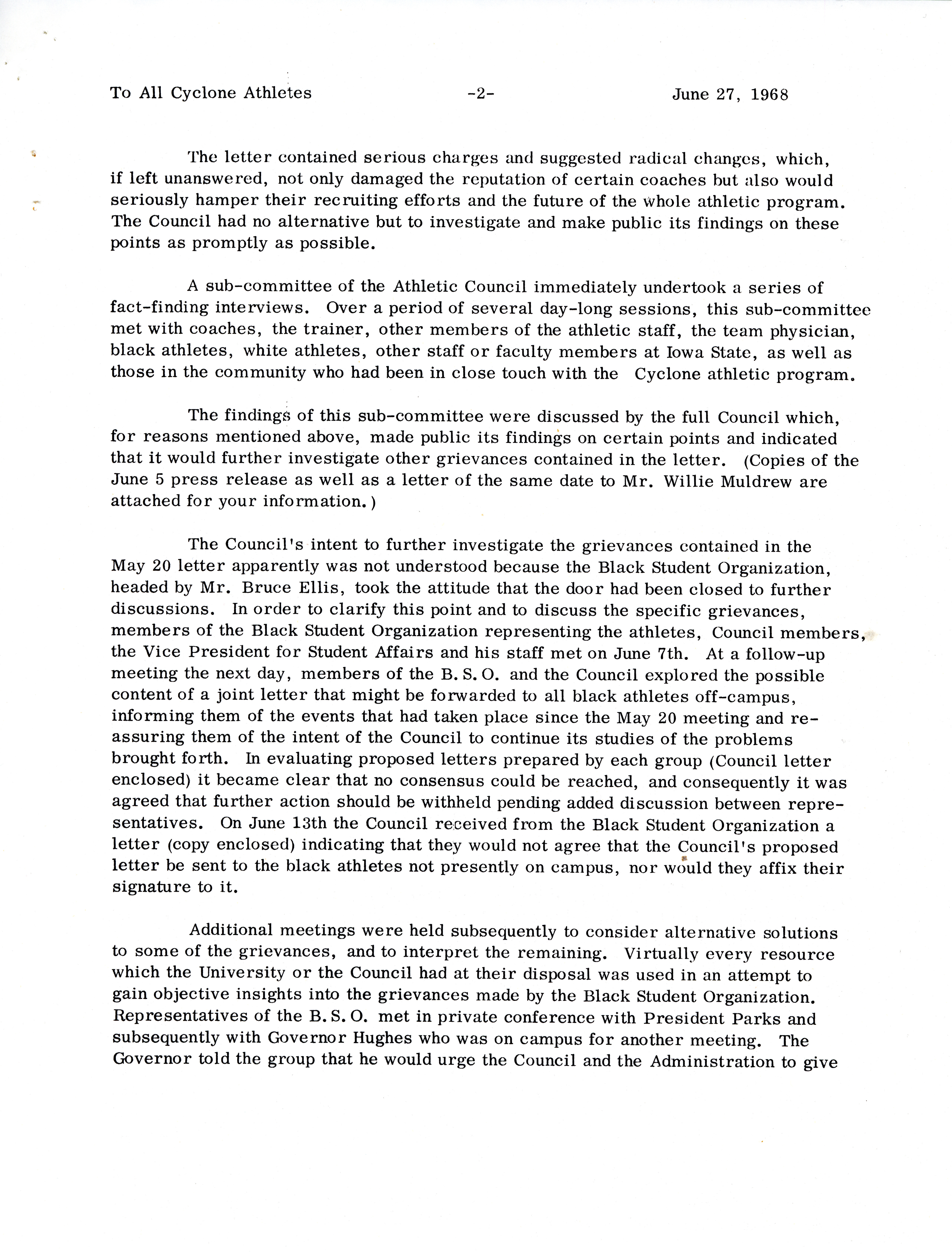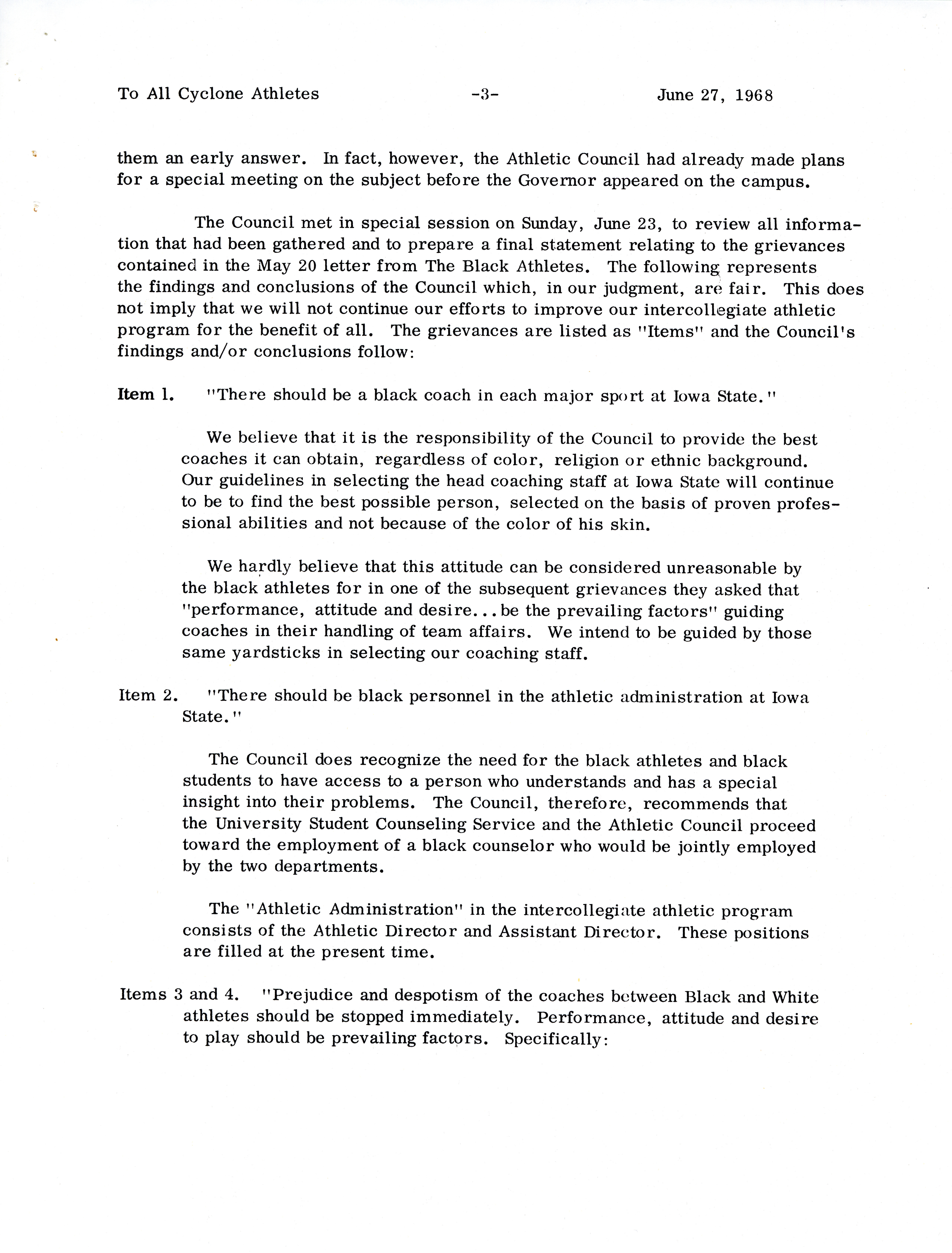 - Letter to Iowa State athletes from the Athletic Council regarding the Eight Grievances, the investigation, and the Athletic Council's response.