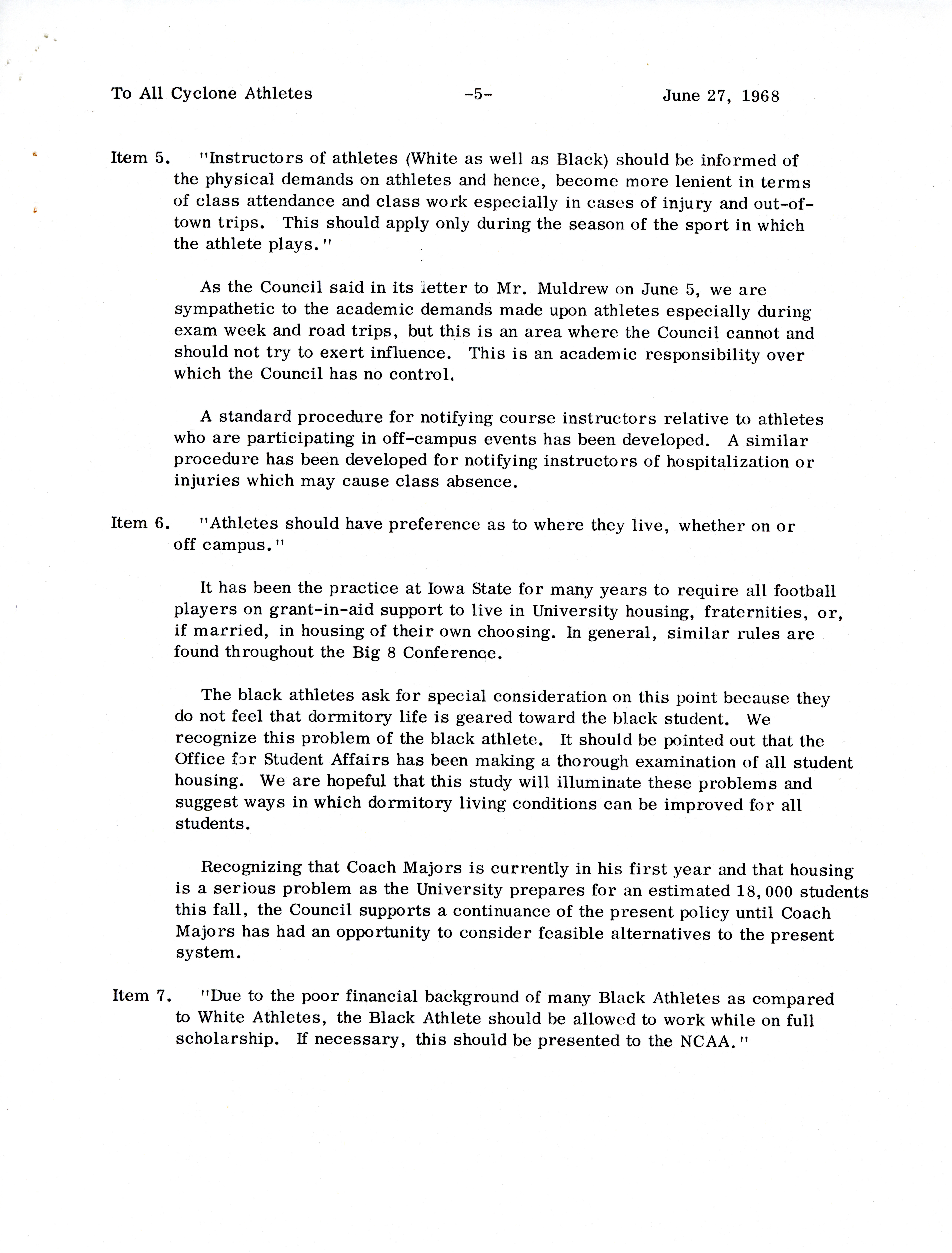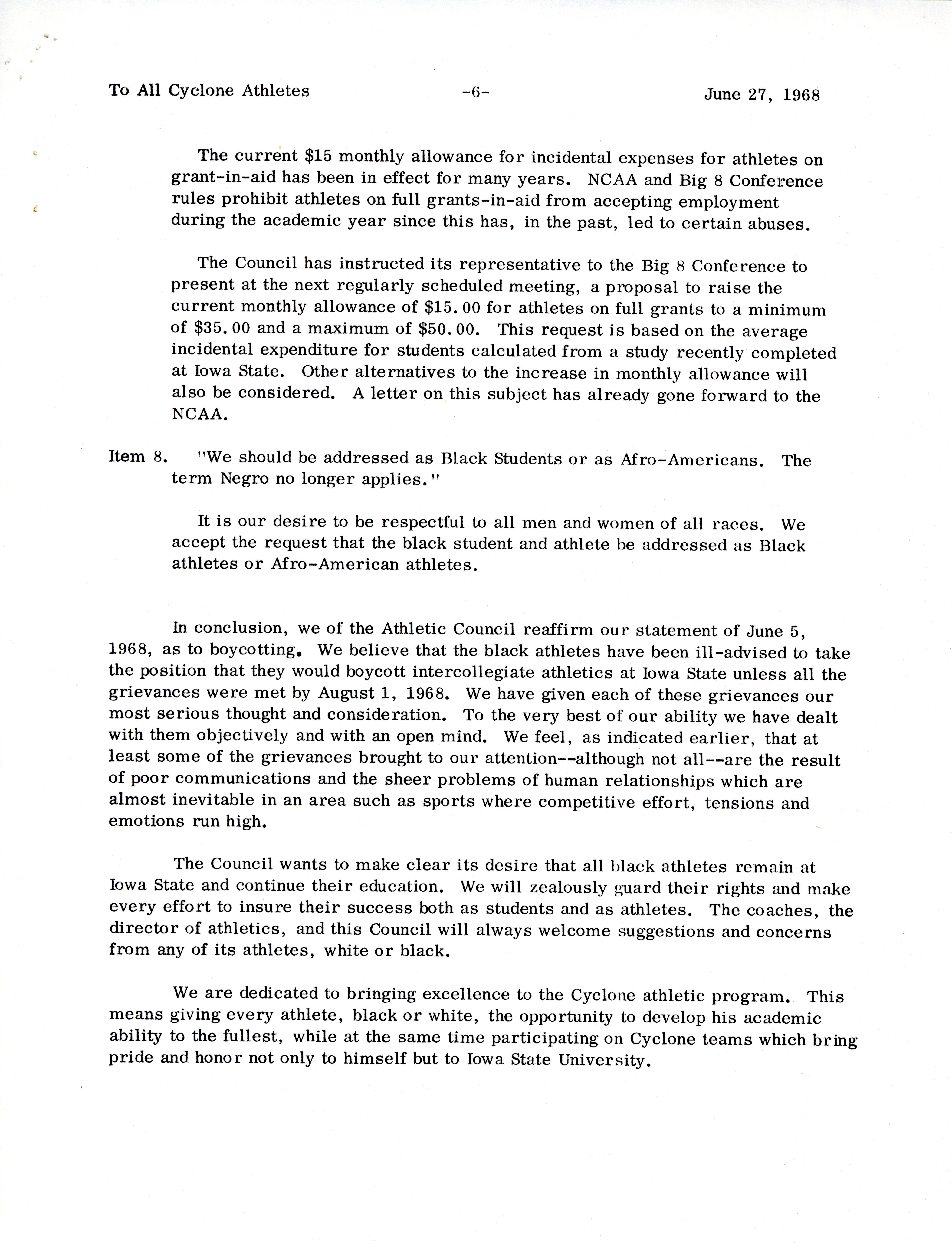 - Iowa State University Athletic Council memorandum to all Cyclone athletes, June 27, 1968