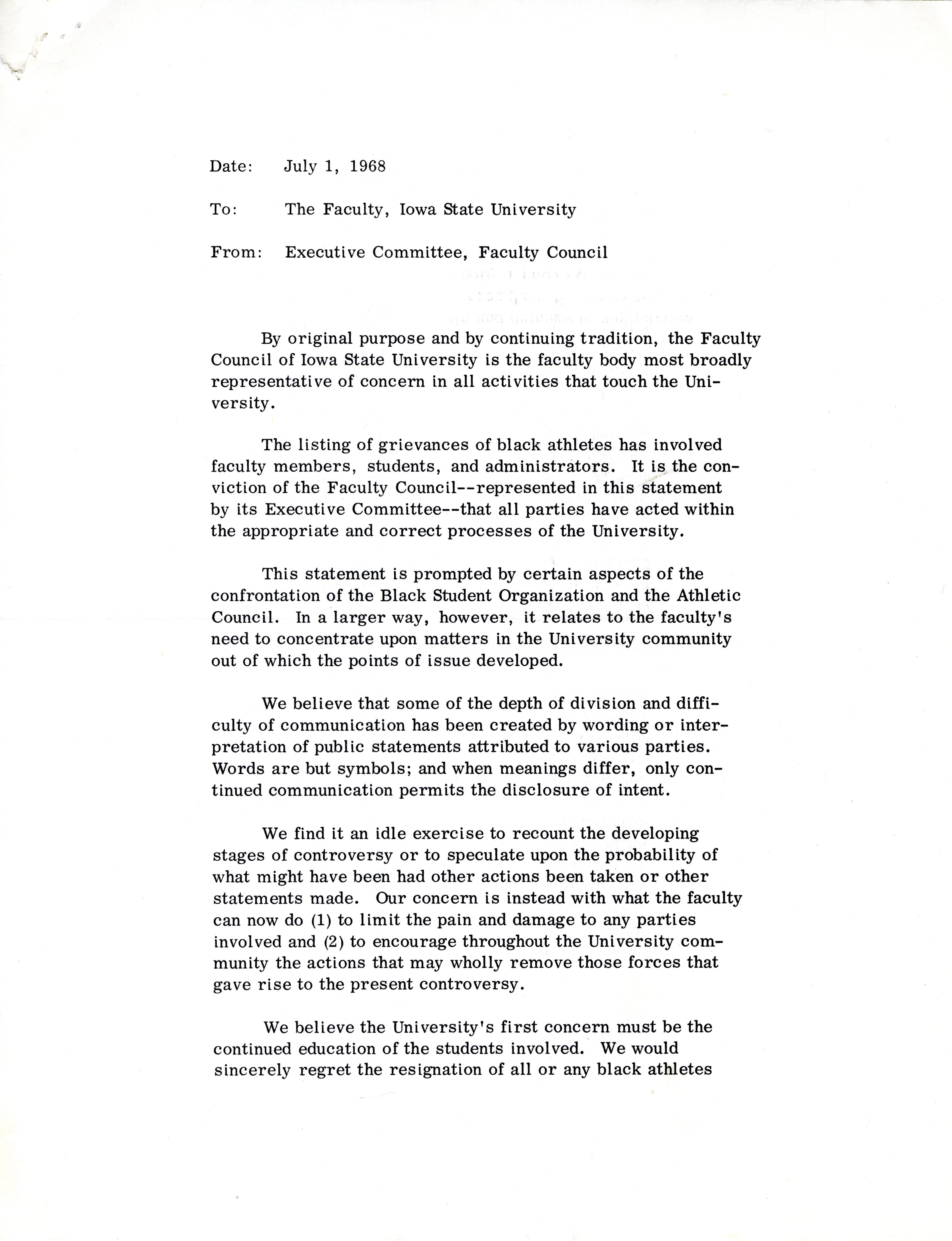 - Iowa State University Faculty Council memorandum to Iowa State University Faculty, July 1, 1968