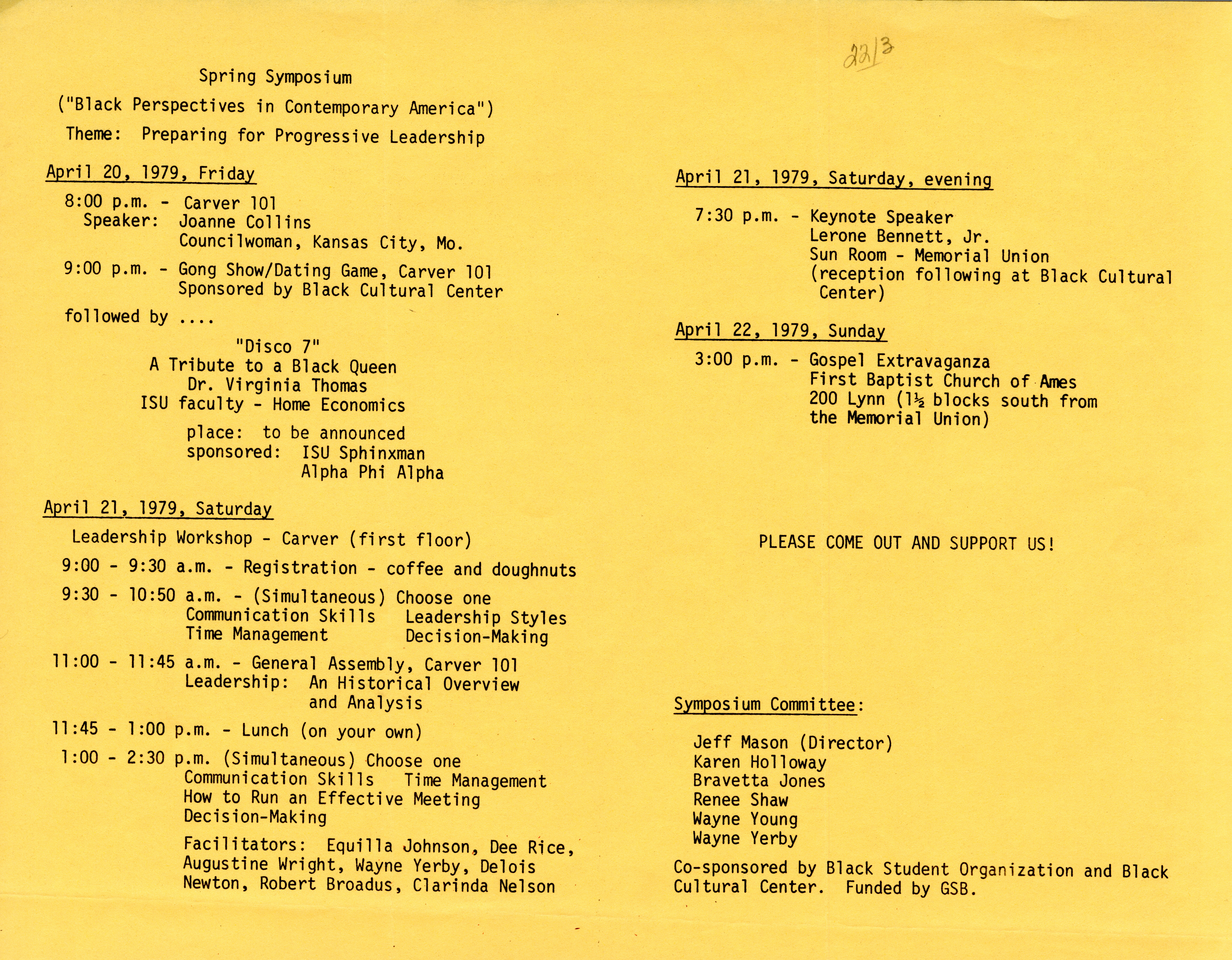 - "Black Perspectives in Contemporary America Symposium: schedule of events", Iowa State University Multicultural Student Organizations Collection, Iowa State University Library Digital Collections