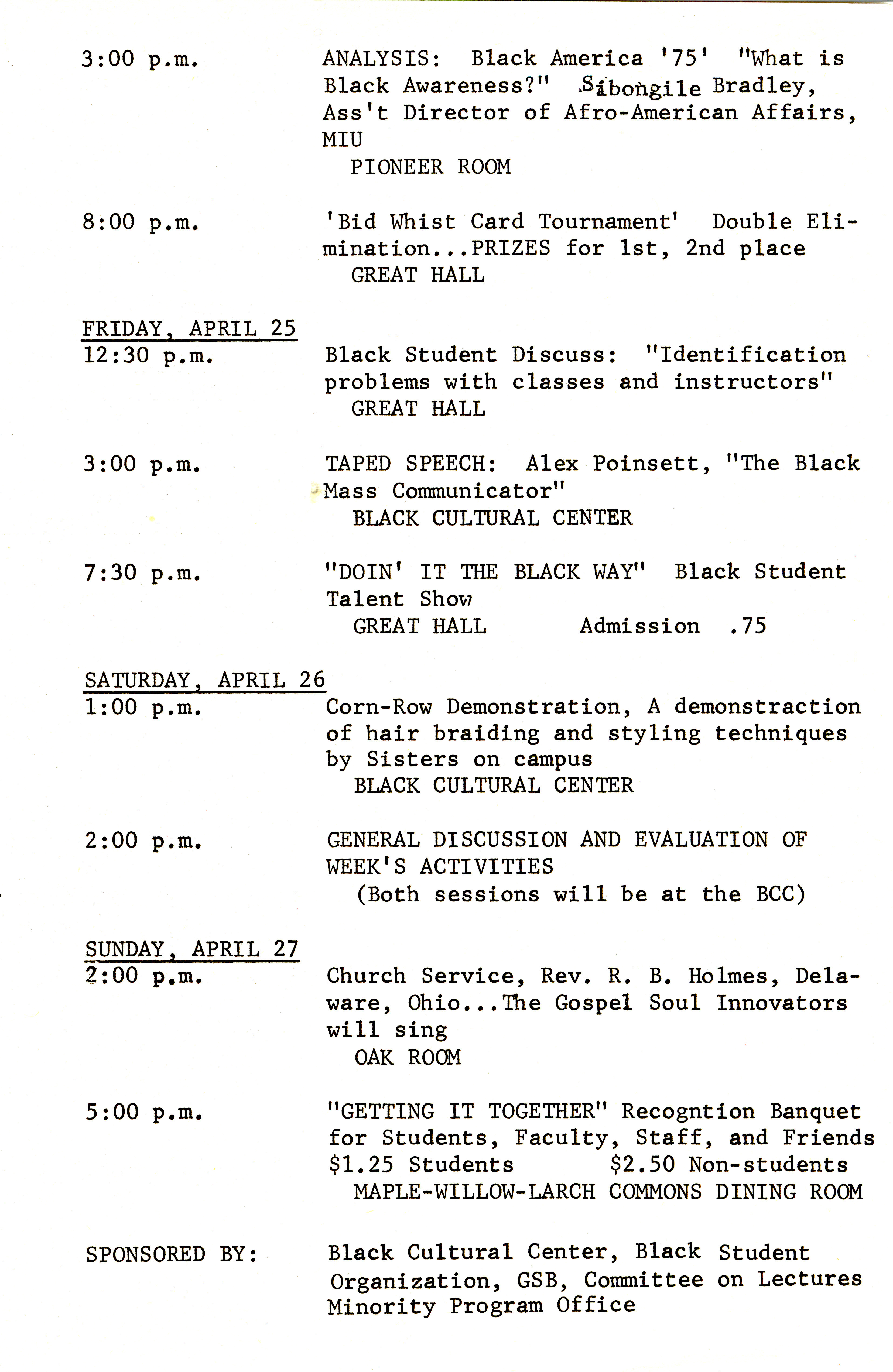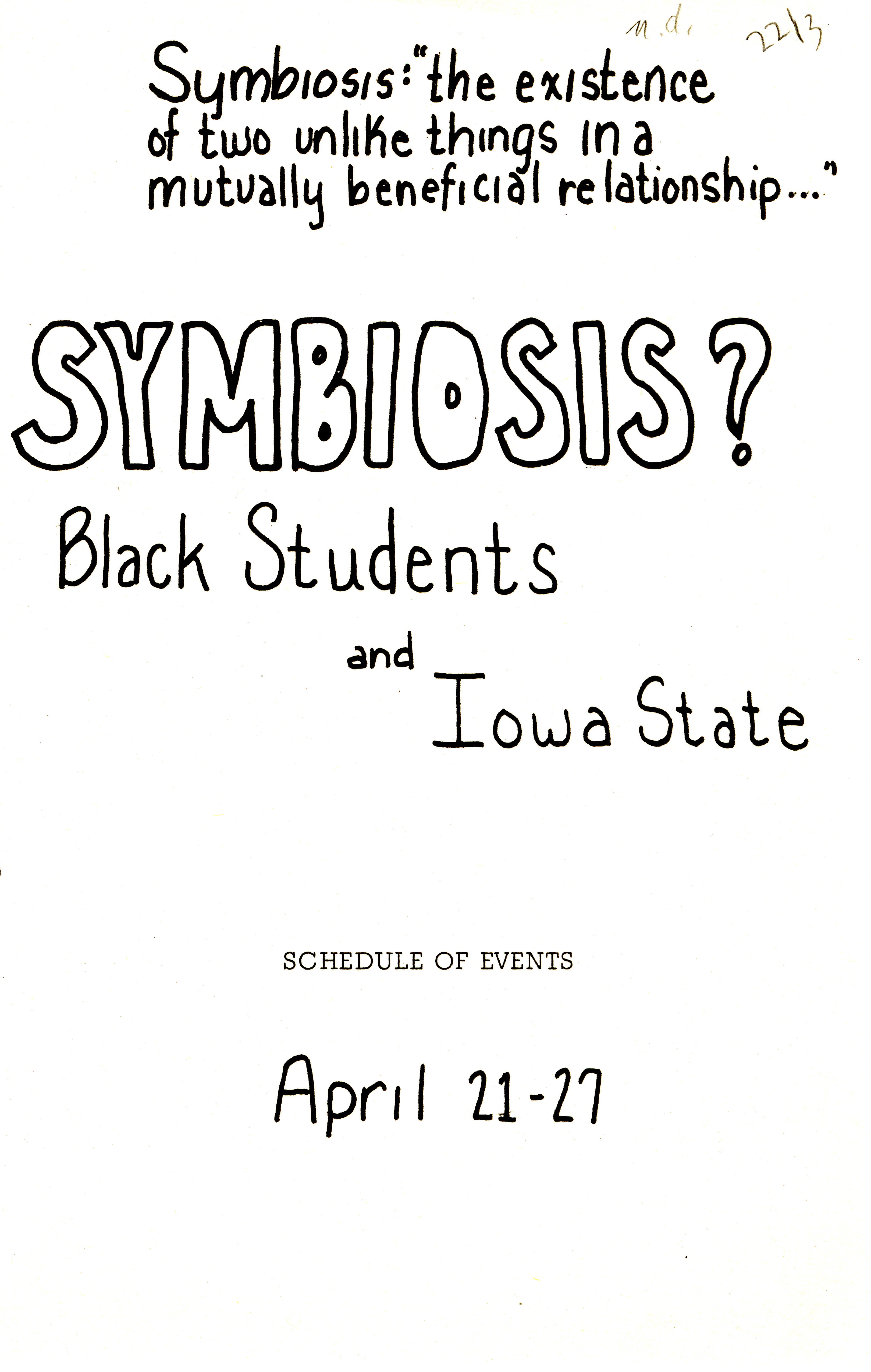 - Schedule of events for the Symbiosis? Black Students and Iowa State conference, held April 21-27, 1975. Annotation: "Symbiosis: 'the existence of two unlike things in a mutually beneficial relationship...'"