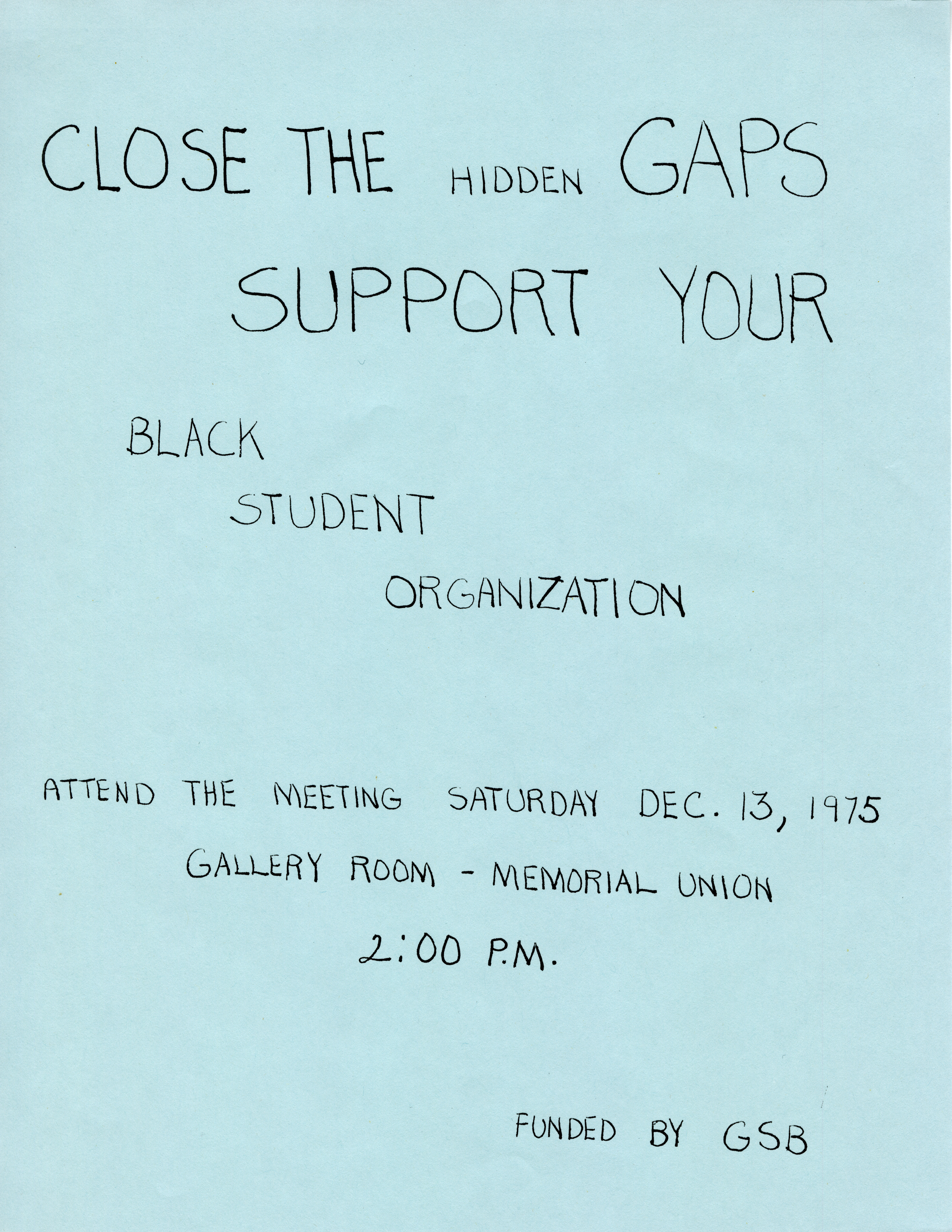 - Announcement for Black Student Organization meeting: "Close the hidden gaps. Support your Black Student Organization.".