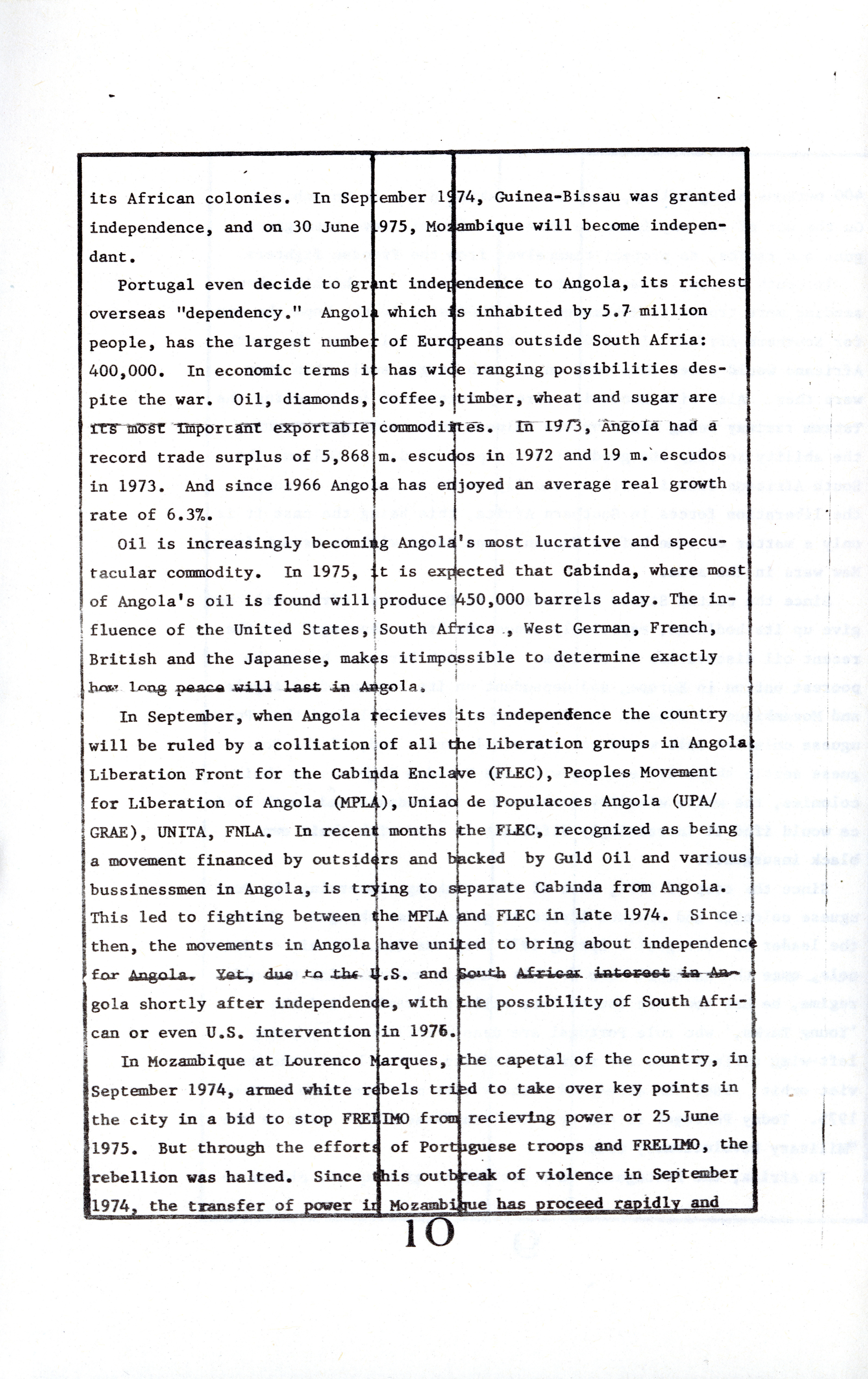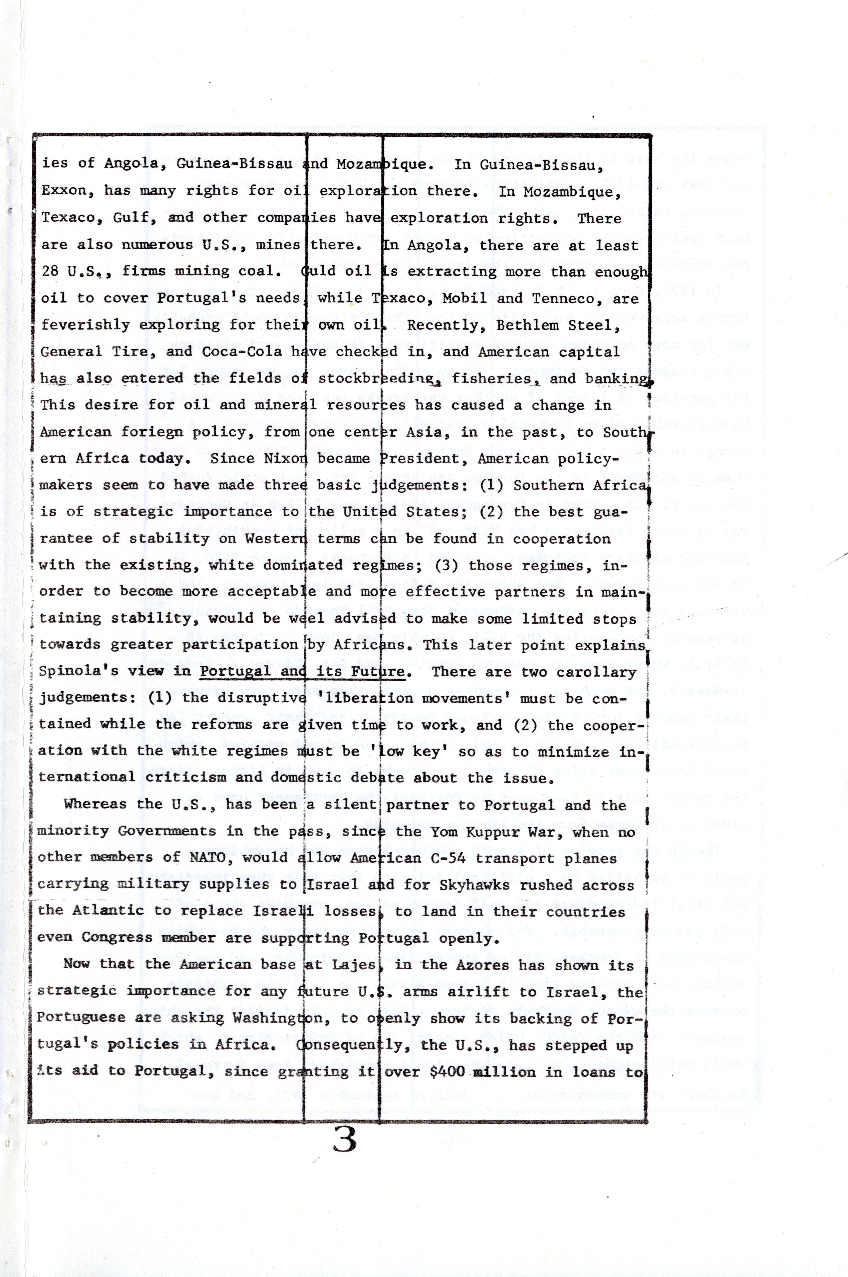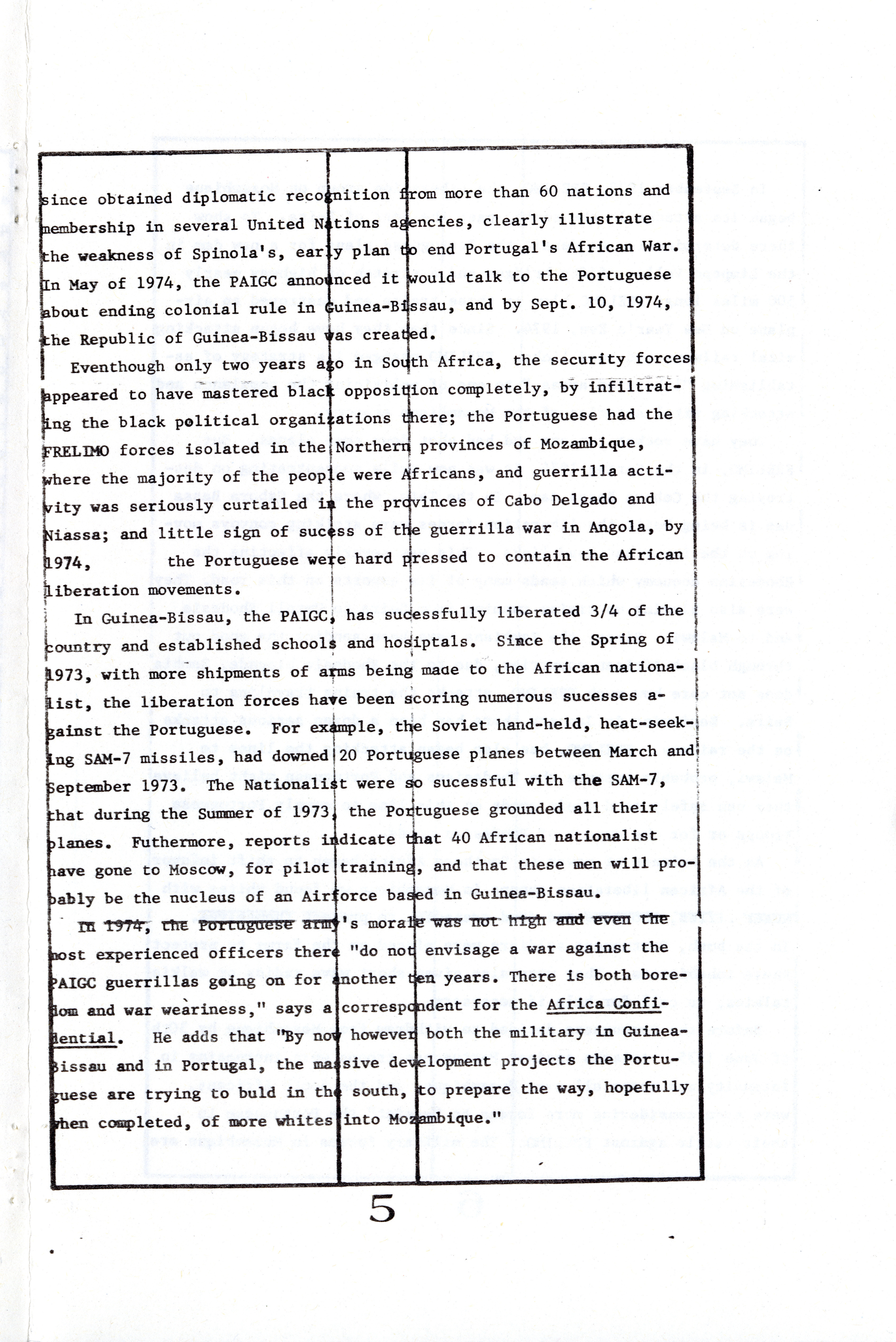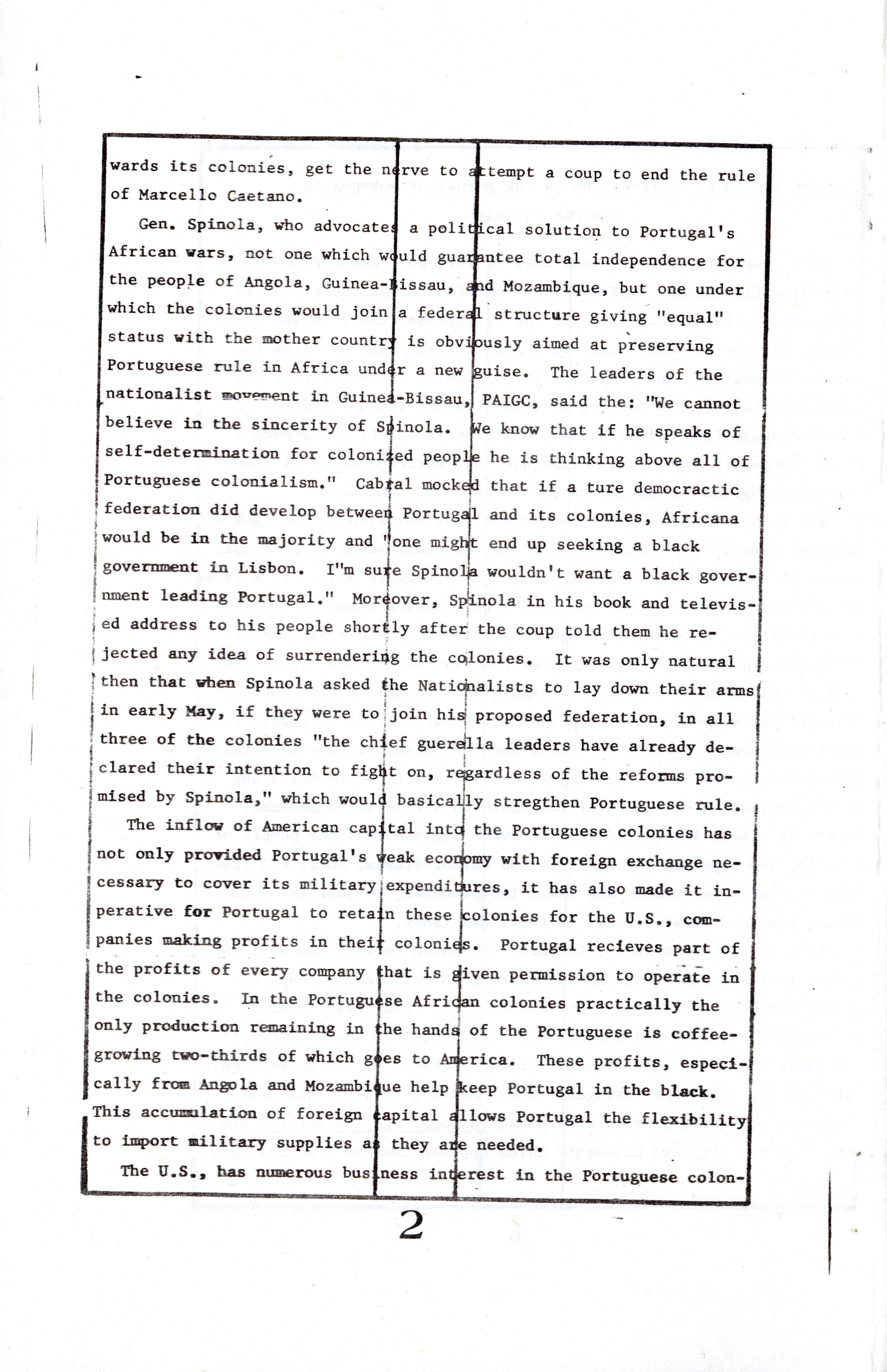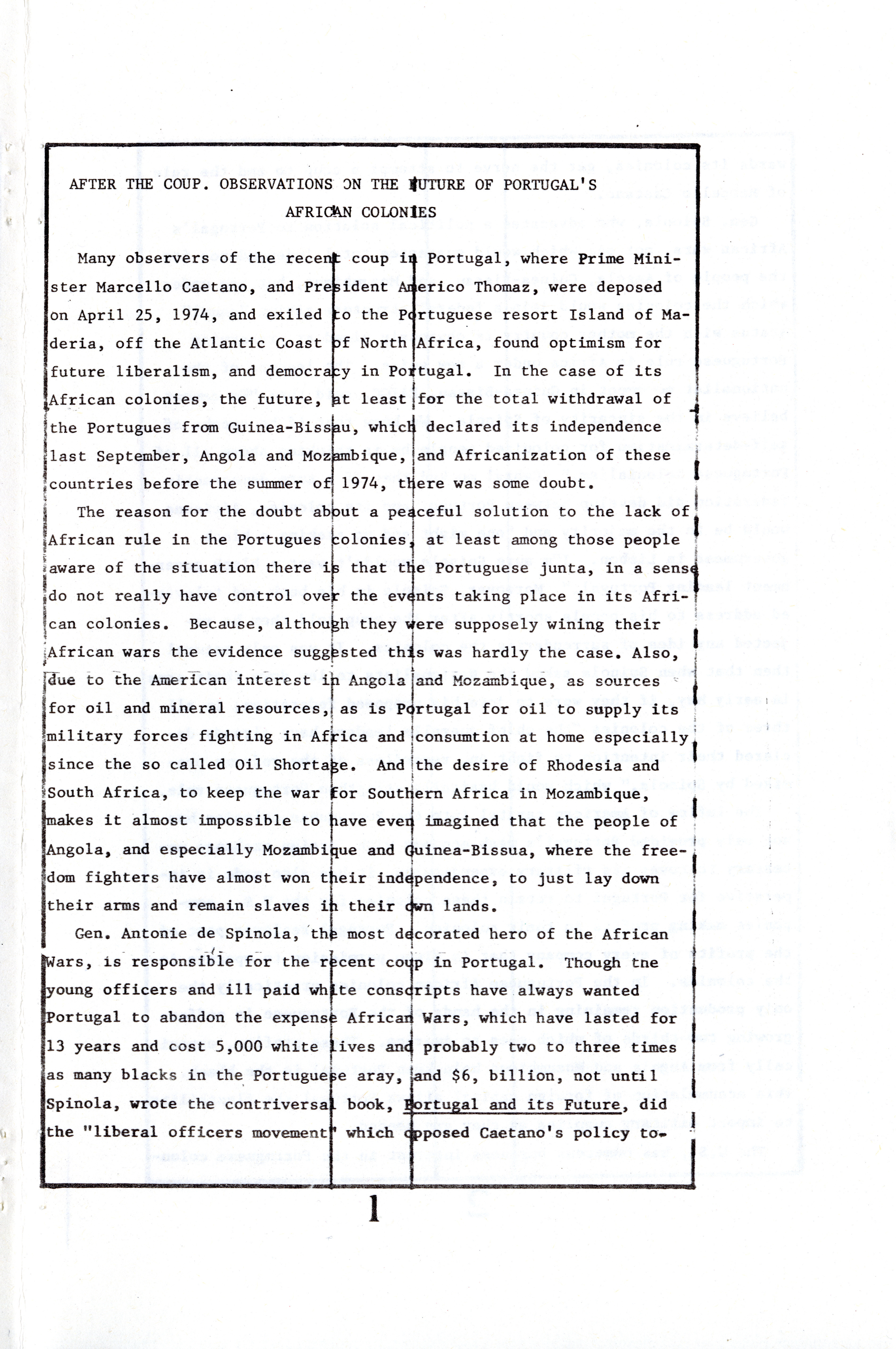 - "After the coup: observations on the future of Portugal's African colonies and Southern Africa", Iowa State University Multicultural Student Organizations Collection, Iowa State University Library Digital Collections