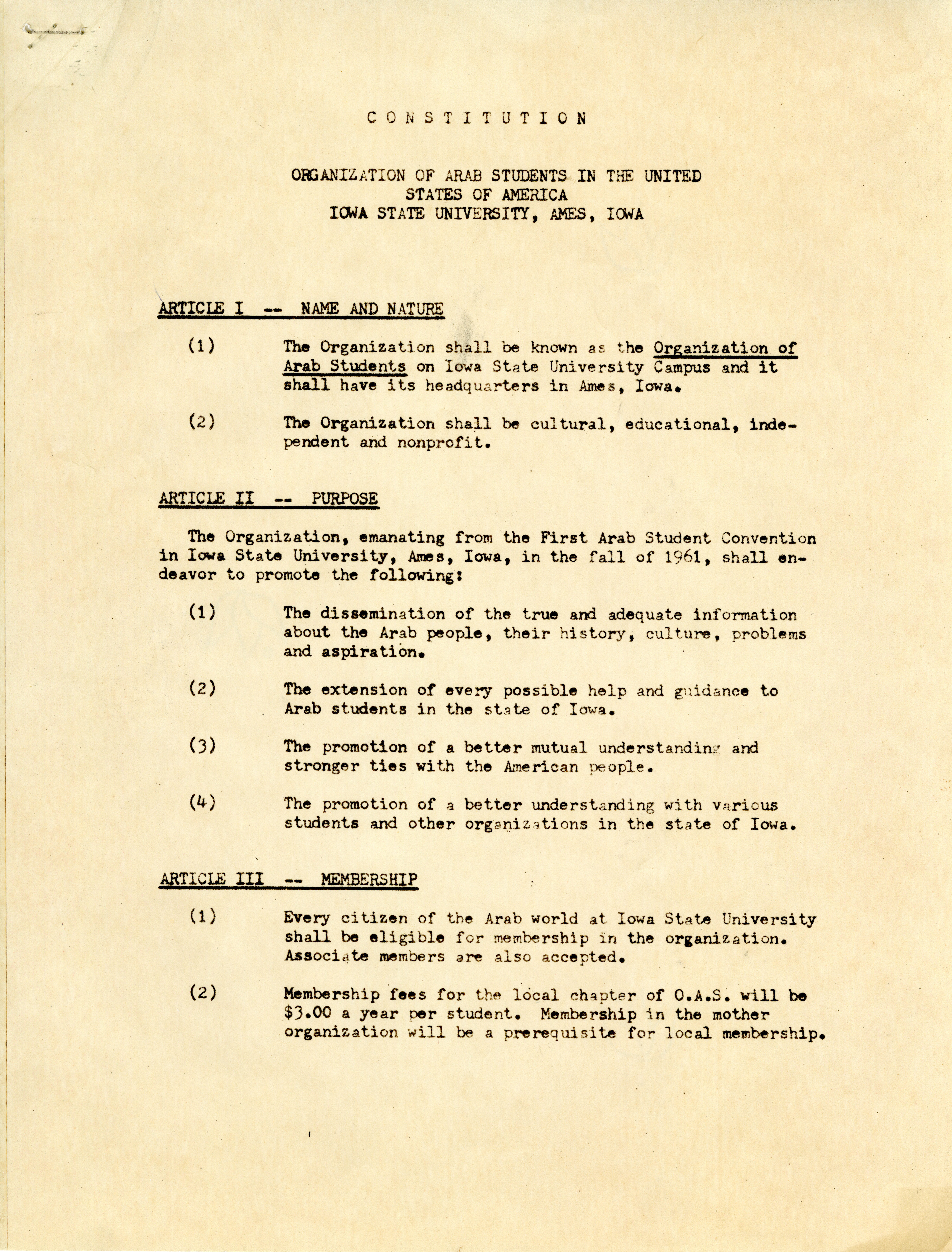 - "Constitution of the Organization of Arab Students", Iowa State University Multicultural Student Organizations Collection, Iowa State University Library Digital Collections