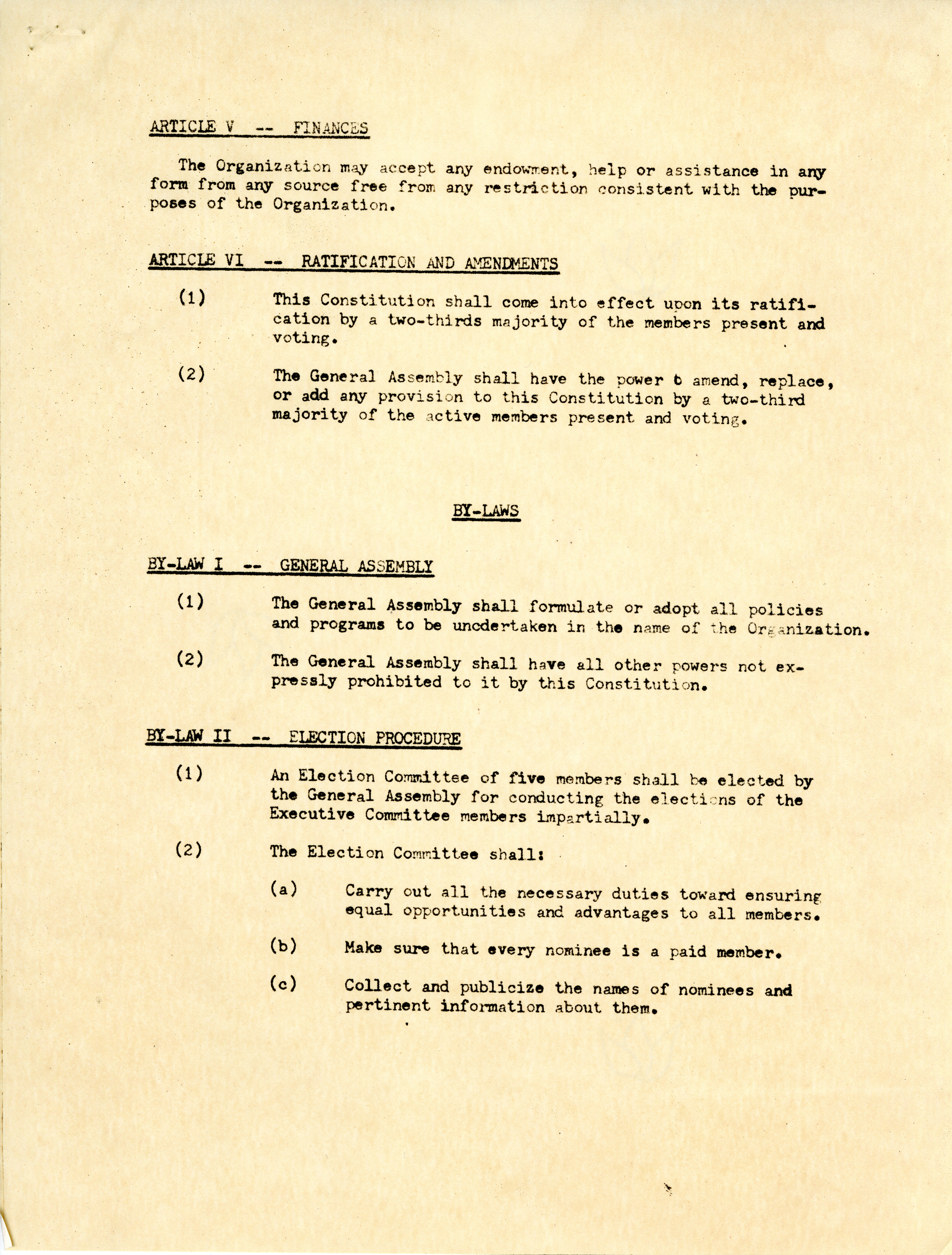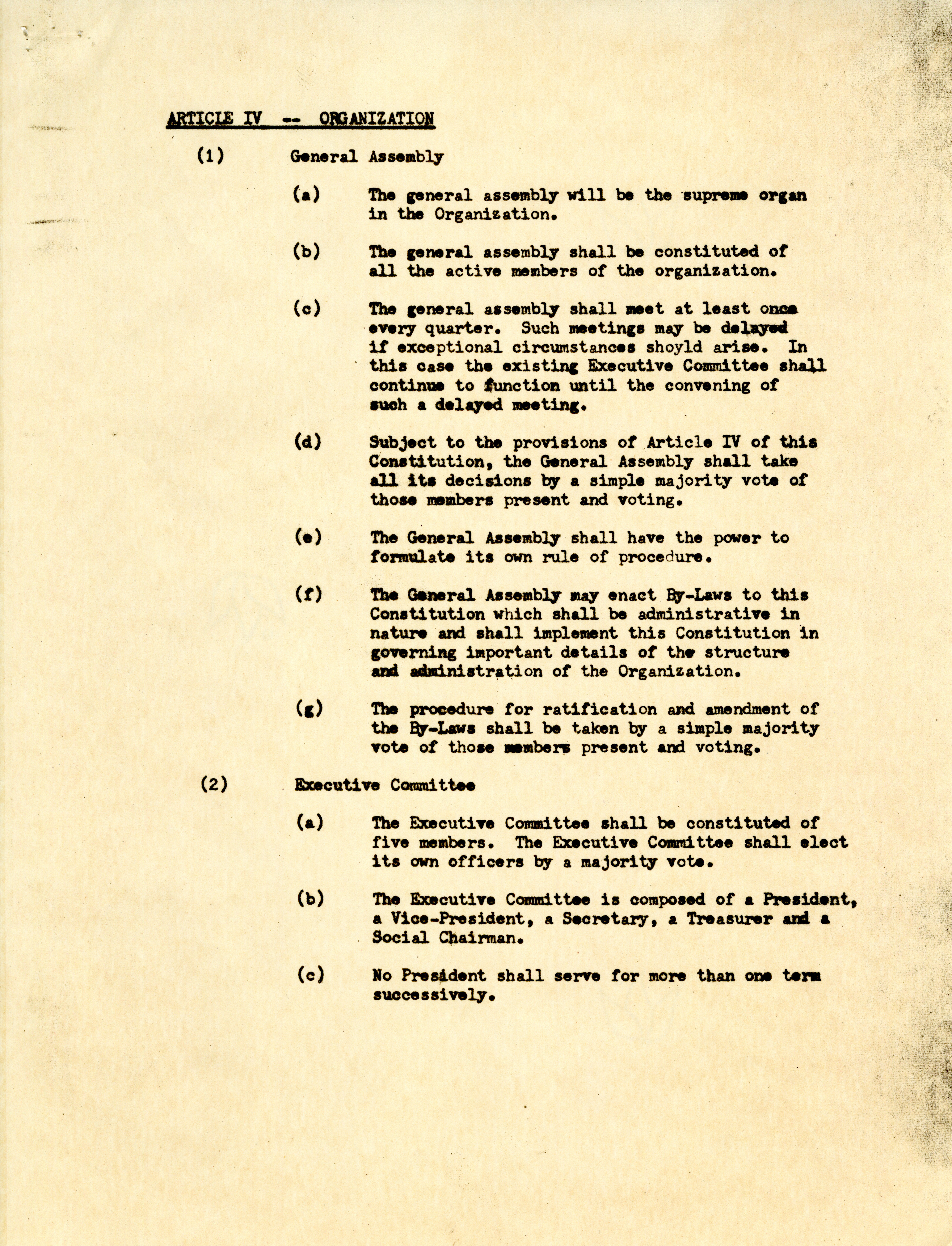 - Constitution laying out the rules, purpose, membership, bylaws, and executive committee positions for the organization.