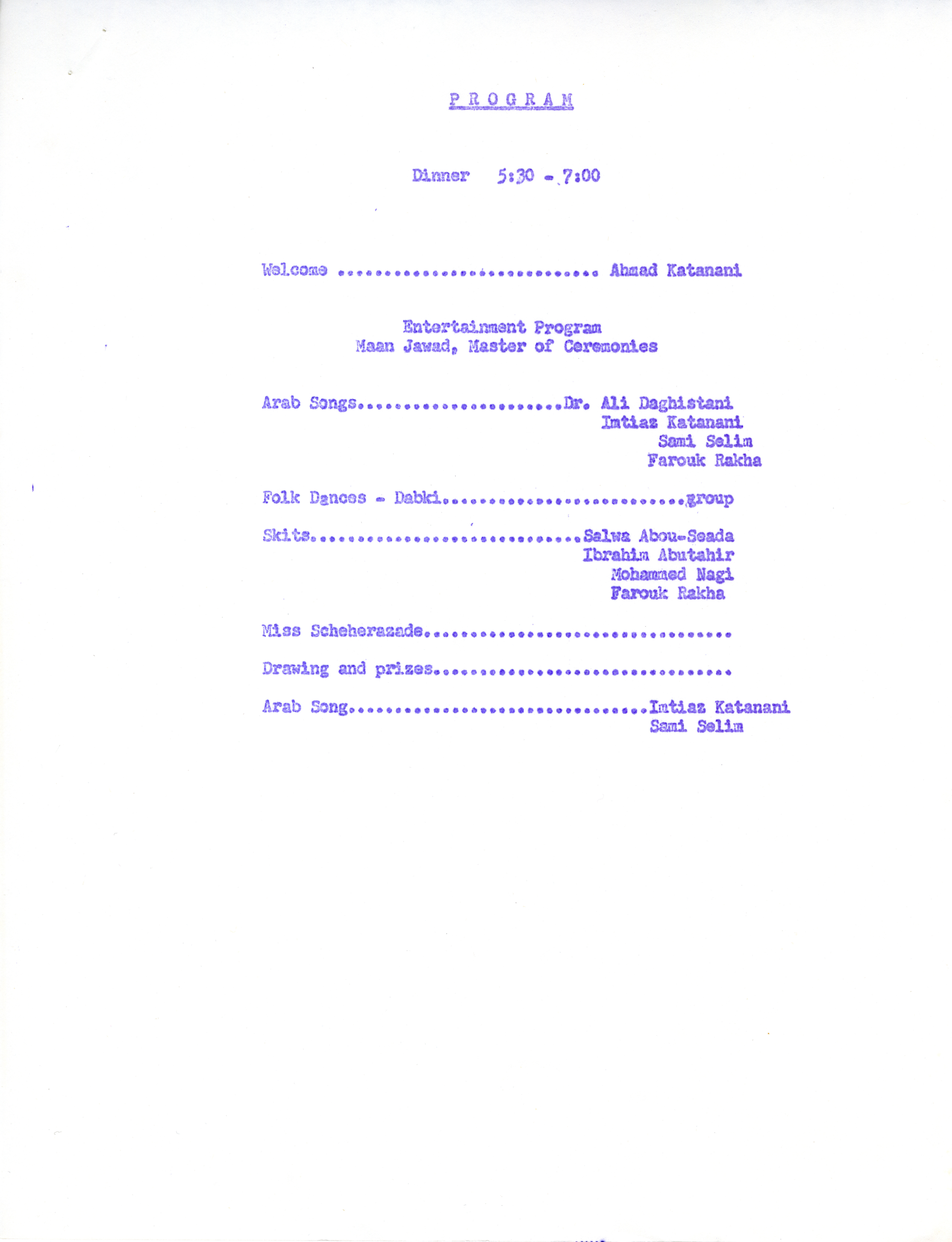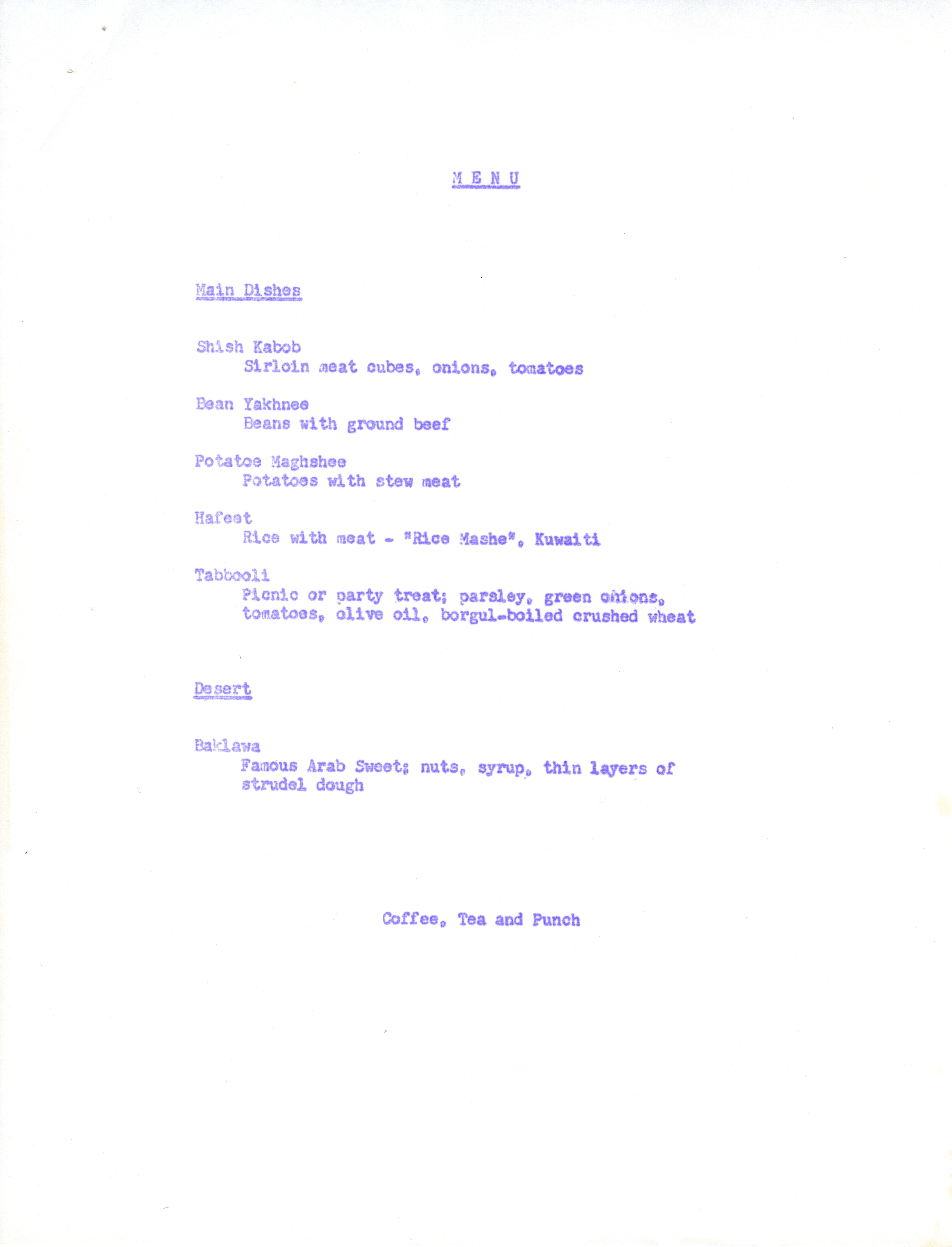 - Program for event that lists a menu, the schedule of events, demographics of Arab students at Iowa State, and additional information about the Arab world.