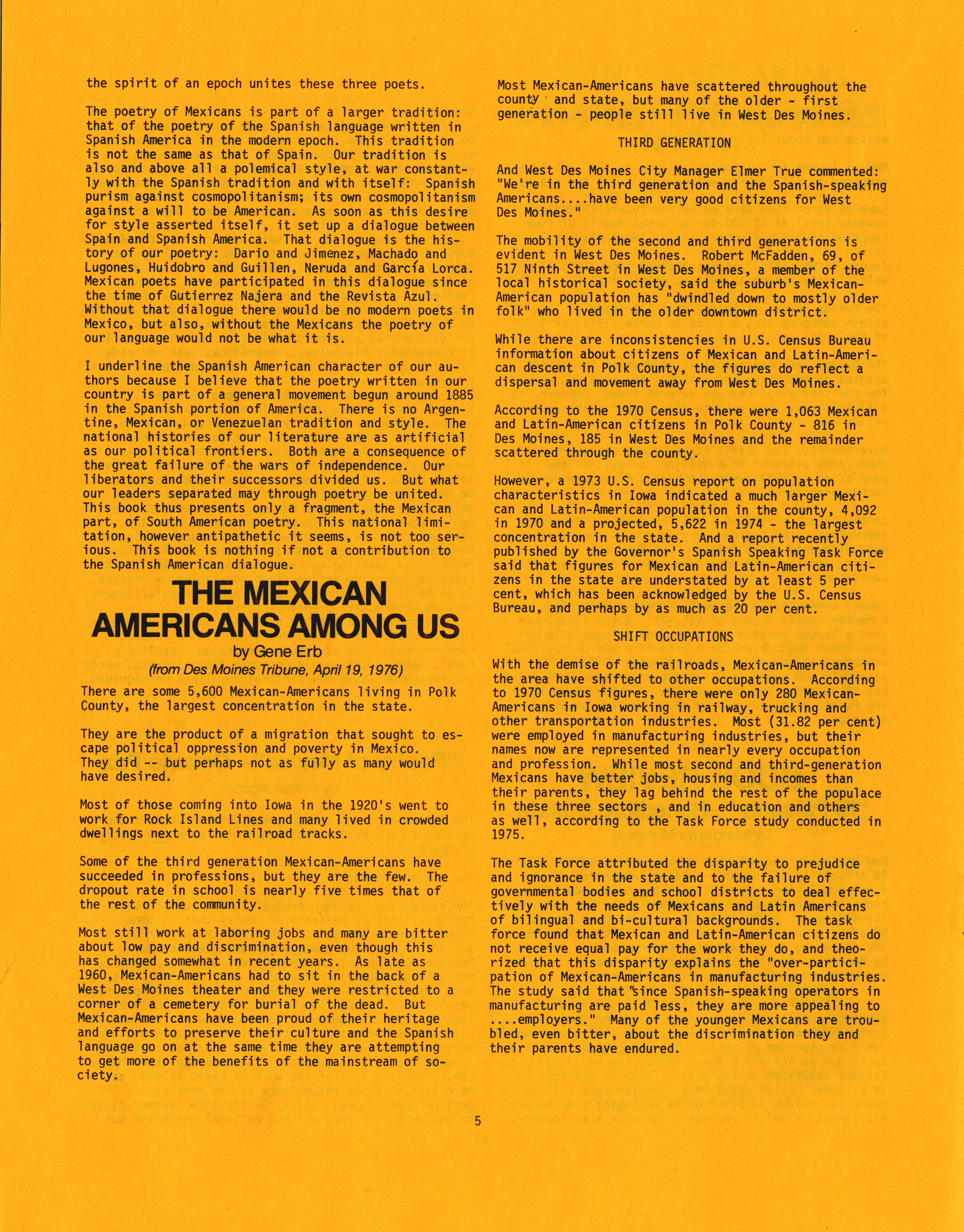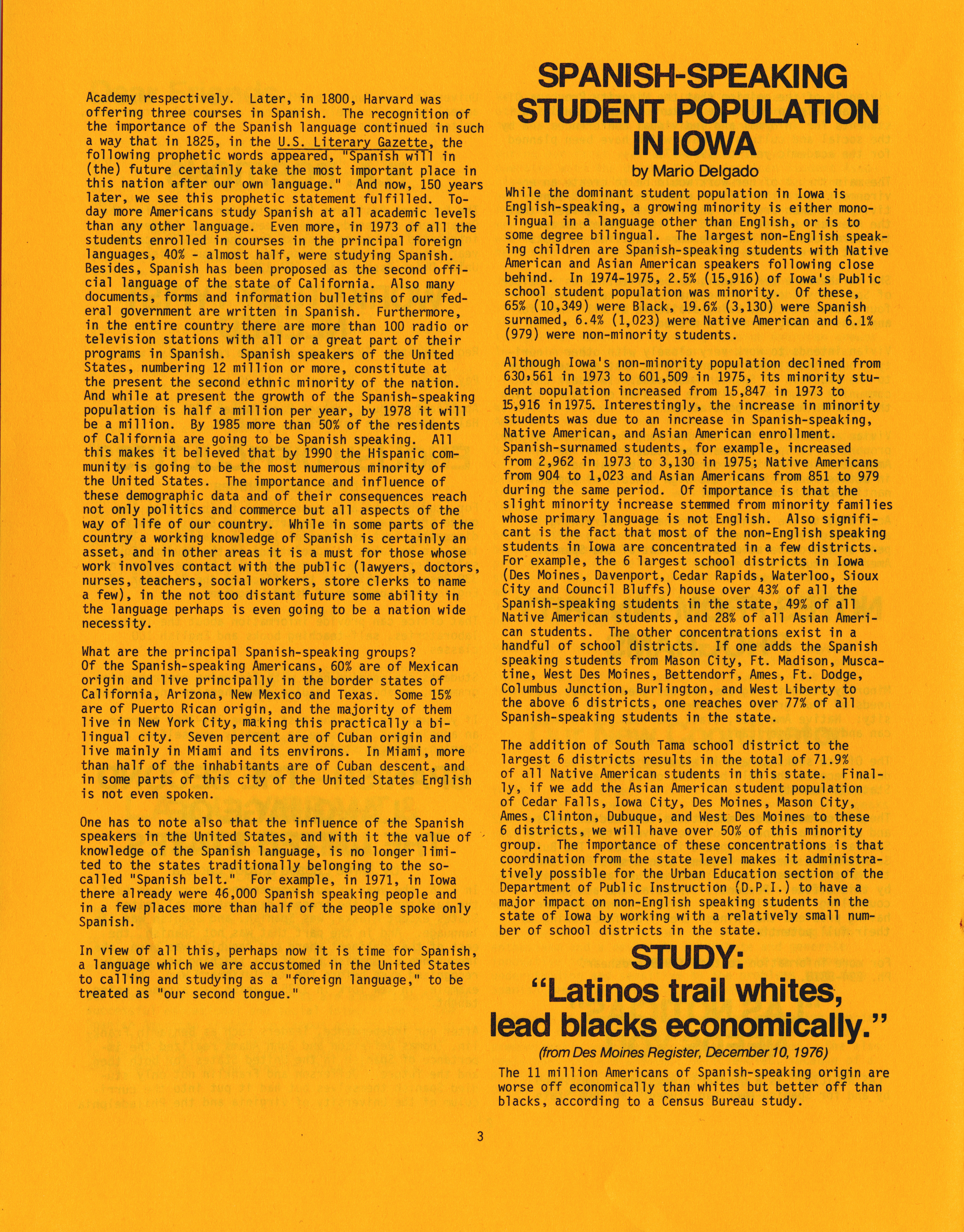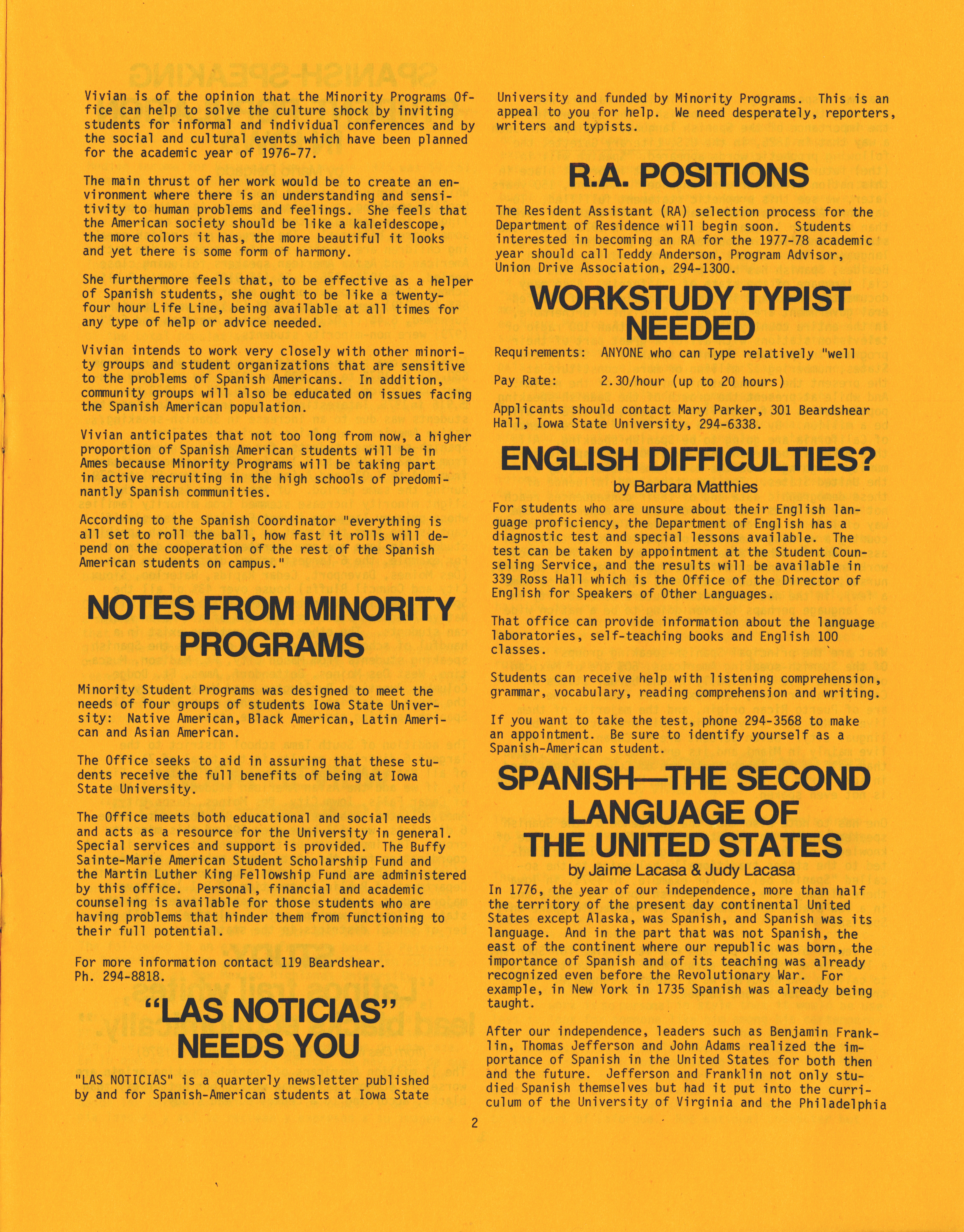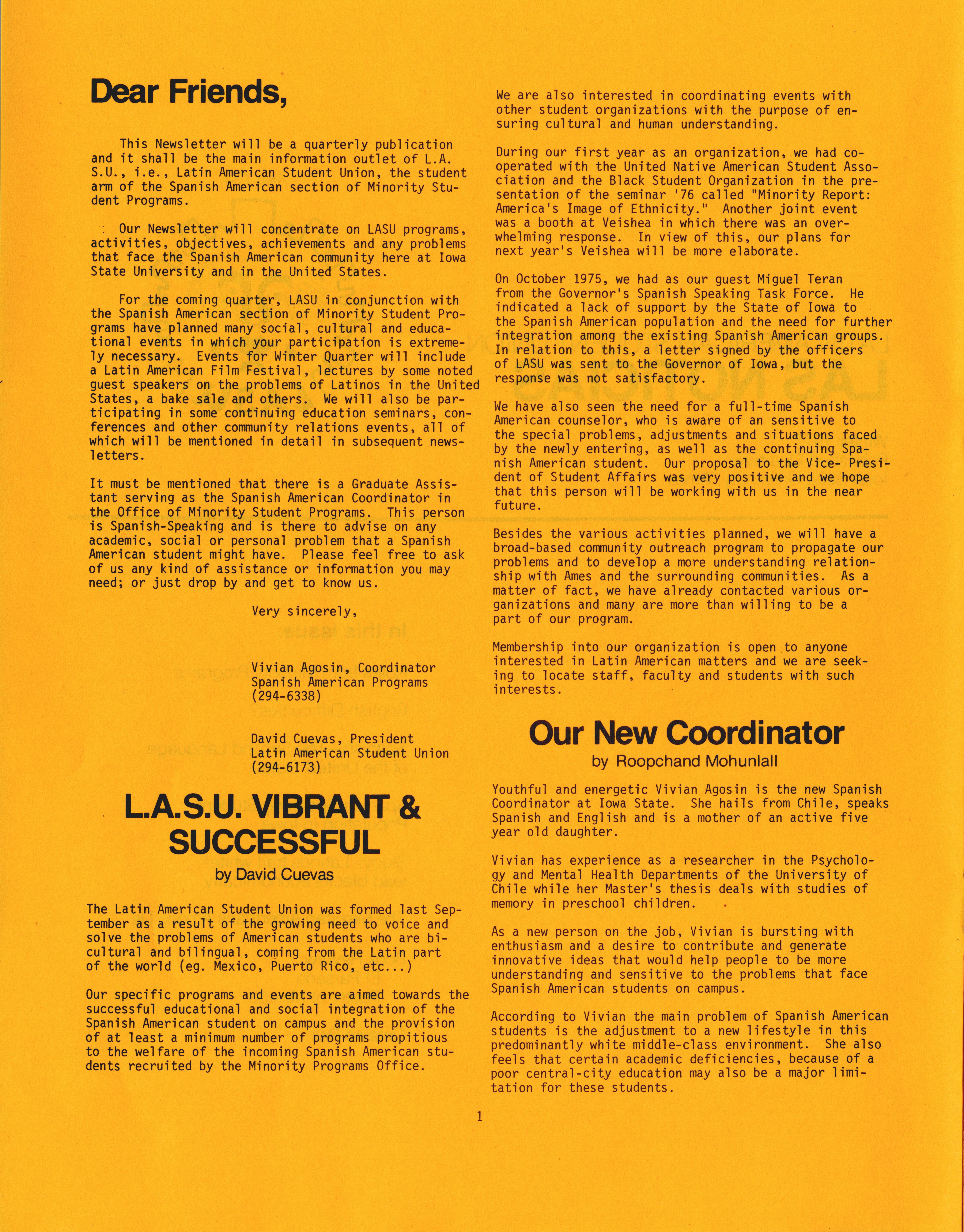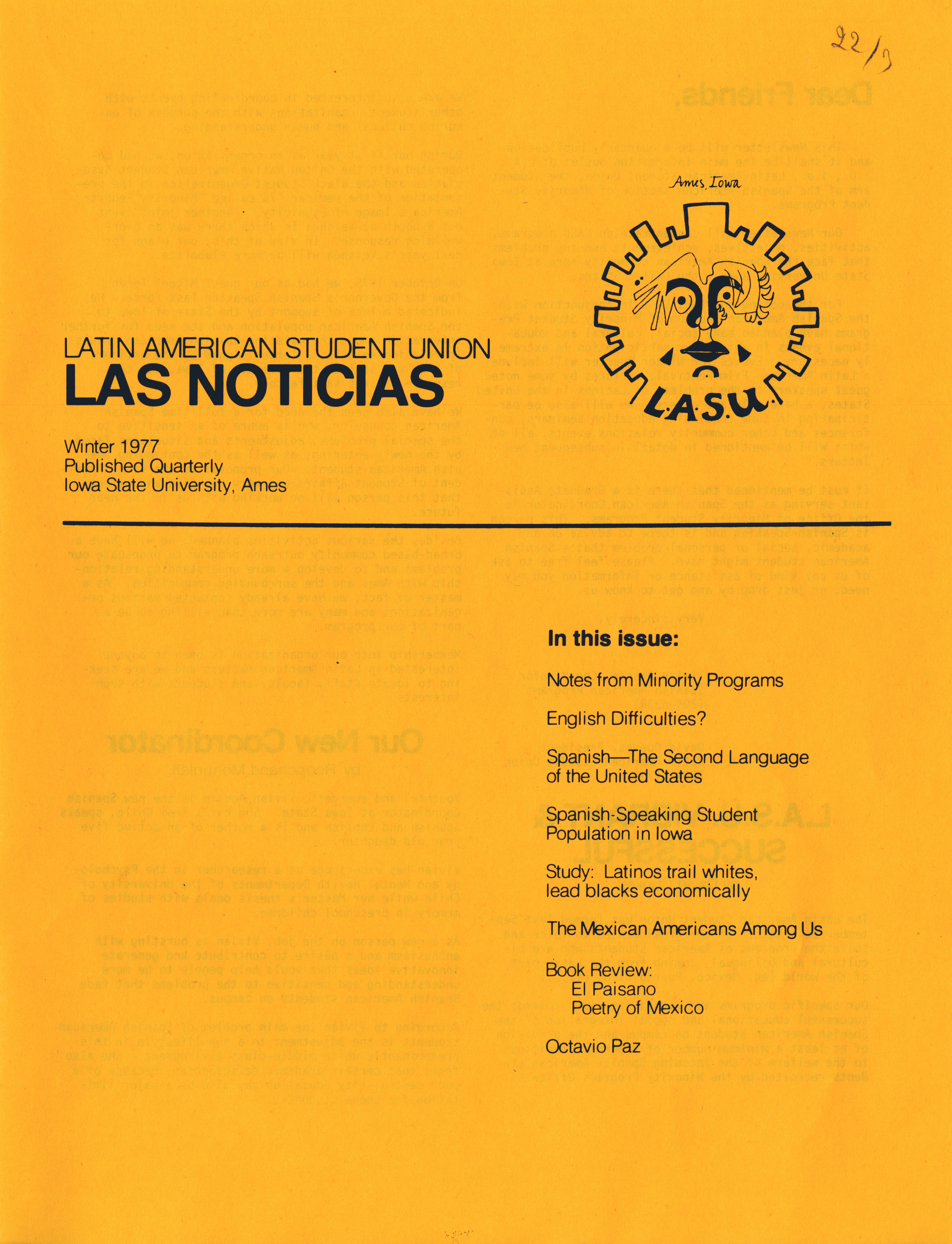 - "Las Noticias--Latin American Student Union newsletter, Winter 1977", Iowa State University Multicultural Student Organizations Collection, Iowa State University Library Digital Collections