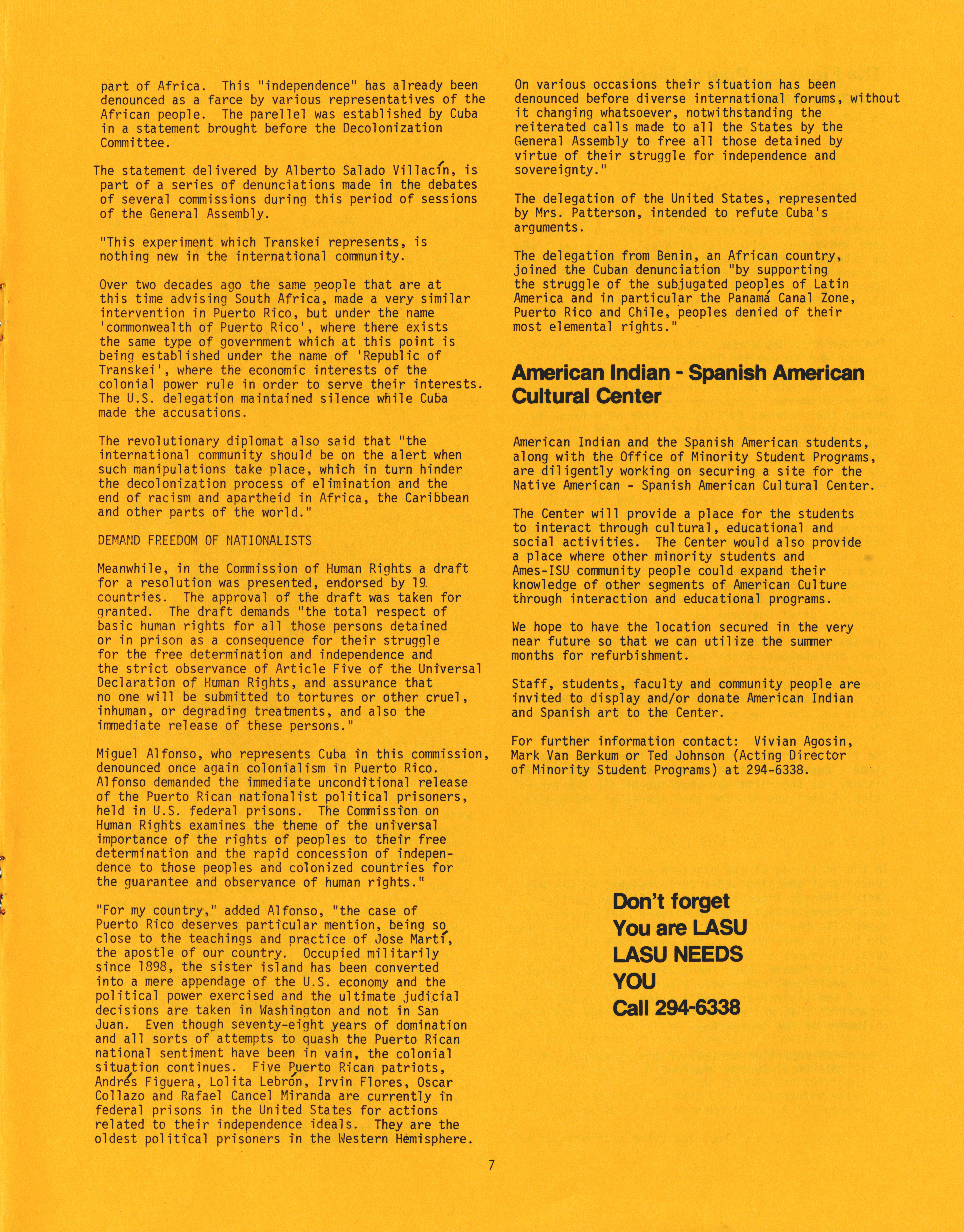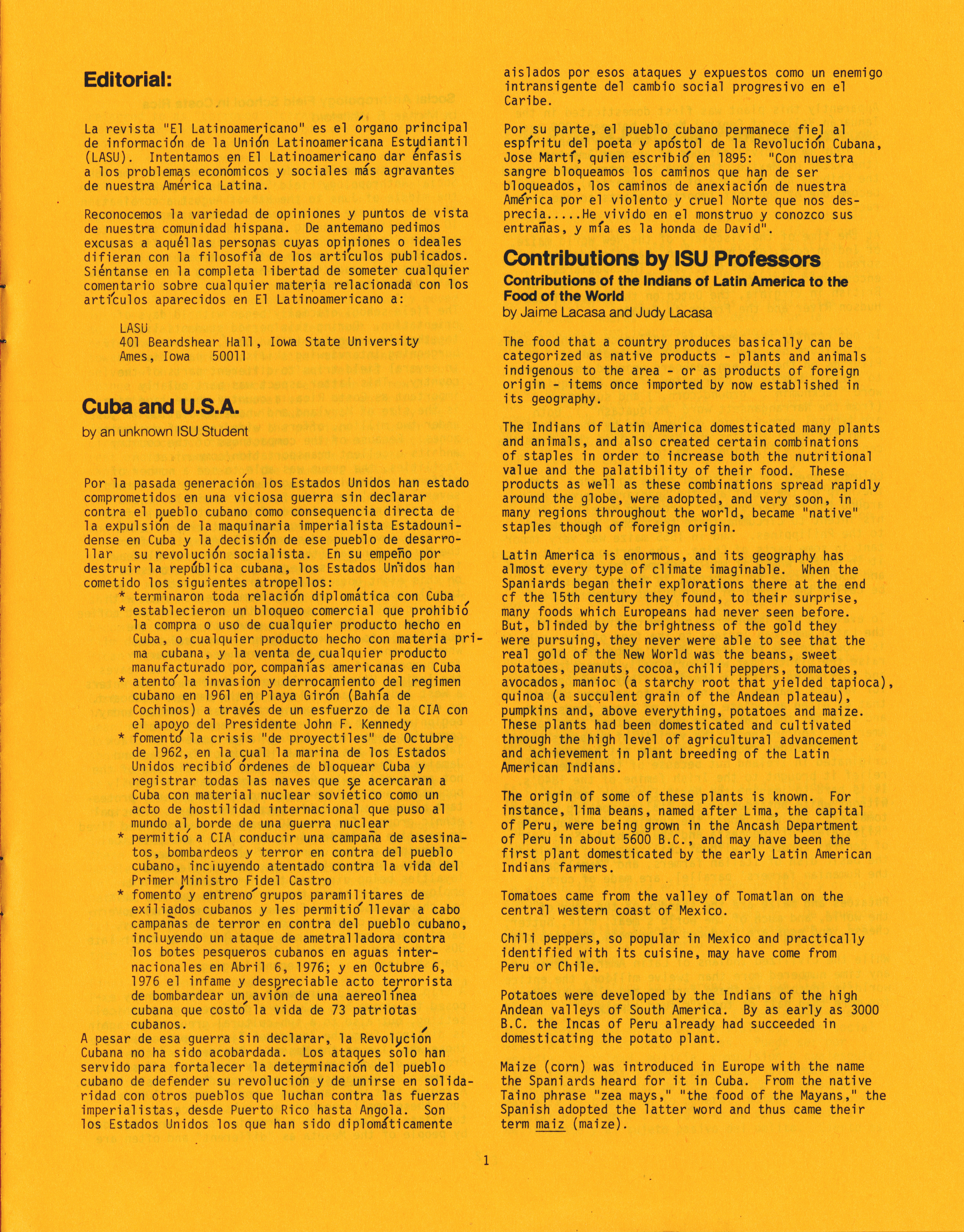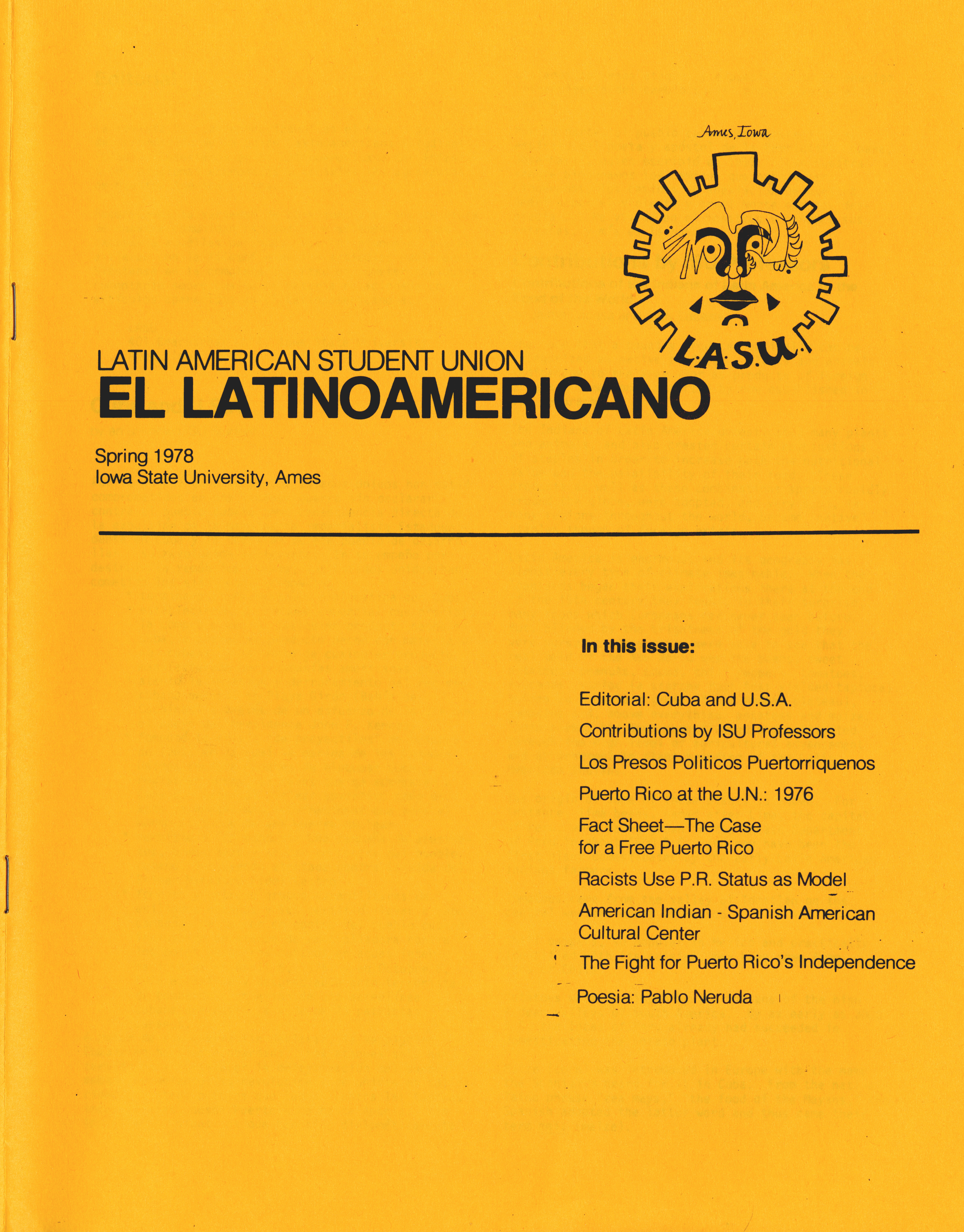 - "El Latinoamericano--Latin American Student Union newsletter, Spring 1978", Iowa State University Multicultural Student Organizations Collection, Iowa State University Library Digital Collections