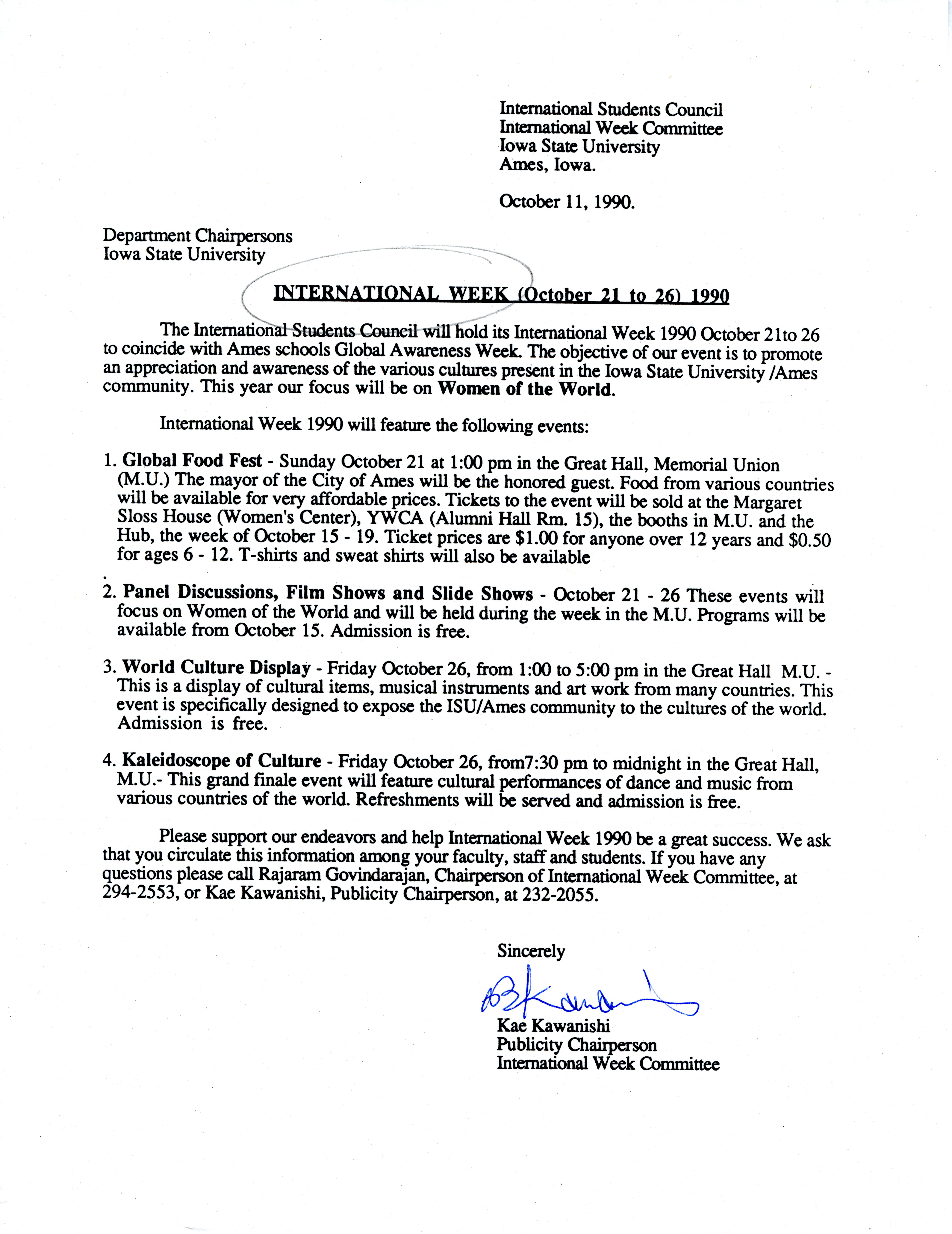 - Kae Kawanishi memorandum to department chairpersons regarding International Week, October 11, 1990