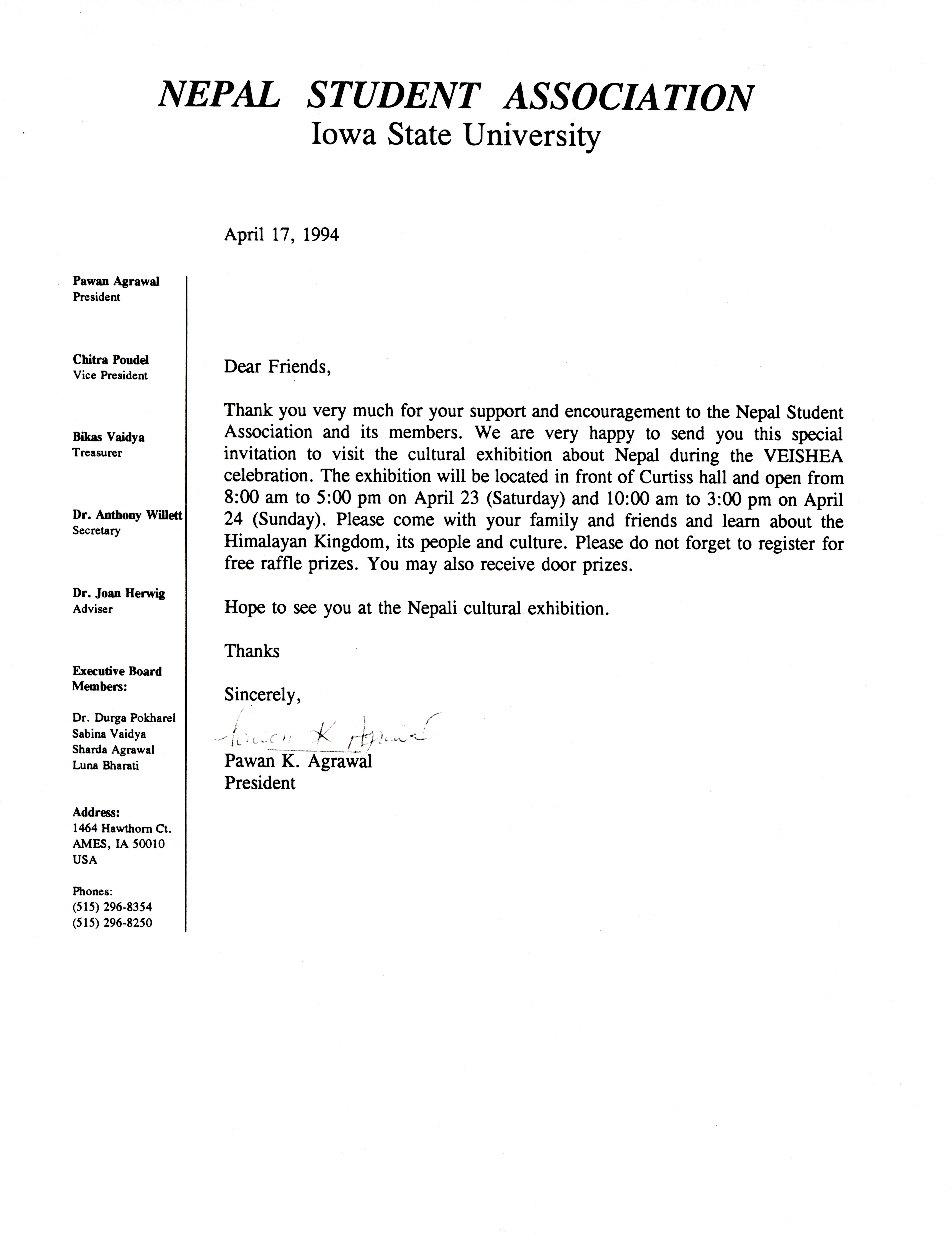 - Pawan K. Agrawal letter to friends of the Nepal Student Association, April 17, 1994
