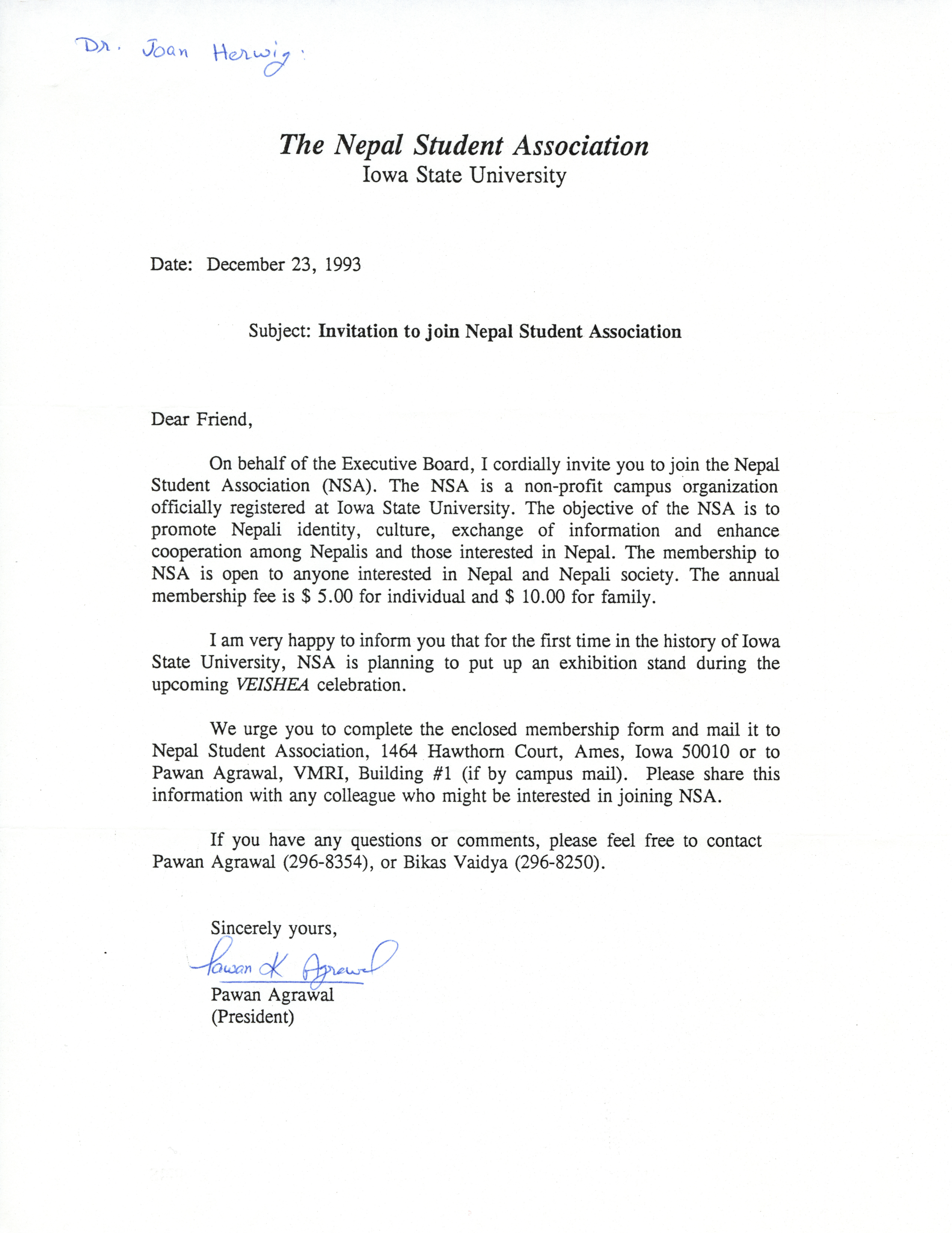 - Pawan Agrawal letter to friends of the Nepal Student Association, December 23, 1993