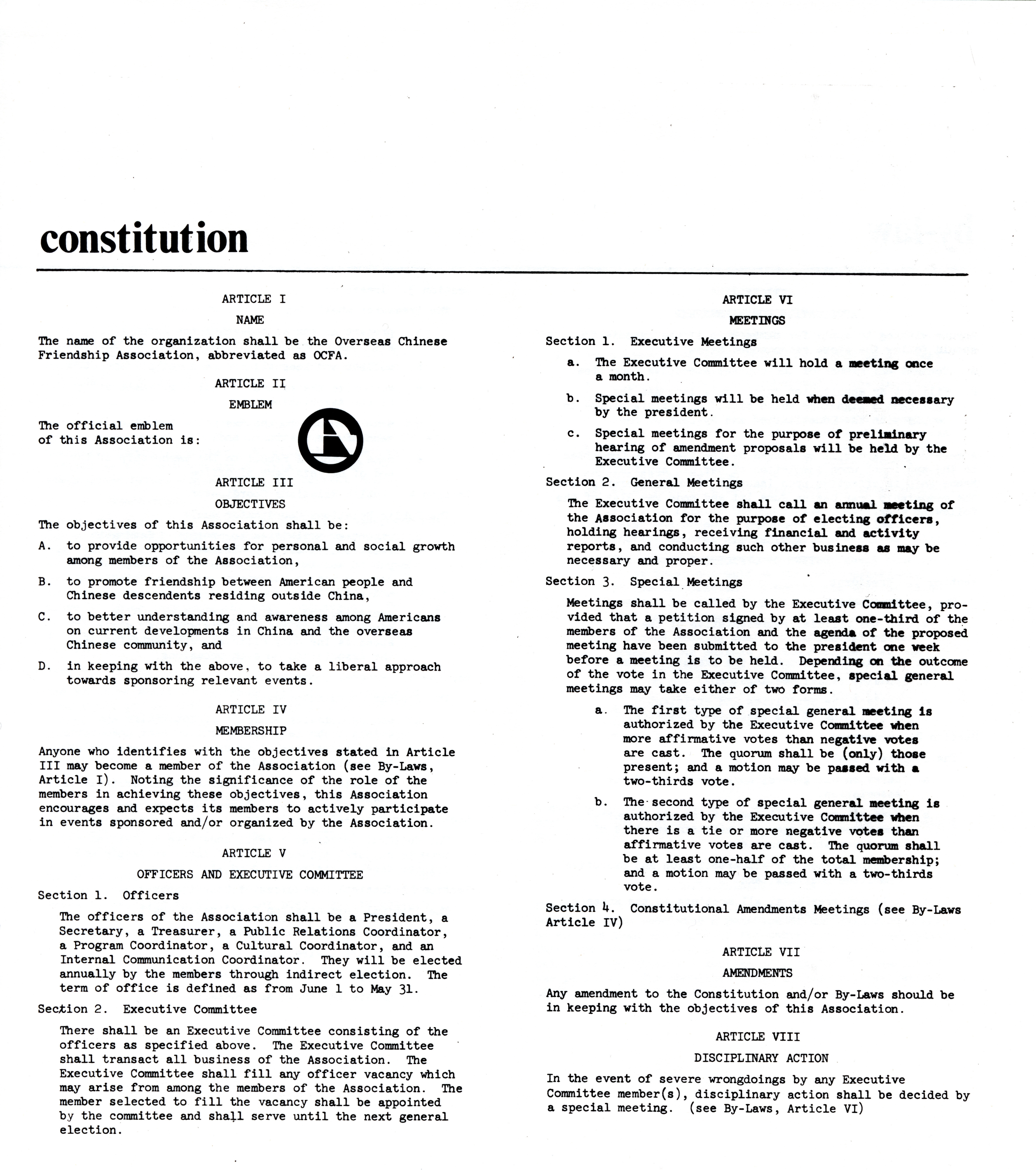 - Constitution laying out the purpose, membership, and executive board of the organization.